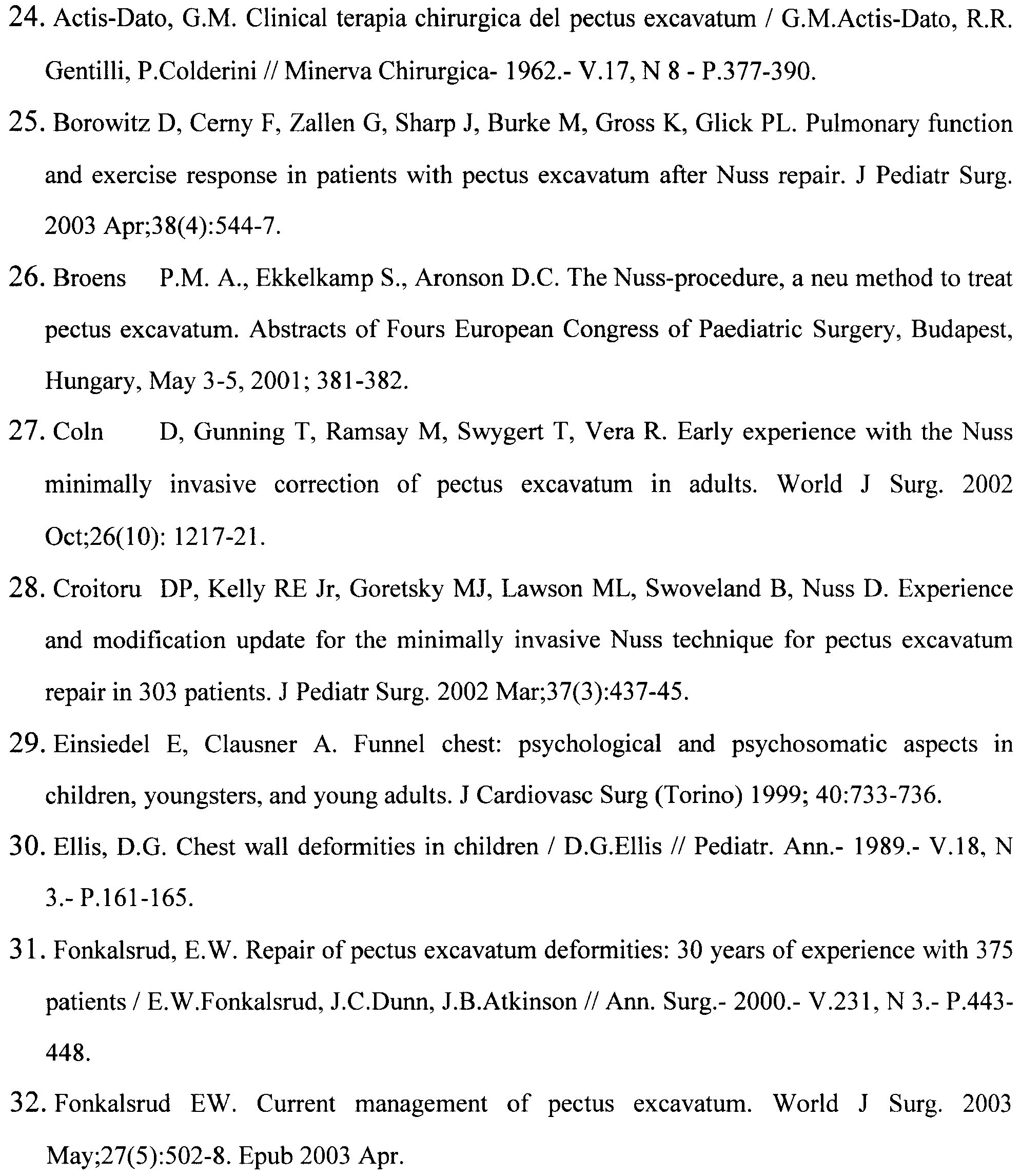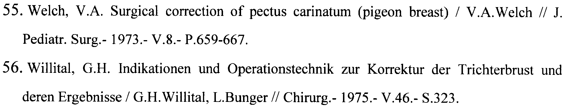 5. Васильев, Г.С.Показания к операции и методу хирургической коррекции воронкообразной деформации грудной клетки у детей / Г.С. Васильев, С.Рудаков, В.А.Веровский // Вестн. РАМН. - 1994. - №4. - С.3-5.