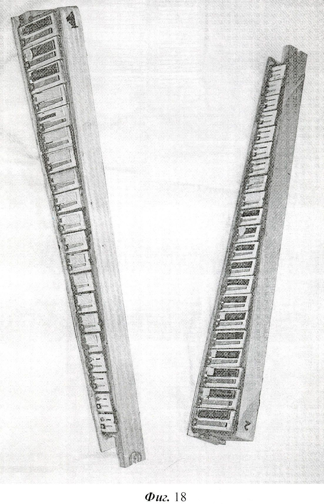 Группа изобретений относится к области музыкальных инструментов (далее - МИ), более конкретно, - к конструкции язычкового звукообразующего устройства (далее - ЗОУ). служащего для образования звука определенной тональности при прохождении воздушного потока через проемы голосовых планок с колеблющимися язычками и резонирования образованных звуков, а также к конструкции язычковых МИ. в которых данное ЗОУ может быть установлено. Группа изобретений может быть использована в производстве язычковых МИ всех разновидностей, например баянов, аккордеонов, гармоней и т.п. В наиболее распространенных МИ указанного типа многие годы традиционно используется конструкция ЗОУ, включающая корпус с парами полых камер, расположенных одна за другой и образованных вертикально установленным вдоль оси корпуса общим средником с поперечными перегородками, в простенках которых закреплены голосовые планки с проемными клапанами. Сверху корпус прикрыт бруском (Розенфельд Н.Г., Иванов М.Д. Гармони, баяны, аккордеоны. - М.: Легкая индустрия. 1974, см. www.accordion-nt.spb.ru. фиг.2). Однако производство таких ЗОУ является сложным и трудоемким процессом, требующим значительного расхода материала. При этом масса и объем звуковых камер велики, а следовательно, значительны и масса и объем МИ в целом. Повышенный расход воздуха при игре из-за негерметичности проемных клапанов и существенное время их срабатывания ограничивают исполнительские возможности. Основной причиной этого является применение для звукообразования голосовых планок с язычками. установленными над проемами голосовой планки с противоположных сторон для ее работы в реверсивно движущемся потоке воздуха. При этом отверстие проема голосовой планки, находящееся на противоположной язычку стороне голосовой планки, закрыто проемным клапаном, обычно, лепесткового типа, изготовленным из кожи или других эластичных материалов, который препятствует прохождению воздуха через голосовую планку при движении потока воздуха со стороны, противоположной язычку. Проемные клапаны часто выходят из строя (обвисают, заминаются и изнашиваются), что приводит к неплотному перекрытию проемов, повышая расход воздуха при игре. искажая звук, а замена проемных клапанов требует сложного ремонта, связанного с разборкой МИ. Кроме того. при такой конструкции ЗОУ для создания каждого звука требуется голосовая планка с, по меньшей мере, двумя язычками, работающими попеременно при реверсировании воздушного потока, например при растяжении и сжатии меха язычкового МИ. Известно также ЗОУ, содержащее корпус, который состоит из двух продольных боковин и поперечных перегородок между ними, сопряженных боковыми гранями с боковинами (Патент России RU 2378716 С1). Каждая поперечная перегородка имеет треугольную форму с расширенной частью, ориентированной в сторону деки. Боковые грани поперечных перегородок сопряжены с боковинами неподвижно. При этом образован ряд звуковых отсеков, а каждый отсек разделен на две камеры - входную и невходную. Для этого вдоль осевой линии внутри отсеков между поперечными перегородками вертикально установлена с возможностью разъема одна кусковая голосовая планка в каждом отсеке или цельная голосовая планка на весь ряд отсеков с определенным набором язычков в каждом отсеке. Причем каждая сторона голосовой пл