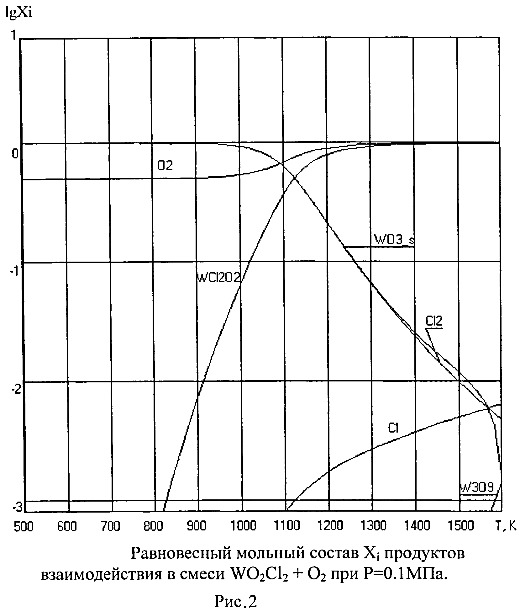 Изобретение может быть использовано в химической промышленности. Способ получения хлора из хлороводорода с помощью вольфрамсодержащих соединений включает хлорирование триоксида вольфрама хлороводородом при температуре более 1400 К. Образующийся диоксидихлорид вольфрама выделяют из газовой смеси продуктов реакции и окисляют кислородом при температуре менее 900 К для получения хлора. Триоксид вольфрама возвращают на стадию хлорирования. Изобретение позволяет получать хлор из хлороводорода с высокой удельной производительностью без катализаторов. 2 ил., 2 пр.