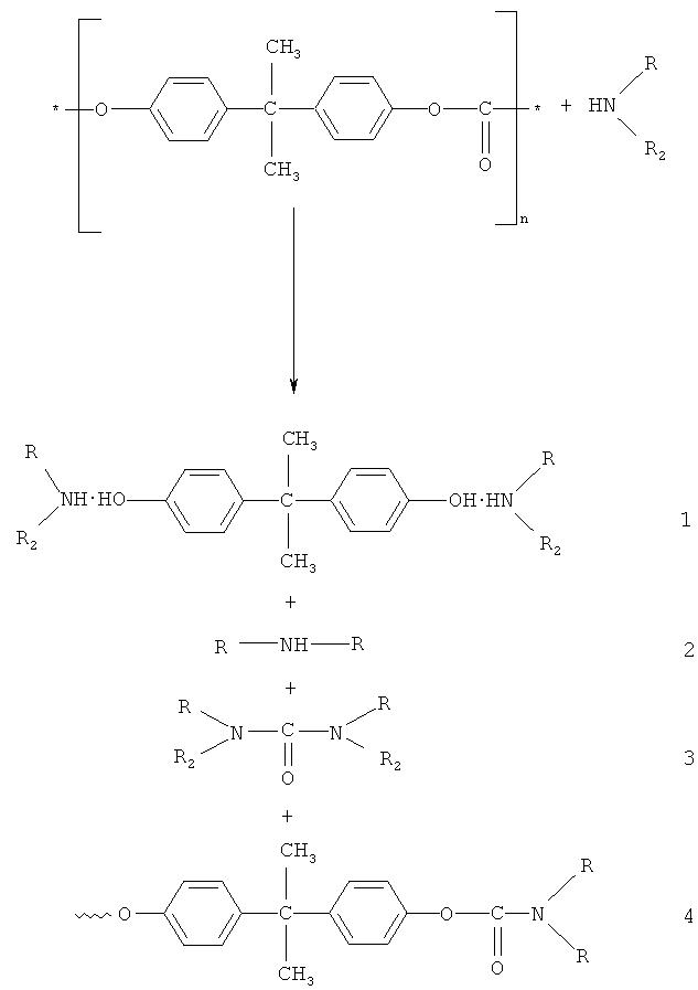 Способ химической утилизации отходов поликарбонатов путем их взаимодействия с аминами, отличающийся тем, что в качестве аминов берут алифатические амины, реакцию ведут при температуре от 25 до 170°C в течение 25-140 мин при массовом соотношении алифатический амин : поликарбонат не менее 0,9:1, в образовавшийся продукт аминолиза добавляют соляную кислоту до достижения pH не более 3, из образовавшейся суспензии выделяют осадок дифенилолпропана, а маточный раствор подвергают реакции с фосфористой кислотой и формалином, причем формалин представляет собой водометанольный раствор формальдегида, при температуре не менее 90°C в течение не менее 2 ч при соотношении на 1 моль аминогрупп 1-2 моля фосфористой кислоты и 1-2 моля формальдегида, с последующей нейтрализацией водным раствором аммиака.