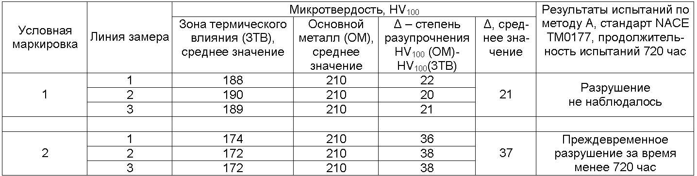 Испытания металла сварных швов на стойкость к СКРН по методу А стандарт NACE TM0177 показали: образцы с условной маркировкой 2, характеризующиеся достаточно большой величиной степени разупрочнения в ЗТВ, преждевременно разрушились за время менее 720 часов. Сварные швы с условной маркировкой 1, у которых степень разупрочнения в ЗТВ значительно меньше, характеризуются достаточной стойкостью к СКРН.