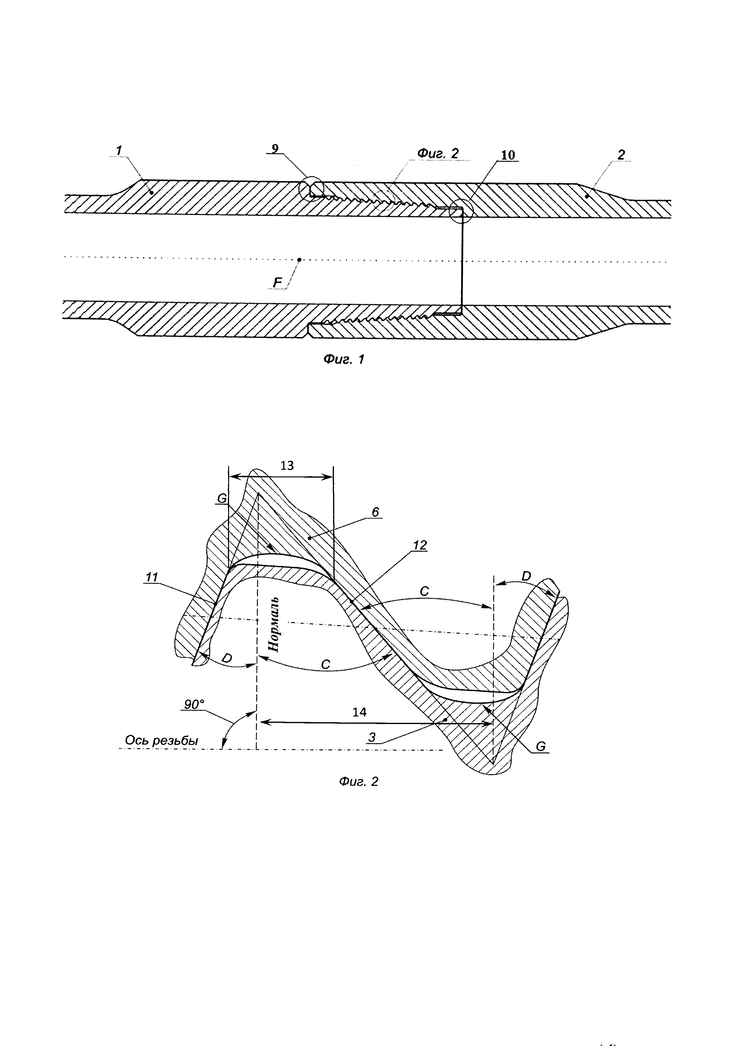где а - большая полуось эллипса, b - малая полуось эллипса. Большая полуось эллипса параллельна оси конусности резьбы, а эллипс является касательным к опорной и закладной граням профиля витка резьбы. Вершина профиля витка резьбы срезана по отношению к исходному треугольнику резьбы, причем ширина среза составляет 2,3 мм. Соединение содержит внутренний и наружный упорные узлы, при этом упорные торцы ниппеля и муфты выполнены равной длины. Достигается возможность передачи соединением высокого крутящего момента, повышение усталостной прочности и износостойкости соединения при его многократном свинчивании-развинчивании. 1 з.п. ф-лы, 3 ил.