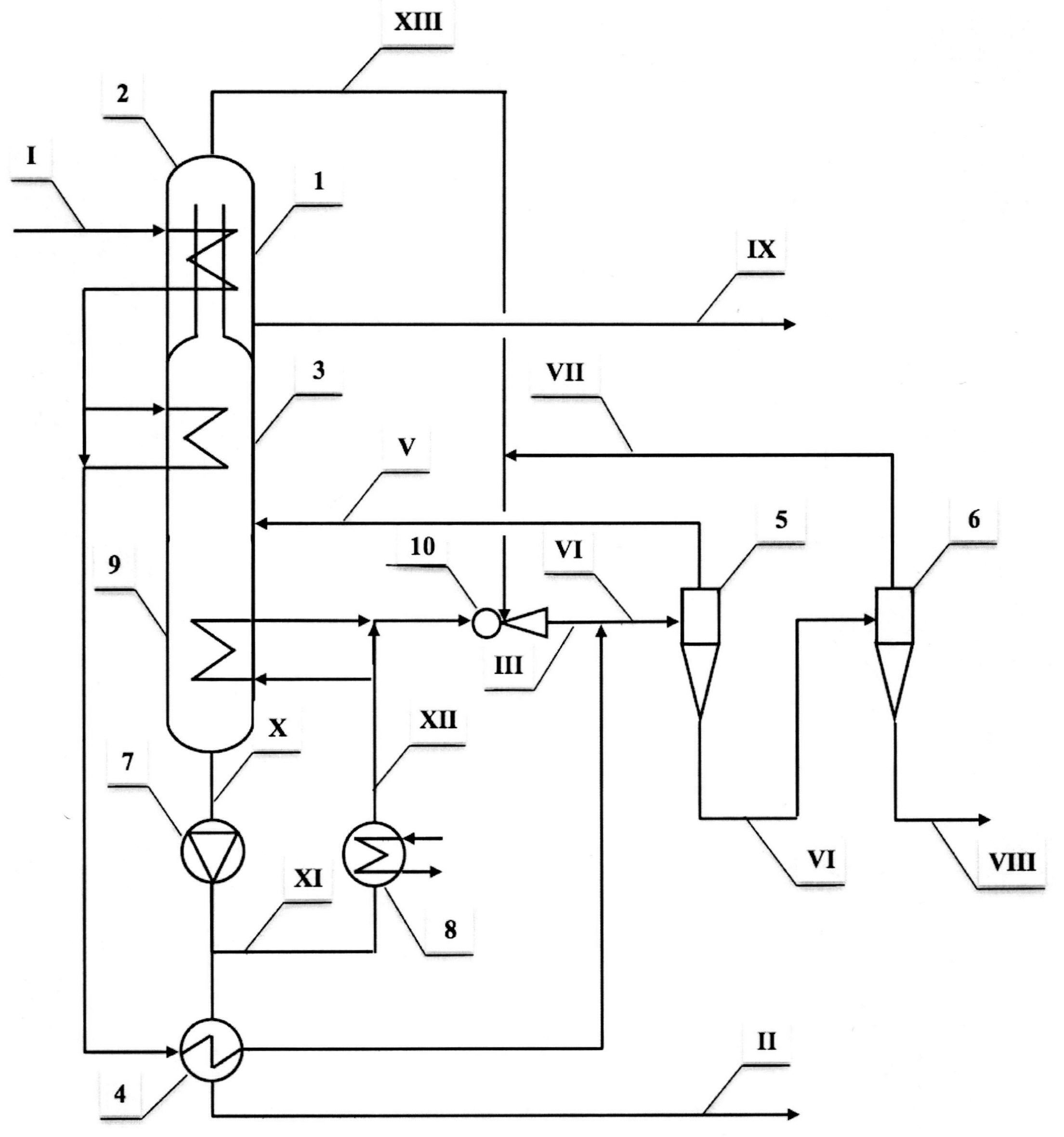 Пониженное давление во фракционирующем аппарате 2 и гидроциклонном сепараторе второй ступени 6 поддерживают за счет отсоса смеси несконденсированных паров (XIII) из фракционирующего аппарата 2 и водометанольных паров (VII) из гидроциклонного сепаратора второй ступени 6 за счет дросселирования нагретого водяного пара (XII) в пароструйном эжекторе 10. Запорно-регулирующая на схеме арматура не показана.