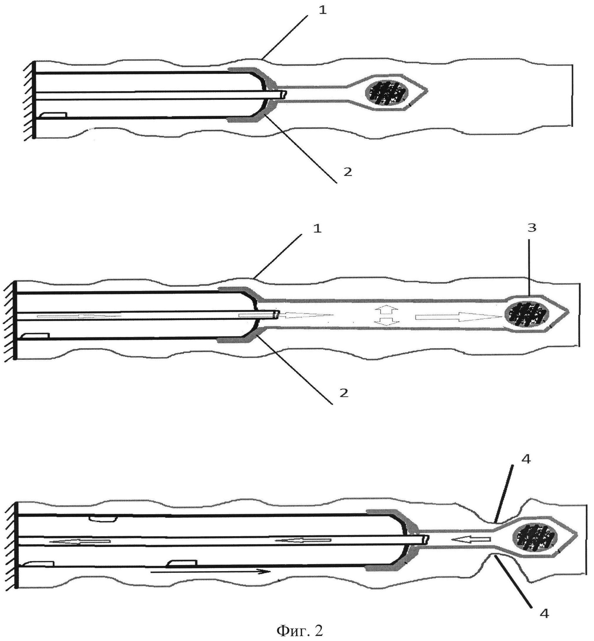 На фиг.1 дана схема конструкции дистального отдела предложенного устройства, где 1 - внешняя трубка, 2 - внутренняя трубка (воздуховод), 3 - резиновый баллон, 4 - олива. На фиг.2 изображена схема поступательного движения устройства в просвете кишки, где А - баллон сдут, Б - баллон надут, В - баллон вновь сдут, подтянут. На фиг.3 - устройство в просвете кишки, баллон сдут, на фиг.4 - устройство в просвете кишки, баллон раздут, олива переместилась вперед на 6-7 см; на фиг.5 - баллон раздут, олива фиксирована в новом положении; на фиг.6 - баллон вновь сдут при фиксированной оливе, устройство «подтянулось» вперед по ходу кишки.