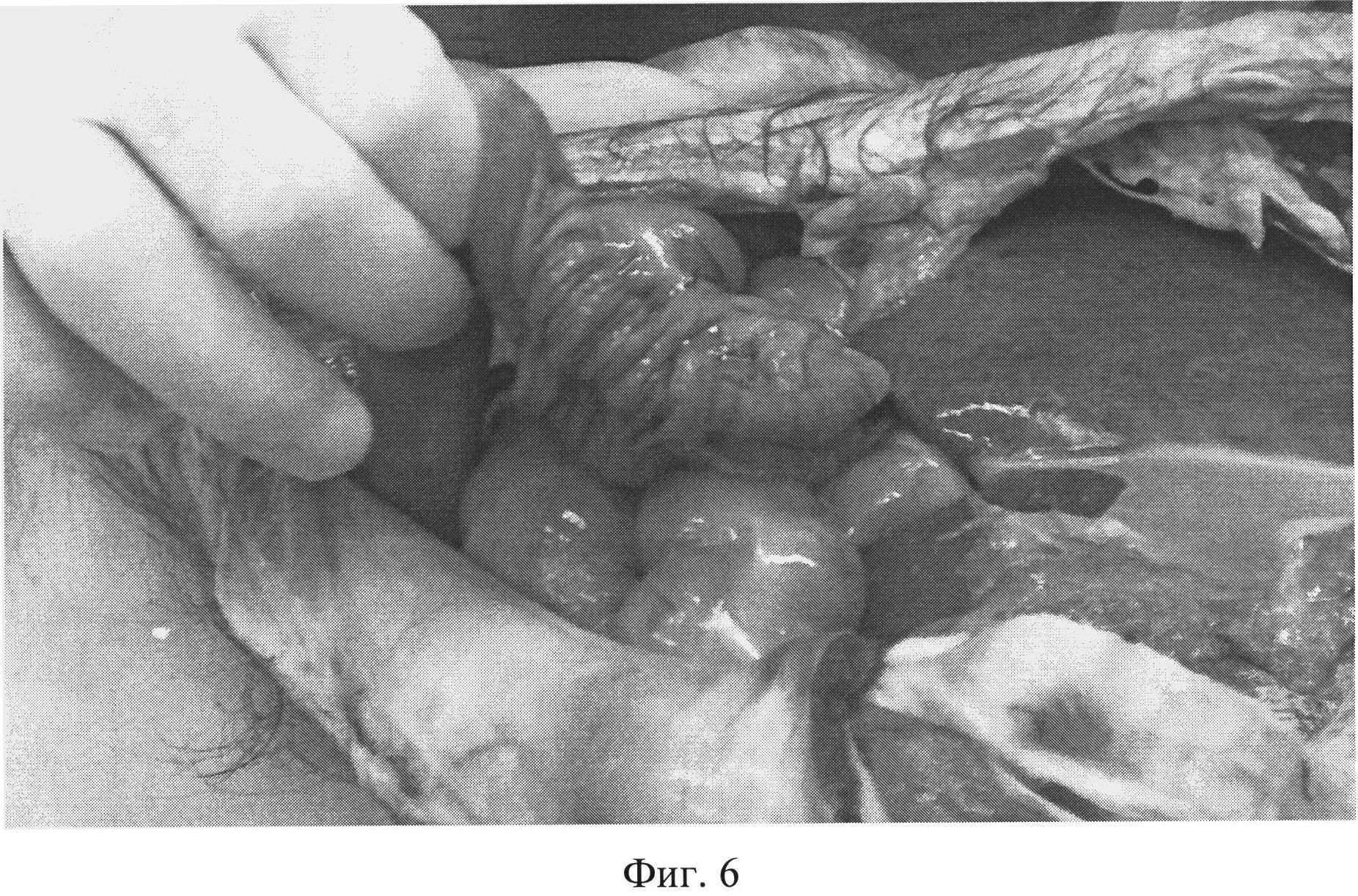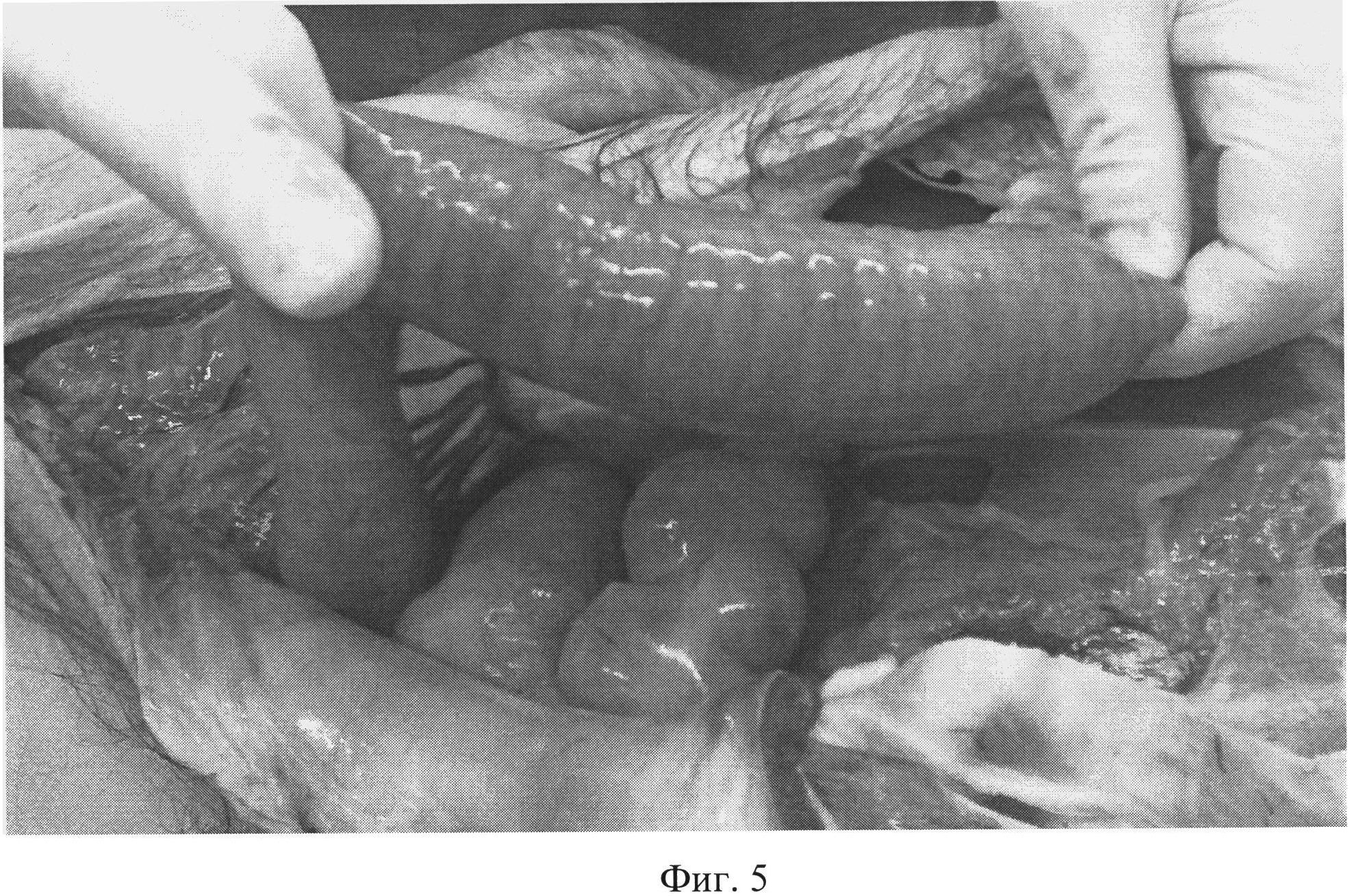 Устройство состоит из внешней эластичной трубки диаметром 12 мм, длиной 280-300 см с отверстиями на каудальном конце и включает в себя приспособление для активного нетравматичного продвижения в просвете кишки: в просвет внешней трубки на всем протяжении введена дополнительная трубка диаметром 3 мм, к каудальному концу которой, выведенному наружу через каудальный конец внешней трубки, прикреплен резиновый баллон продольной формы, на конце которого имеется плотная подвижная относительно внешней трубки олива (фиг.1). В сдутом состоянии баллон имеет размеры 1×5 см, а в раздутом его диаметр и длина увеличиваются до 2 и 12 см соответственно (фиг.2). Поступательное движение оливы в просвете кишки осуществляется за счет раздувания и увеличения длины баллона, а после продвижения терминальной части баллона и фиксации ее удерживанием за оливу - за счет эластического сокращения баллона после удаления из него воздуха (фиг.3-6).