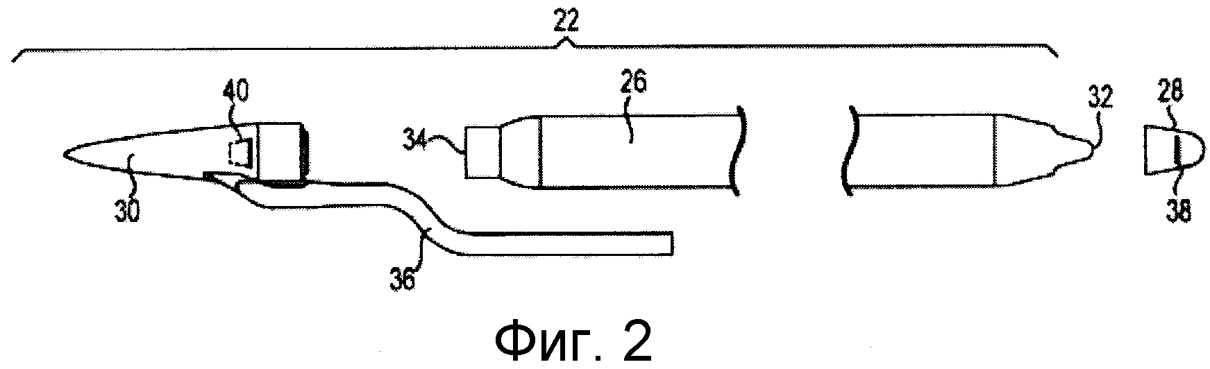 Фигура 2 иллюстрирует покомпонентный вид сбоку агрегата 22 протеза полового члена. Надувной цилиндр 26, как правило, предусматривается в виде продолговатого цилиндра, который закрыт на дальнем конце 32 и закрыт на ближнем конце 34 тогда, когда прикреплен колпачок 30 ближнего конца. При такой сборке цилиндр 26 является герметизированным и сконфигурированным для надувания при введении в трубку 36 текучей среды (например, как правило, солевого раствора или газа).