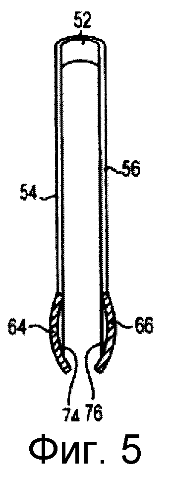Фигура 5 иллюстрирует вид в поперечном разрезе инструмента 24, полученный вдоль линии 5-5 по фигуре 4, и иллюстрирует один из вариантов осуществления изобретения, где каждая из поверхностей - внутренняя поверхность 74 дальней части рычага 64 и внутренняя поверхность 76 дальней части рычага 66 - является изогнутой так, чтобы она определяла часть дуги. В ходе вставки агрегата 22 (фигура 2) цилиндр сдувается, создавая «лепешкообразный» сплющенный цилиндр. Прямые плоские внутренние поверхности рычагов 64, 66 сочленяются со сплющенными стенками цилиндра 26. Колпачок 28 прикрепляется к цилиндру 26 и, как правило, сохраняет свою коническую форму. Для этого внутренние поверхности 74, 76 рычагов 64, 66 изгибаются, дополняя наружную поверхность колпачка 28 (фигура 2), что позволяет плоской ближней части рычагов 64, 66 обрамлять сплющенный цилиндр 26, а вогнутым внутренним поверхностям 74, 76 рычагов 64, 66 - обрамлять колпачок 28 в ходе вставки агрегата 22 (фигура 2).