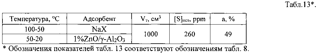 Изобретение относится к нефтеперерабатывающей промышленности, в частности к способу удаления сераорганических соединений из жидкого углеводородного топлива. Повышение требований к качеству моторных топлив, в частности к содержанию серы, способствовало развитию интереса к нетрадиционным негидрогенизационным методам сероочистки. Селективная адсорбция, проводимая в мягких условиях без участия молекулярного водорода с использованием традиционных хорошо изученных материалов, представляется весьма перспективным методом. Промышленной реализации процесса препятствует быстрая выработка адсорбционной емкости, ограничивающая производительность процесса. В некоторых опубликованных работах описаны адсорбенты, обладающие большой емкостью, но, как правило, достижение высокой эффективности с их использованием требует довольно жестких условий работы: высокой температуры и даже повышенного давления. При этом весьма вероятно протекание побочных реакций олигомеризации, поликонденсации непредельных соединений топливных фракций, осложняющих регенерацию адсорбента. Известен способ (WO 2005007780, 2005) адсорбционного удаления сераорганических соединений из углеводородных топлив при температуре 300-600°C и давлении 0,79-3,5 МПа с использованием в качестве адсорбента оксида переходного металла, например, оксида молибдена. Недостатком способа является проведение процесса при высоких температуре и давлении. Известен также способ удаления сераорганических соединений из крекинг-бензина и дизельного топлива (пат. РФ 2242277, 2004) при жестких условиях: температуре 200-480°C и повышенном давлении. В способе используют сорбенты, полученные пропиткой основы сорбентов, содержащей оксид цинка, вспученный перлит и оксид алюминия, металлом-промотором, таким как никель и/или кобальт, с последующим восстановлением валентности металла-промотора молекулярным водородом. Недостатком способа также, как и в WO 2005007780 является использование в процессе высоких температур и повышенного давления. Другим недостатком является использование в описанном способе молекулярного водорода. Существуют другие способы адсорбционного удаления сераорганических соединений из углеводородных топлив (крекинг-бензина и дизельного топлива), в которых адсорбционный материал в качестве основного компонента содержит цинк (пат. РФ 2336126, 2006, и пат. РФ 2369630, 2008), но для этих изобретений характерны такие недостатки, как жесткие условия процесса (высокие температура и давление), а также использование молекулярного водорода. Другой способ адсорбционного удаления сераорганических соединений из керосина (US 6992041, 2006) предлагает использовать в качестве сорбентов материал, содержащий никель, оксиды никеля, цинка и алюминия. Способ реализуется при температуре от 200 до 400°C и давлении до 2 МПа. Основными недостатками способа являются агрессивные условия процесса (повышенная температура), а также необходимость в использовании молекулярного водорода для активационной обработки адсорбента. Наиболее близким к заявляемому является способ адсорбционного удаления сераорганических соединений (РФ 2517705, 2014), который заключается в том, что топливо при температуре, выбранной в интервале от 0 до 100°C, и атмосферном давлении, пропускают через неподвижный адсорбент с относительной объемной скоростью по
