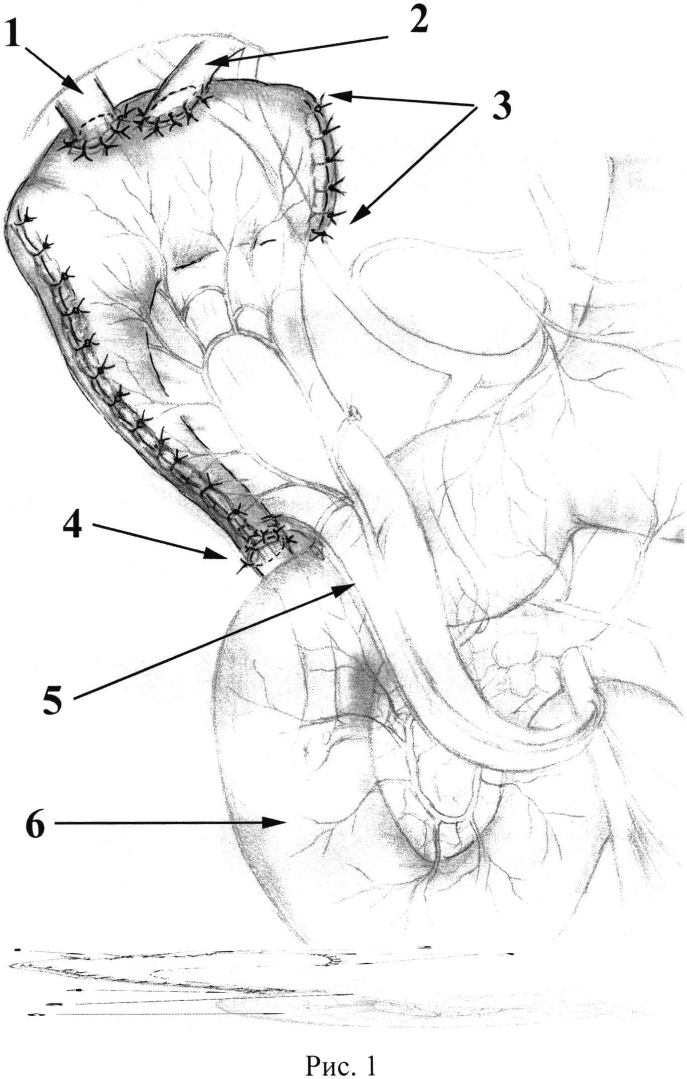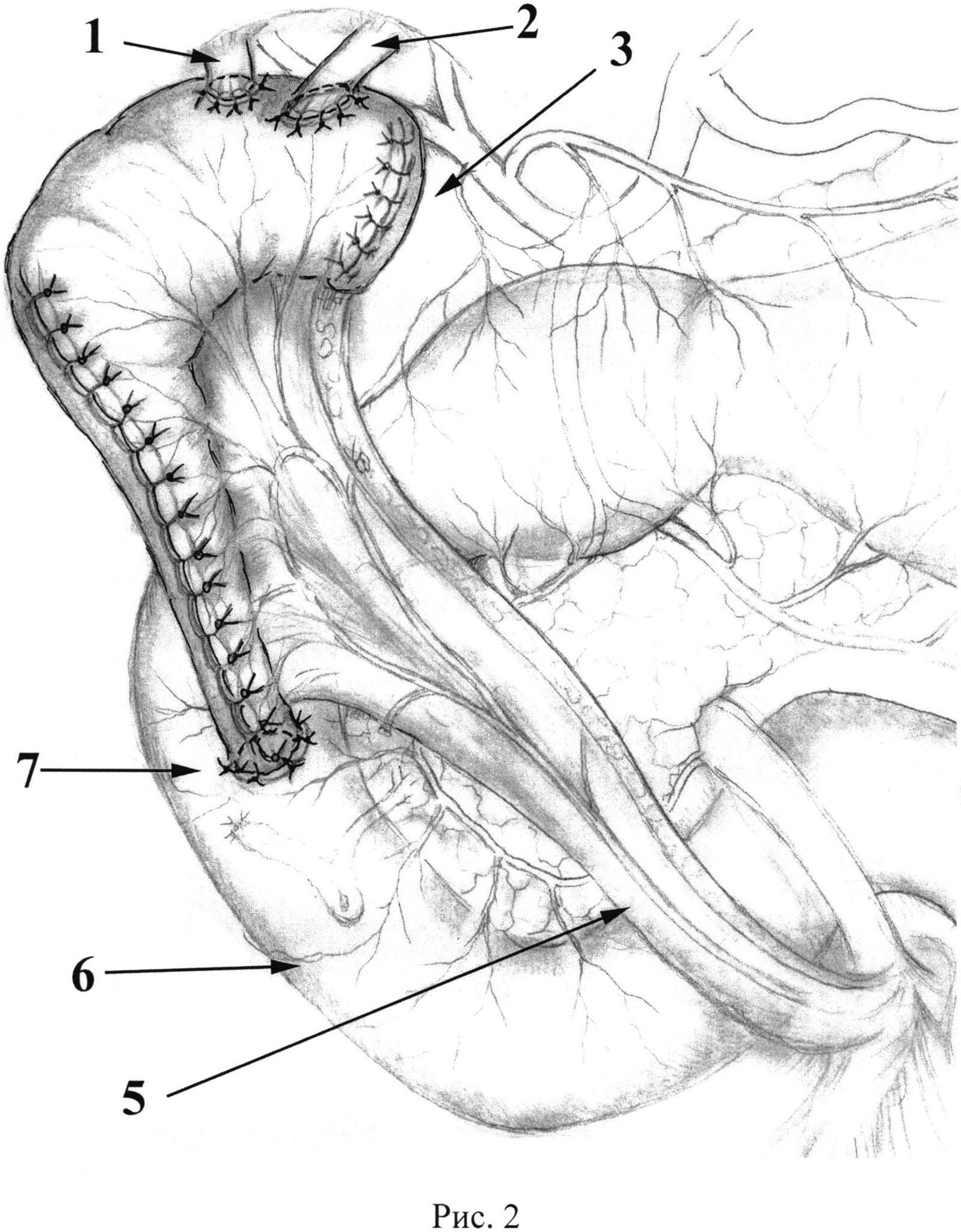 Изобретение относится к медицине, а именно к хирургии, и может быть использовано для хирургического лечения заболеваний и повреждений внепеченочных желчных путей. Проблема восстановления желчеоттока из печени в кишечник при доброкачественных и злокачественных поражениях внепеченочных желчных протоков продолжает оставаться актуальной. Несмотря на то что большинство хирургов используют для этого наложение гепатикоеюноанастомоза на отключенной по Ру петле кишки, по мнению многих авторов (Э.И. Гальперин и соавт., 2003, А.А. Шалимов и соавт., 1993, N. Hashimoto et al., 2005, H.P. Heistermann et al., 2006, B. Jablonska, 2012), наиболее физиологичным вмешательством является использование восстановительных и реконструктивных операций с организацией поступления желчи в двенадцатиперстную кишку. Однако подавляющее большинство предложенных вариантов пластического замещения внепеченочных желчных протоков не отвечают всем требованиям, предъявляемым к трансплантату желчных путей, а именно трансплантат должен иметь полноценную слизистую оболочку, индифферентную к постоянному воздействию желчи; он должен перистальтировать, тем самым направлять ток желчи в ДПК и препятствовать рефлюксу дуоденального содержимого в желчное дерево. И, наконец, по длине и диаметру трансплантат должен быть близким к размерам общего желчного и печеночного протока Наибольшие сложности для использования пластических операций представляют случаи высоких стриктур, когда анастомоз приходится накладывать глубоко в воротах печени, а часто для анастомоза имеются не один, а два и более долевых печеночных протоков. Накопленный в нашей клинике опыт по использованию наиболее распространенных в настоящее время желчеотводящих анастомозов, с выключенной по Ру петлей тонкой кишки, не только нефизиологичен, но и не лишен таких недостатков, как несостоятельность соустья, его быстрое рубцевание, если применяются традиционные технологии его формирования, не предусматривающие прецизионную технику шва и использование специального шовного материала. Кроме того, среди недостатков гепатико-энтероанастомоза следует отметить рефлюкс кишечного содержимого в желчные протоки даже при достаточно длинной отключенной по Ру петле кишки и, как результат, высокую частоту развития холангита и постепенное рубцевание анастомоза. Таким образом, разработка новых способов пластики внепеченочных желчных протоков является актуальной задачей хирургии. В качестве аналогов взяты следующие способы оперативного лечения: 1. Гепатикоеюностомия по А.А. Шалимову (Шалимов Α.Α., Шалимов С.А., Ничитайло М.Е., Доманский Б.В. "Хирургия печени и желчевыводящих путей", Киев, "Здоровья", 1993, стр. 473-475). После иссечения рубцовых тканей и освобождения дистального конца общего печеночного протока производят его мобилизацию в проксимальном направлении. Петлю тощей кишки, необходимую для анастомоза, выключают по Ру или Шалимову, подводят к задней поверхности протока так, чтобы последний ложился поперек кишки по длине всей своей свободной части. При малом диаметре протока (5 мм и менее) по задней поверхности его делают продольный разрез длиной 5-8 мм. Непосредственно перед культей протока продольно вскрывают просвет тощей кишки в соответствии с диаметром протока и разрезом его. Отдельными 3-4 швами с интервалом между ними 1,5 мм нитью из