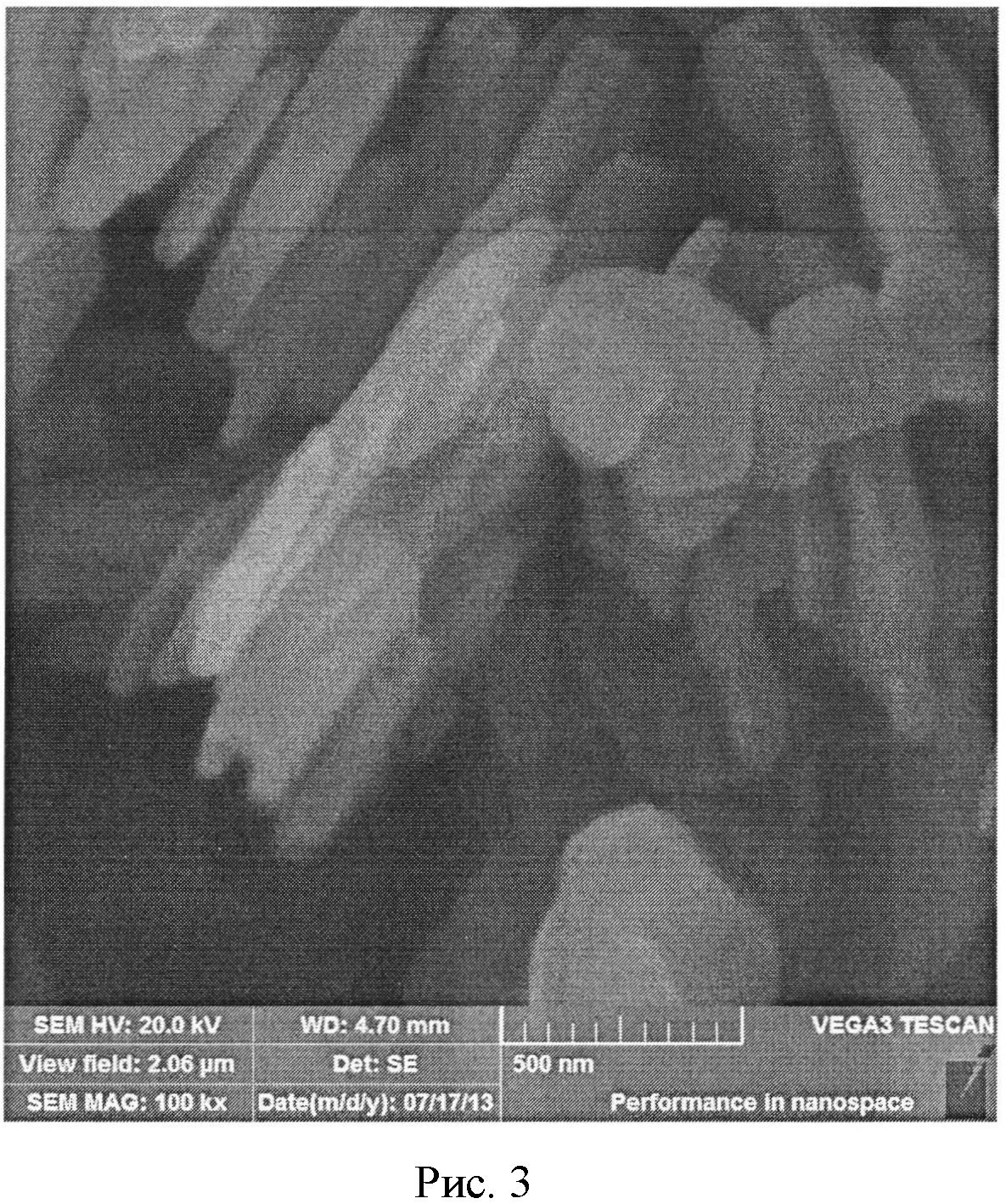В реактор, снабженный рубашкой, лопастной мешалкой и термопарой, загружают при перемешивании в течение 30 мин одновременно 1,036 м3 раствора гидроксида калия с массовой долей 18,3% и 0,421 м3 раствора бишофита с массовой долей хлорида магния 33,5% и массовой долей железа 0,0006%. Мольное отношение ионов ОН-:Mg++ составляет 2,006:1. Реакционную массу при перемешивании нагревают до 45-55°C и выдерживают 1 ч. Затем реакционную массу перегружают в автоклав, снабженный двухъярусной лопастной мешалкой, рубашкой и двумя барботерами с отверстиями круглого сечения, для подачи перегретого пара, опущенными на 2/3 высоты ниже уровня реакционной массы и расположенными противоположно. Реакционную массу при перемешивании нагревают и выдерживают при температуре 180-185°C при периодической импульсной подаче острого пара с расходом 1,5-2,5 м3/ч, температурой 190°C и давлением 1,3 МПа в течение 2 ч. Полученную суспензию фильтруют и промывают на пресс-фильтре обессоленной водой, сушат в роторно-вихревой мельнице. Характеристики полученного гидроксида магния представлены в таблице, форма и размер первичных частиц - и на рисунках 3, 4.