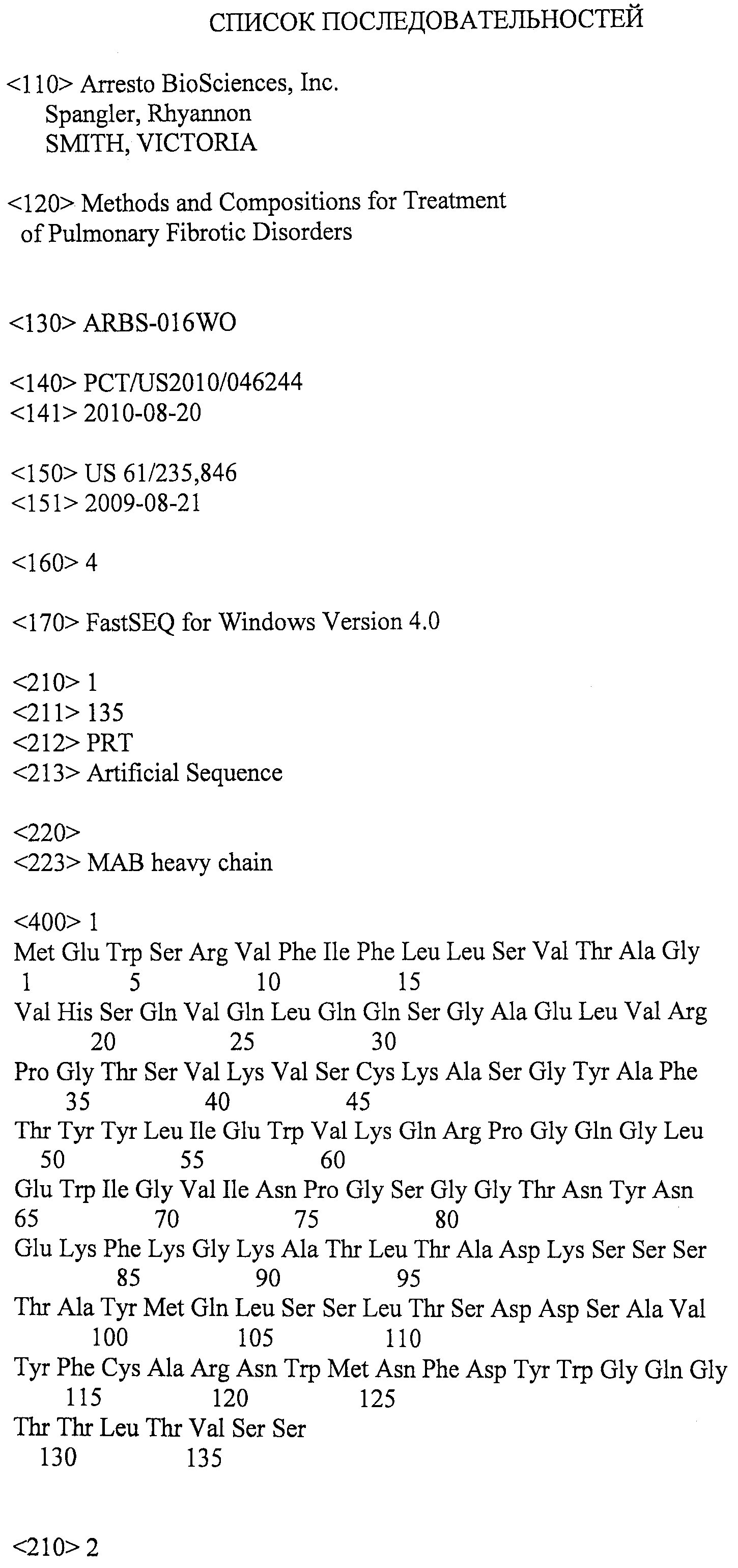 1. Способ предотвращения, лечения или реверсии симптомов фиброзного заболевания легких у субъекта, включающий введение субъекту изолированного антитела против лизилоксидазоподобного белка 2 (LOXL2), которое специфически связывается с белком LOXL2, тем самым предотвращая, излечивая или вызывая реверсию симптомов фиброзного заболевания легких, 2. Способ предотвращения, лечения или реверсии симптомов фиброзного заболевания легких у субъекта, включающий введение субъекту изолированного антитела против лизилоксидазоподобного белка 2 (LOXL2), которое ингибирует активность белка LOXL2, тем самым предотвращая, излечивая или вызывая реверсию симптомов фиброзного заболевания легких, 3. Способ по п.1 или 2, в котором антитело специфически связывается с SRCR4 доменом белка LOXL2. 4. Способ по п.1 или 2, в котором изолированное анти-LOXL2 антитело содержит: 5. Способ по п.1 или 2, в котором изолированное анти-LOXL2 антитело гуманизировано. 6. Способ по п.1, в котором изолированное анти-LOXL2 антитело содержит тяжелую цепь, содержащую аминокислотную последовательность, приведенную в SEQ ID NO: 3, и легкую цепь, содержащую аминокислотную последовательность, приведенную в SEQ ID NO: 4. 7. Способ по п.1 или 2, в котором фиброзное заболевание легких выбрано из группы, состоящей из интерсцитиальной пневмонии, синдрома острого респираторного дистресса (ARDS) и идиопатического фиброза легких (IPF). 8. Способ по п.7, в котором фиброзное заболевание легких - это IPF. 9. Фармацевтическая композиция для предотвращения, лечения или реверсии симптомов фиброзного заболевания легких у субъекта, причем фармацевтическая композиция содержит изолированное анти-LOXL2 антитело и фармацевтически приемлемый наполнитель,
