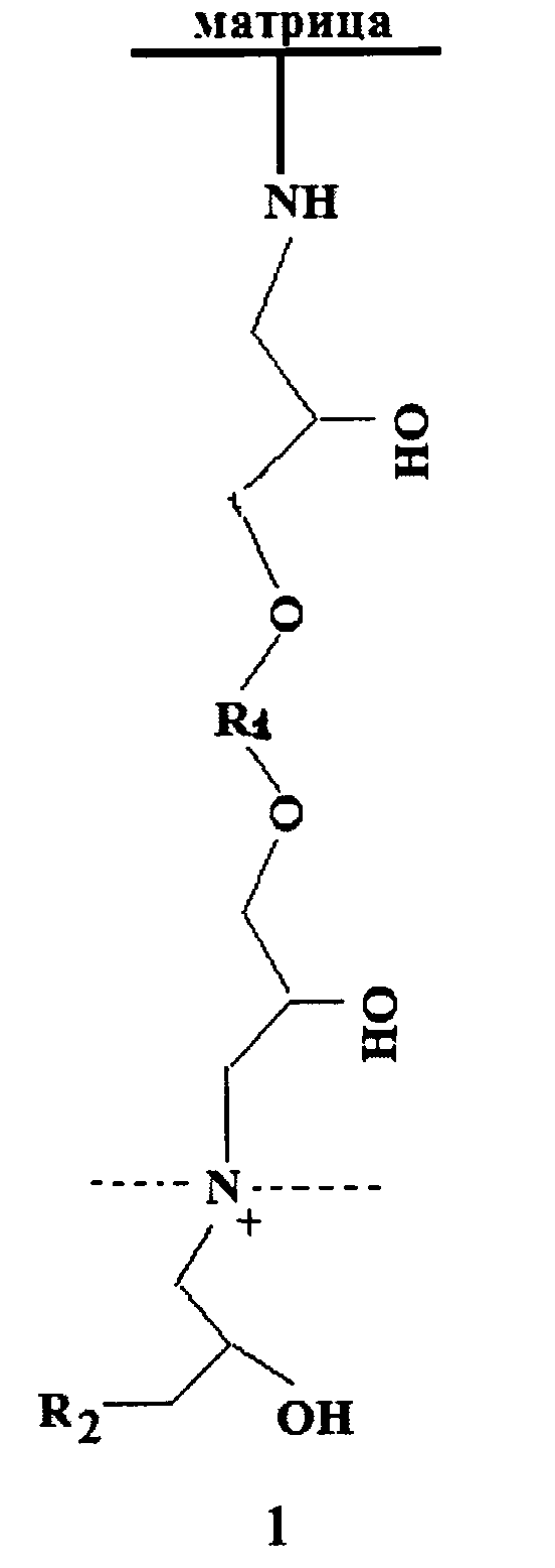 Изобретение относится к новому анионообменному материалу на основе полимеров либо неорганических оксидов, который может быть использован в ионной хроматографии в качестве сорбента для одновременного определения органических и неорганических анионов с повышенной эффективностью, позволяющий произвести селективное разделение смеси свыше десяти анионов, в частности, для анализа воды, почвы и других объектов на содержание анионов. Для анионообменных сорбентов удерживание функциональных ионогенных групп на матрице может осуществляться посредством различных механизмов: электростатического или гидрофобного взаимодействия, с использованием адгезионного прикрепления («приклеивания»). В известных из литературы способах модифицирования матриц водорастворимыми полимерами для получения так называемых полиэлектролитных сорбентов обычно реализуется вариант электростатического закрепления. Известны полиэлектролитные анионообменные сорбенты на основе матриц, представляющих собой силикагель, модифицированных водорастворимым полимером, содержащим в цепи положительно заряженные четвертичные аммониевые группы (O.V. Krokhin, A.D. Smolenkov, N.V. Svintsova, O.N. Obrezkov, O.A. Shpigun, Modified silica as a stationary phase for ion chromatography. // J. Chromatogr. A. 1995. V.706. P.93-98). Для их приготовления матрицу - оксид кремния марки Silasorb C8 - смешивали с додецилбензилсульфоновой кислотой (для создания отрицательного заряда на поверхности матрицы). Затем проводили модифицирование водорастворимым полимером, содержащим положительно заряженные четвертичные аммониевые группы в цепи - например, раствором поли(N-этил-4-винилпиридиния бромида) или поли(диметилдиаллиламмония хлорида). Удерживание водорастворимого полимера осуществляется за счет электростатических взаимодействий между отрицательно заряженной поверхностью матрицы и положительно заряженными четвертичными аммониевыми группами в цепи полимера. Одним из достоинств полиэлектролитных сорбентов является их высокая эффективность, обусловленная тем, что при таком подходе к синтезу отсутствует диффузия анионов вглубь частицы матрицы, что приводит к отсутствию размывания хроматографических пиков. Другим важным преимуществом является их хорошая селективность, которая зависит от структуры используемого водорастворимого полимера и может легко варьироваться при выборе подходящего ионена, то есть полимера, содержащего четвертичные атомы азота в цепи. Однако существенным недостатком полиэлектролитных сорбентов является их невысокая стабильность, которая приводит к постепенному снижению ионообменной емкости в результате изменения конформации электростатически закрепленного водорастворимого полимера, а также его постепенного смывания с поверхности матрицы. Известны полиэлектролитные анионообменные сорбенты на основе полимерных матриц, представляющих собой сополимер стирола и дивинилбензола, модифицированный водорастворимым полимером, содержащим в цепи положительно заряженные четвертичные аммониевые группы (Касьянова Т.Н., Смоленков А.Д., Пирогов А.В., Шпигун О.А. Полиэлектролитные сорбенты для ионной хроматографии на основе полистирол-дивинилбензольной матрицы. // Сорбционные и хроматографические процессы. 2007. Т.7. Вып.1. С.52-59). Способ их получения включает получение отрицательно заряженной поверхности матрицы сульф