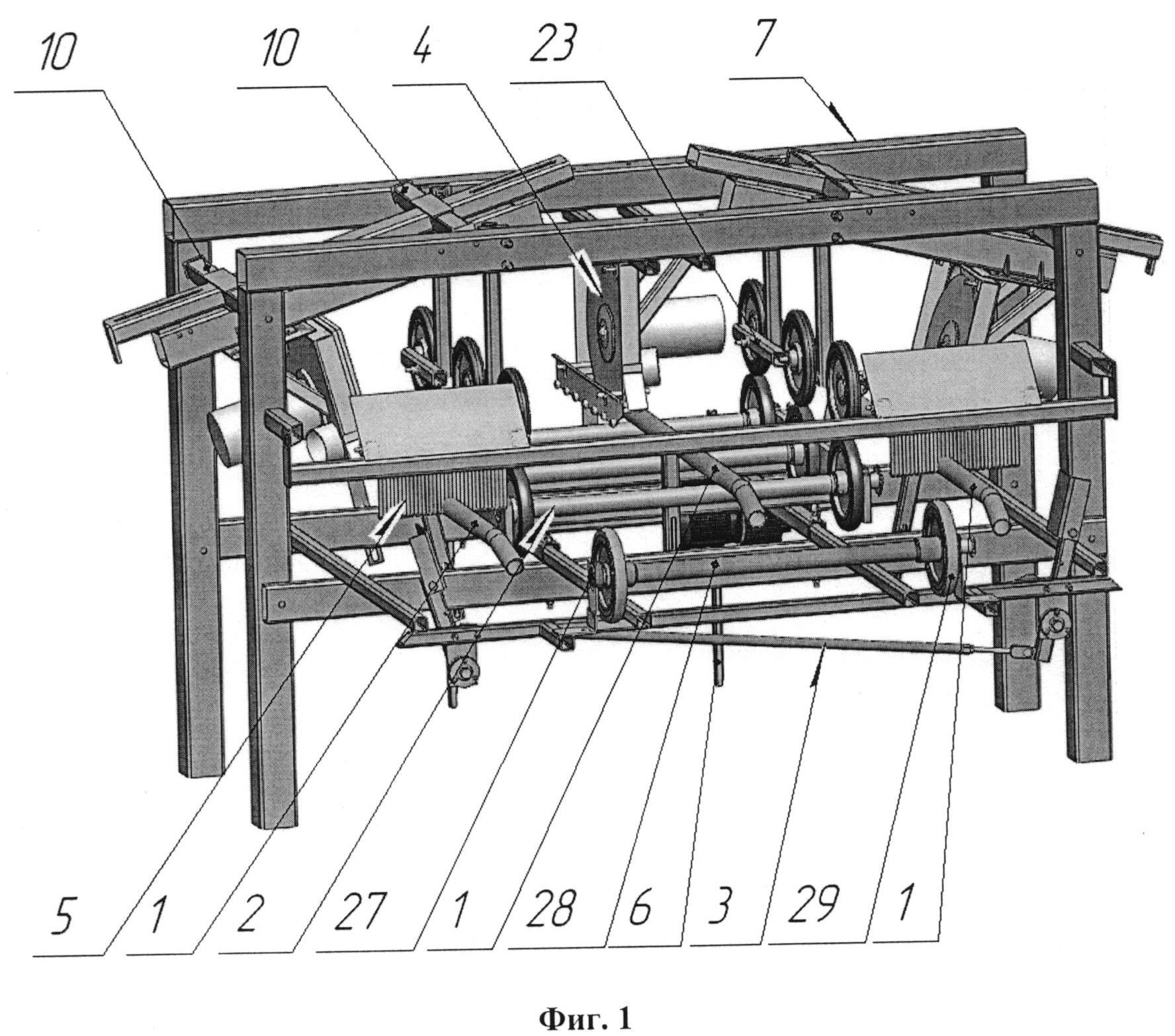 Группа изобретений относится фанерному производству, а именно к изготовлению пружинных ламелей и оборудованию для их изготовления. Известен способ изготовления пружинных ламелей, включающий форматирование гнуто-клееного щита и получение из него щитовой заготовки путем четырехсторонней обрезки гнуто-клееного щита под размеры, определяющие длину ламелей и их количество, роспуск щитовой заготовки на планки и дальнейшая их поштучная двухсторонняя торцевая обработка и профилирование с получением пружинных ламелей. См. рекламный проспект Javor stroji d.o.o. Pivka на сайте: www.javor.si. Данный способ реализуется большим количеством сложного оборудования и не предполагает получение одновременно ламелей разного формата. Известен, принятый за прототип, способ изготовления пружинных ламелей, включающий получение из гнуто-клееного щита щитовой заготовки путем четырехсторонней обрезки гнуто-клееного щита под размеры, определяющие длину ламелей и их количество, роспуск щитовой заготовки на пружинные ламели с одновременным профилированием их ребер. При этом позиционирование пильных валов осуществляется при помощи электронного цифрового указателя положения, а поперечная регулировка расположения нижнего вала относительно верхнего с установленным на них инструментом осуществляется при помощи качалки главного подшипника. См. рекламный проспект "PauL" Maschinenfabrik GmbH& Co. KG на сайте: www.paul. eu. Данный способ по сравнению с аналогом реализуется меньшим количеством оборудования, т.к. исключен поштучный роспуск щитовой заготовки на планки, а двухсторонняя торцевая обработка и профилирование с получением пружинных ламелей производится сразу после четырехсторонней обрезки гнуто-клееного щита под размеры, определяющие длину ламелей. Однако четырехсторонняя обрезка гнуто-клееного щита под размеры предполагает наличие двух станков и линий форматирования, при этом вторая линия форматирования удлиняется. Все это занимает большие площади и имеет дополнительный набор сложного оборудования, хотя роль обрезки краев после первой обрезки по длине ламелей можно осуществлять на станке для профилирования пружинных ламелей. При этом сложное оборудование этого способа не предполагает получения одновременно ламелей разного формата. Существует большое разнообразие типов и моделей форматных станков, получивших широкое применение в отрасли. Как правило, это универсальные и многофункциональные станки широкого профиля, которые при помощи определенных и несложных настроек можно перепрофилировать для достижения новых функций. На практике многие такие станки не используются по своему назначению по всему спектру заложенных в них возможностей. По этой причине их эффективность в применении падает с количеством неиспользованных функций. Чем больше неиспользованных функций, тем меньше эффективность многофункционального станка. При этом чем больше заложенных функциональных возможностей, тем сложнее, металлоемче и дороже оборудование, а чем проще оборудование, тем оно надежнее и дешевле. Известен многопильный станок для раскроя листовых материалов, включающий механизмы загрузки, подачи, базирования, продольного и поперечного раскроя. При этом механизм загрузки выполнен в виде каретки с двумя рядами подъемных упоров, причем один ряд упоров оснащен зажимам