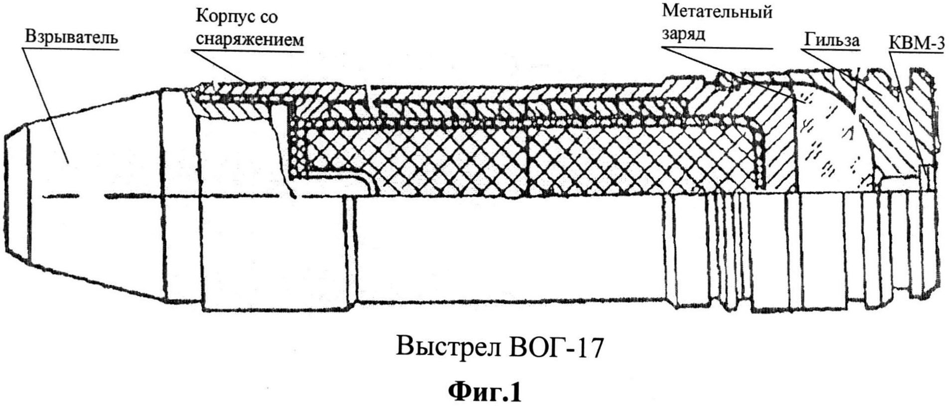 Изобретение относится к боеприпасам и способам их применения, а именно к выстрелам для автоматических гранатометов, укомплектованных взрывателями, срабатывающими контактно или дистанционно на траектории, в том числе по цепи самоликвидации, а также к способам стрельбы из автоматических гранатометов такими боеприпасами. Актуальность проблемы обусловлена кардинальным изменением в настоящее время характера войн в сторону преобладания локальных войн и подавления очагов терроризма, что влечет за собой необходимость разработки новых систем огнестрельного оружия и боеприпасов для повышения эффективности ближнего боя. Известны выстрелы с осколочно-фугасными гранатами для стрельбы из тридцатимиллиметровых автоматических гранатометов на станке (АГС-17, АГС-30) (Зеленко В.К. и др. Пистолетные и снайперские патроны. Гранатометные выстрелы. Учебное пособие. Тула; Инфра, 2008. - 120 с.). Из вышеуказанного источника информации следует, что выстрелы ВОГ-17, ВОГ-30 и ГПД-30 снабжены головным механическим взрывателем мгновенного действия полупредохранительного типа с пиротехническим механизмом дальнего взведения, включающим устройство для самоликвидации. При этом механизм самоликвидации приводится в действие от перегрузок при выстреле. Взрыватели указанных типов гранат взводятся на расстоянии 10-60 м от дульного среза гранатомета, чем обеспечивается дополнительная безопасность при стрельбе. Указанные выстрелы по всем параметрам соответствуют жестким российским стандартам и производятся серийно. При этом, несмотря на меньший по сравнению с зарубежными гранатами калибр и вес, поражающая эффективность указанных выстрелов выше. Однако максимальная дальность стрельбы гранатометных комплексов АГС-17 и АГС-30 с применением выстрелов ВОГ-17 и ВОГ-30 пока не превышает 1730 м, что значительно меньше аналогичного показателя иностранных гранатометных комплексов. Известно, что тридцатимиллиметровый автоматический гранатометный комплекс АГС-30 предназначен для уничтожения живой силы и поражения огневых средств противника, расположенных вне укрытий, в открытых окопах (траншеях) и за естественными складками местности (в лощинах, оврагах, на обратных скатах высот) (тридцатимиллиметровый автоматический гранатометный комплекс АГС-30. Руководство по эксплуатации. АГС-30.00.000РЭ. ГУП КБП. 2010). При этом для стрельбы из гранатомета применяются выстрелы с осколочной гранатой ВОГ-17, ВОГ-17М, ВОГ-30, ГПД-30. Ближайшим аналогом заявленного изобретения являются выстрелы ВОГ-17, ВОГ-17М и способы стрельбы ими из автоматических гранатометов АГС-30, АГС-17. Выстрелы состоят из осколочной гранаты, порохового заряда и головного взрывателя мгновенного действия. При этом взрыватель выстрела ВОГ-17М снабжен устройством самоликвидации. Ближайший аналог поясняется чертежом, где на фиг. 1 представлен выстрел ВОГ-17 (ВОГ-17М) и его составные части, на фиг. 2 представлена схема пристрелки дальности из гранатомета, на фиг. 3 представлена стрельба по цели, движущейся в плоскости стрельбы, на фиг. 4 - результаты натурных стрельб заявленными выстрелами, на фиг. 5 - стрельба по целям при дистанционном траекторном подрыве гранат. Действие ВОГ-17, ВОГ-17М происходит следующим образом. При выстреле боек гранатомета разбивает капсюль-воспламенитель, который воспламеняет пороховой заряд. Под действие