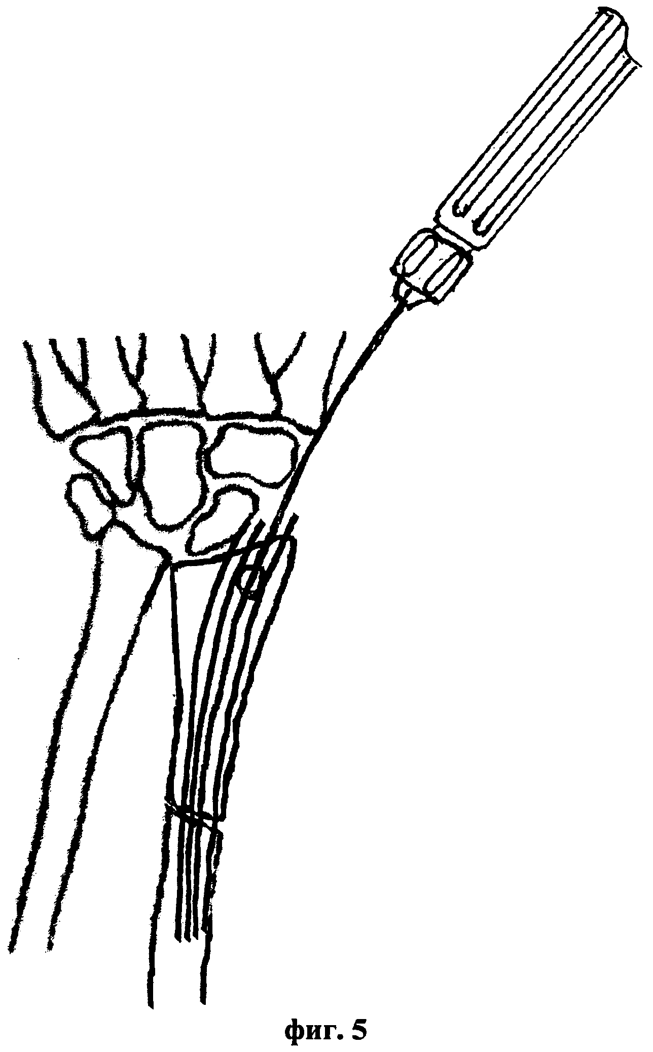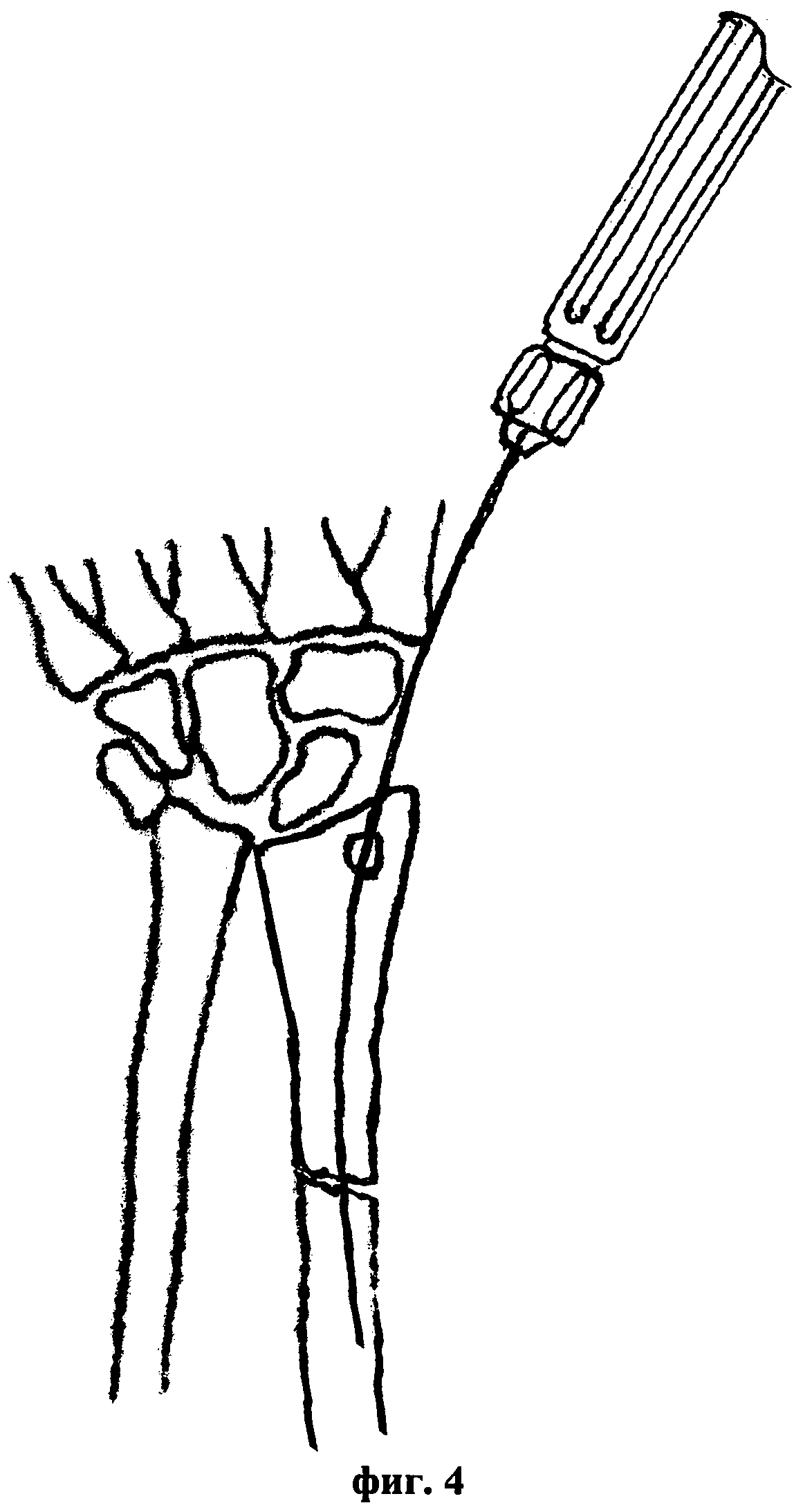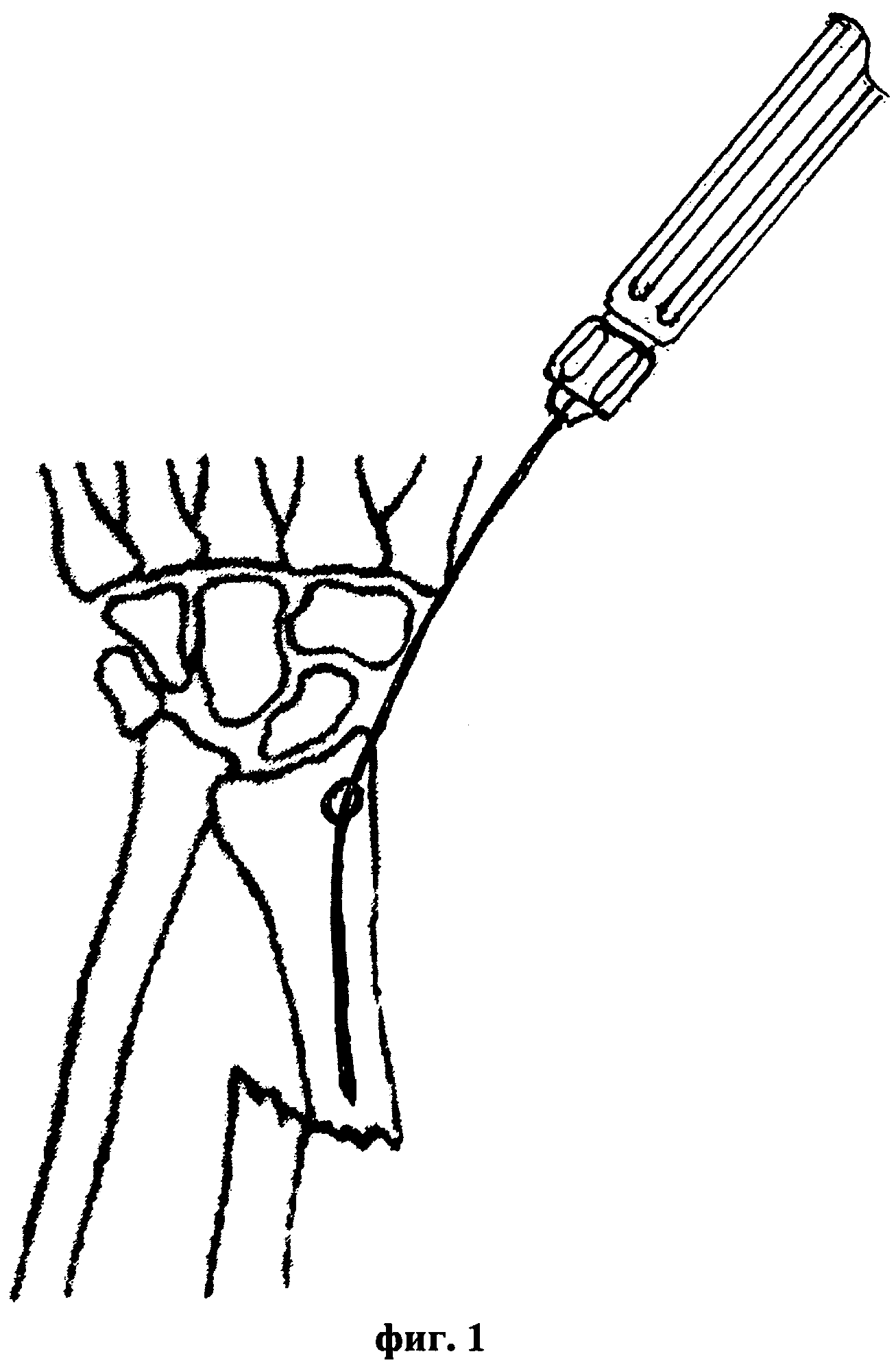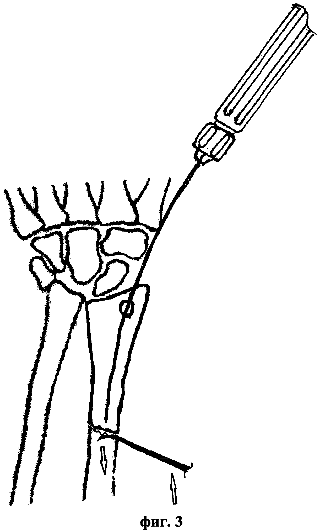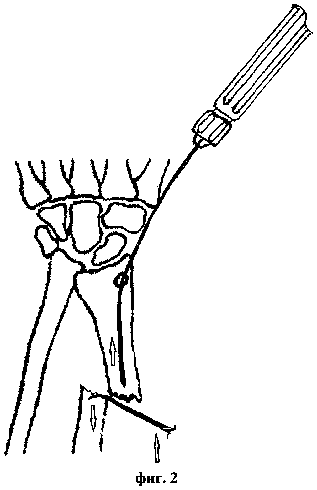 Изобретение относится к области медицины, а именно к травматологии и ортопедии, к способам закрытой репозиции диафизарных переломов лучевой кости с остеосинтезом пучком напряженных спиц и может быть использовано в условиях ортопедотравматологических стационаров при лечении диафизарных переломов лучевой кости, в том числе пациентов с системным остеопорозом. Известен способ хирургического лечения больных с изолированным диафизарным переломом лучевой кости, включающий фиксацию отломков с помощью металлических спиц (см. патент РФ №2253396, МПК A61B 17/56, 2005 г.). Однако известный способ хирургического лечения больных с изолированным диафизарным переломом лучевой кости при своем использовании имеет следующие недостатки: - недостаточно обеспечивает стабильно-функциональный остеосинтез переломов у пациентов любого возраста, - недостаточное исключение риска угловых смещений фрагментов лучевой кости, - значителен риск возникновения воспалительных осложнений, - не обеспечивает возможность полной функциональной нагрузки на конечность пациента, - не обеспечивает сокращения сроков полного восстановления функций конечности пациента, - не достаточно обеспечивает повышение качества жизни пациента. Задачей изобретения является создание способа закрытой репозиции переломов диафизарных переломов лучевой кости с остеосинтезом пучком напряженных спиц. Техническим результатом является надежное обеспечение стабильно-функционального остеосинтеза переломов у пациентов любого возраста, надежное исключение риска угловых смещений фрагментов лучевой кости, значительное снижение риска возникновения воспалительных осложнений, обеспечение возможности полной функциональной нагрузки на конечность пациента, сокращение сроков полного восстановления функций конечности пациента, обеспечение повышения качества жизни пациента. Технический результат достигается тем, что предложен способ закрытой репозиции переломов диафизарных переломов лучевой кости с остеосинтезом пучком напряженных спиц, включающий фиксацию отломков с помощью металлических спиц, при этом при положении пациента лежа на операционном столе под электронно-оптическим контролем выполняют все этапы закрытой репозиции диафизарных переломов лучевой кости, при этом сначала определяют вид аддукционного или абдукционного перелома лучевой кости, а также латеральное или медиальное смещение диафиза лучевой кости, после предварительной релаксации мышц выполняют через 3-4 мм прокол кожного покрова по боковой поверхности лучевой кости трепанационное отверстие диаметром 3,0-3,5 мм в дистальном метаэпифизе лучевой кости на 5-7 мм ниже шиловидного отростка, через которое вводят в костномозговой канал первую напряженную спицу-фиксатор диаметром 2 мм, не доводя ее на 2-3 мм до линии диафизарного перелома лучевой кости, затем, с использованием введенного через прокол кожного покрова на уровне диафизарного перелома лучевой кости между отломками изогнутого шиловидного крючка, выполняют чрезкожную репозицию костных фрагментов диафизарного перелома лучевой кости, проводят первую напряженную спицу-фиксатор в проксимальный отломок лучевой кости на глубину 3-4 диаметров костномозгового канала, удаляют изогнутый шиловидный крючок из пространства перелома лучевой кости и костны