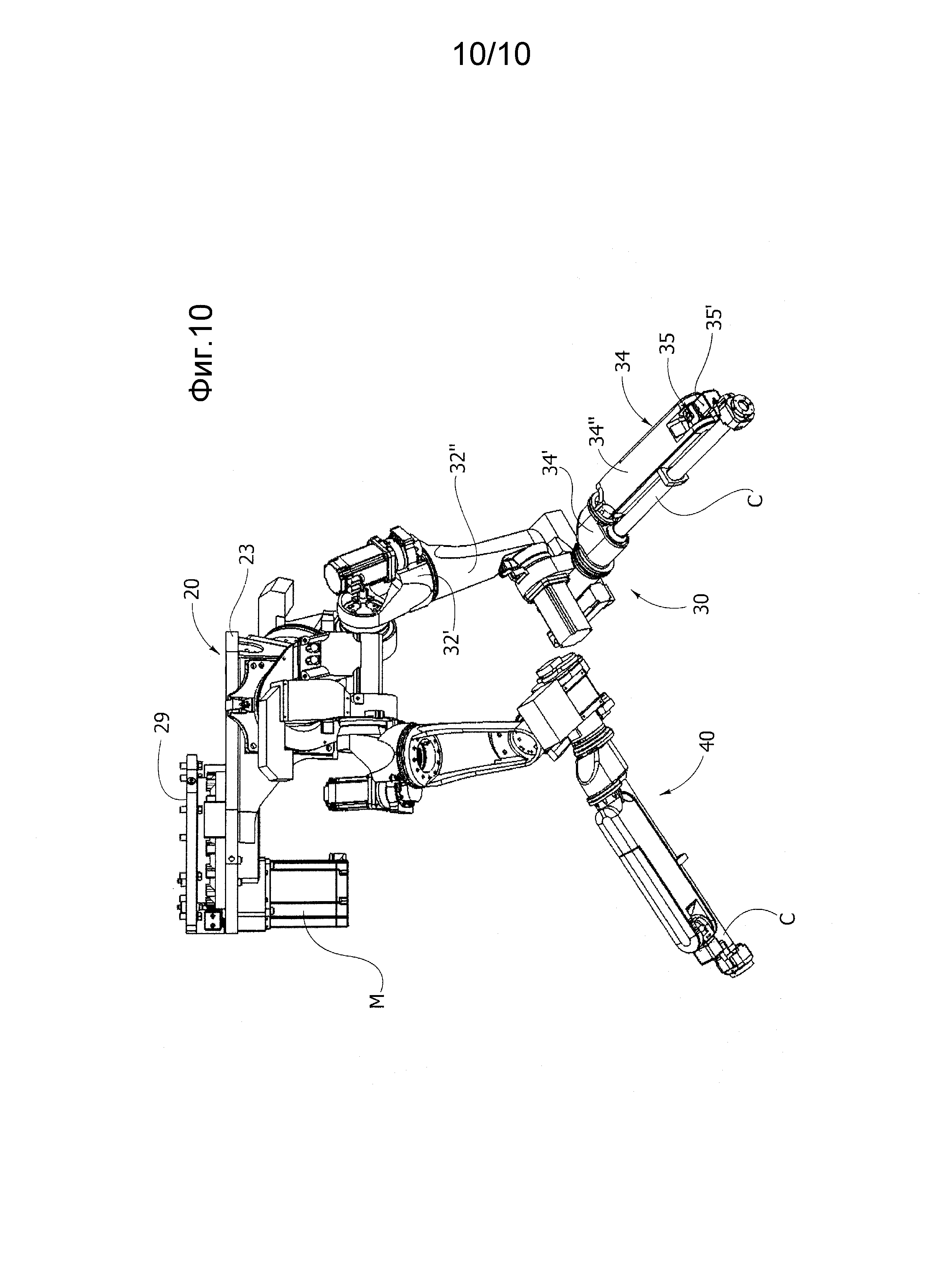 Настоящее изобретение относится к роботу-манипулятору для промышленных производственных линий, содержащему: - поддерживающую структуру; - первую руку робота, установленную в подвешенном состоянии на поддерживающей структуре и содержащую множество тел, расположенных последовательно и выполненных с возможностью вращения относительно друг друга и относительно поддерживающей структуры вокруг соответствующих осей вращения; - вторую руку робота, установленную в подвешенном состоянии на поддерживающей структуре и содержащую множество тел, расположенных последовательно и выполненных с возможностью вращения относительно друг друга и относительно поддерживающей структуры вокруг соответствующих осей вращения; и - первое и второе средства для установки, соответственно, первой и второй рук на поддерживающей структуре, в котором ось вращения первого поворотного тела первой руки, которое является ближайшим из множества тел к поддерживающей структуре, определяет первое направление и в котором ось вращения первого поворотного тела второй руки, которое является ближайшим из множества тел к поддерживающей структуре, определяет второе направление. Робот-манипулятор указанного типа описан, например, в международной заявке на патент WO № 2007/037130. Целью настоящего изобретения является усовершенствование вышеописанной конструкции путем создания робота-манипулятора, в котором первая и вторая руки выполнены с возможностью взаимодействия друг с другом более эффективно и гибко. Указанная выше цель достигается с помощью манипулятора, обладающего отличительными признаками, изложенными в пункте 1 формулы изобретения. Формула является неотъемлемой частью описания настоящего изобретения. Далее следует более подробное описание неограничивающего примера настоящего изобретения со ссылками на приложенные чертежи, на которых: Фиг.1 - схематический вид рабочей зоны, оборудованной роботом-манипулятором описываемого типа. Фиг.2 - вид в перспективе робота-манипулятора по настоящему изобретению. Фиг.3 - вид спереди робота-манипулятора по фиг.2. Фиг.4 - вид сверху робота-манипулятора по фиг.2. Фиг.5 - вид снизу робота-манипулятора по фиг.2. Фиг.6 - вид в перспективе другого варианта робота-манипулятора по настоящему изобретению. Фиг.7 - вид спереди робота-манипулятора по фиг.6. Фиг.8 - вид сверху робота-манипулятора по фиг.6. Фиг.9 - вид в перспективе робота-манипулятора по фиг.6 в рабочей конфигурации, и Фиг.10 - вид сбоку робота-манипулятора по фиг.9. В нижеследующем описании проиллюстрированы различные детали, предназначенные для облегчения понимания вариантов настоящего изобретения. Эти варианты могут быть созданы без одной или более конкретных деталей или с помощью других способов, компонентов или материалов и т.д. В других случаях известные конструкции, материалы или операции не показаны или не описаны, чтобы избежать усложнения описания различных вариантов. Ссылочные позиции в настоящем описании применяются лишь для удобства и, следовательно, не определяют объем защиты или объем изобретения. На чертежах позицией 10 обозначен робот-манипулятор, предназначенный для работы в промышленных производственных линиях, например в линиях по производству автомобилей. Робот 10 содержит поддерживающую структуру 20, а также первую руку 30 и вторую руку 40, уста