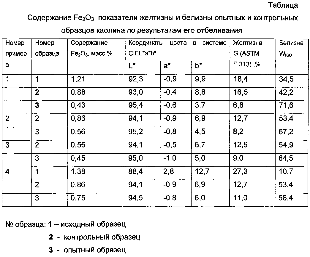 Результаты испытания образцов каолина после его отбеливания выражают в виде значений индекса белизны WISO, степени желтизны G, координат цвета L*a*b* и содержания оксида железа Fe2O3 для опытных образцов (№3 - опытный образец), контрольного образца (№2 - контрольный образец) и исходного образца (№1 - исходный образец), полученный по технологии сухого обогащения.