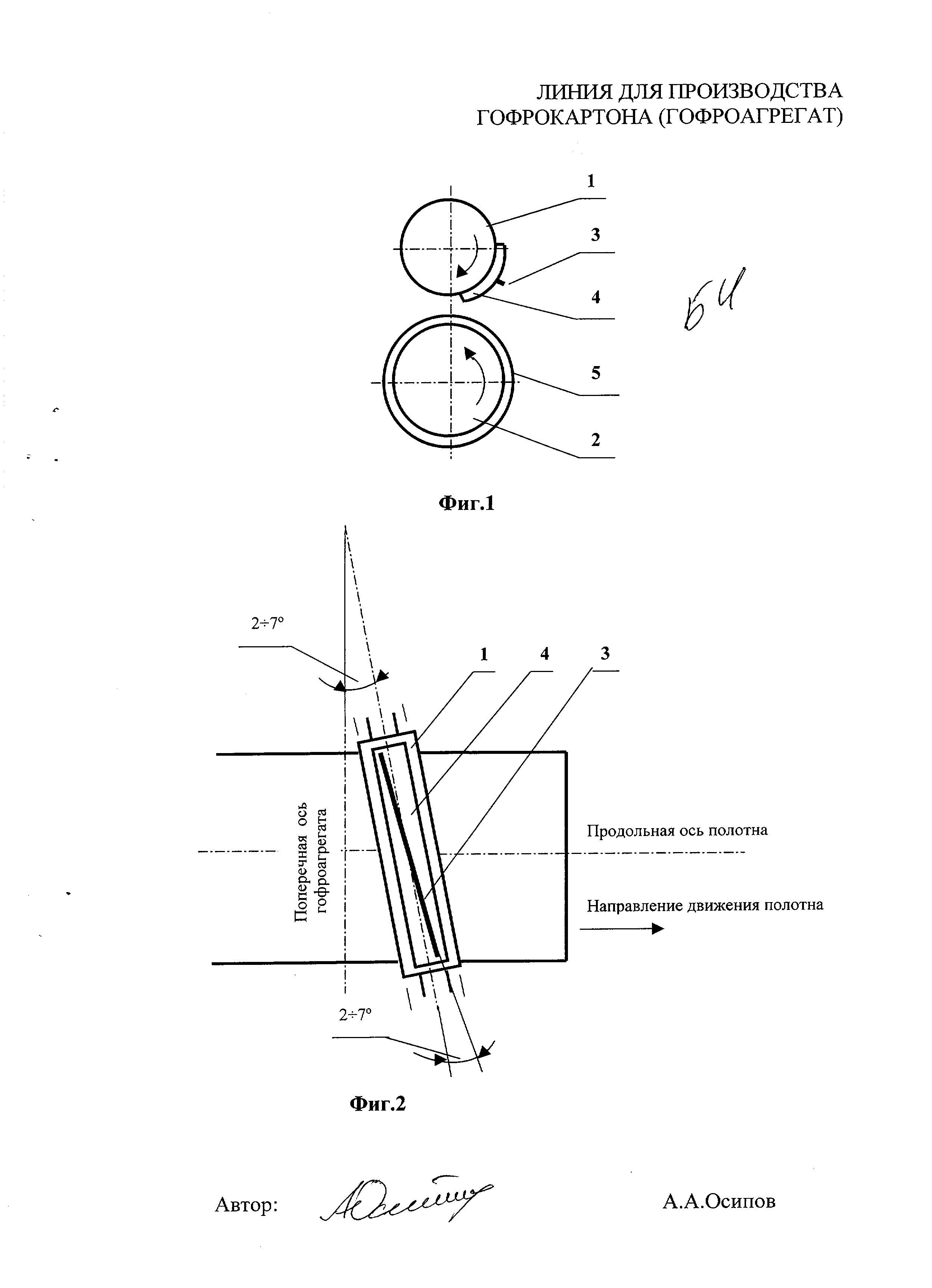 1. Линия для производства гофрокартона (гофроагрегат), включающая гофрирующие прессы, раскаты для бумаги и картона, накопительный мост, склеивающий станок, сушильно-охлаждающий стол, рилевочно-резательный узел и поперечно-резательную секцию, отличающаяся тем, что, с целью повышения качества резания при поперечном раскрое полотна гофрокартона, снижения трудоемкости и стоимости работ при обслуживании, в поперечно-резательной секции используется принцип ротационного резания "нож по эластичной опорной поверхности", при этом съемный режущий орган представляет собой пластинчатый нож, закрепленный на верхнем ножевом валу, а нижний вал имеет эластичную облицовку (например полиуретан), являющуюся опорной поверхностью. 2. Линия по п.1, отличающаяся тем, что, с целью уменьшения усилия резания на поперечно-резательной секции и устранения ударных нагрузок, снижения энергопотребления, нож располагается на валу по винтовой линии так, что угол между осевой линией ножа и осью ножевого вала составляет 2-7o, обеспечивая точечный контакт ножа с рабочей поверхностью опорного вала, причем для обеспечения перпендикулярности линии реза к продольной стороне полотна гофрокартона ножевой и опорный валы располагаются по отношению к поперечной оси гофроагрегата под углом, равным углу разворота ножа. 3. Линия по пп.1 и 2, отличающаяся тем, что, с целью снижения инерционных нагрузок на приводе, опорный вал поперечно-резательной секции кинематически связан с приводом сукна сушильно-охлаждающей части гофроагрегата и постоянно вращается со скоростью, равной скорости полотна, а ножевой вал приводится отдельным регулируемым электроприводом и оснащен устройством торможения, осуществляющим его остановку после каждого отруба. 4. Линия по п.3, отличающаяся тем, что, с целью повышения точности раскроя полотна гофрокартона по длине, на конце ножевого вала за зоной отруба установлен фрикционный (или зубчатый) сектор, кинематически связывающий ножевой и опорный валы в момент отруба, с угловой величиной α и высотой, соответствующей высоте ножа, а опорный вал связан с регулируемым электроприводом через муфту (например кулачковую) с увеличенным свободным ходом β, причем β≥α.