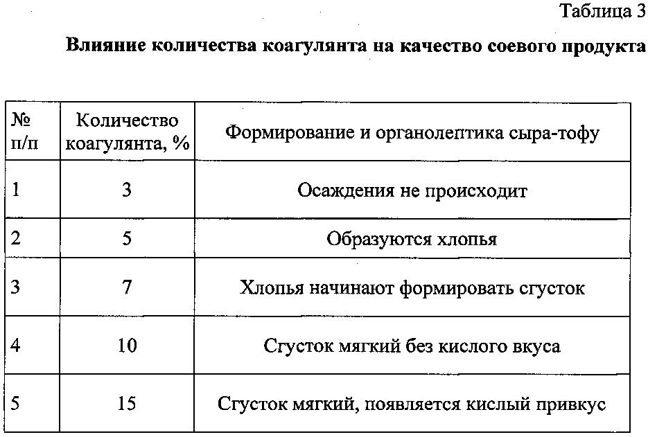 Способ получения соевого продукта типа сыра-тофу, включающий очистку, набухание, измельчение соевых бобов, тепловую обработку образующейся суспензии, отделение жидкой фазы - соевого молока от нерастворимого остатка, осаждение из соевого молока белкового сгустка кислыми коагулянтами, отделение белкового сгустка, формование и прессование, отличающийся тем, что тепловую обработку суспензии проводят нагреванием ее до температуры 70°С и выдерживанием в течение 1-3 часов, а осаждение белкового сгустка проводят путем добавления, в прокипяченное в течение 3-5 минут соевое молоко, 25%-ного раствора лимонной кислоты или 9%-ной уксусной кислоты в количестве 5-10% от массы соевого молока, после отделения белкового сгустка в него вносят одновременно с перемешиванием сухой нуклеопротеиновый комплекс ДНК из молок лососевых рыб в количестве 10-30% от массы белкового сгустка.