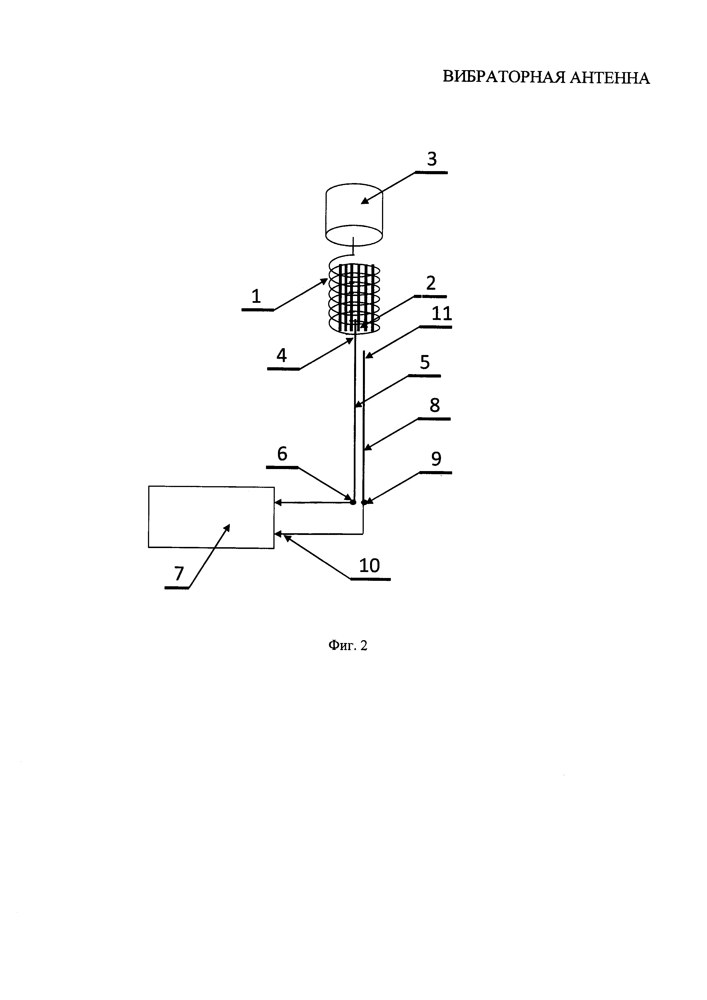 Изобретение относится к антенной технике и может быть использовано в мобильных длинноволновых (ДВ), средневолновых (СВ) и коротковолновых (KB) приемопередающих устройствах. Известна вибраторная антенна (патент РФ №2523959, МПК H01Q 9/18, опубл. 27.07.2014), содержащая вибратор, согласующее устройство, емкостную нагрузку и противовес, причем согласующее устройство выполнено в виде двух отдельных элементов - удлиняющей катушки и трансформатора, каждый из которых выполнен на своем отдельном замкнутом сердечнике магнитопровода. Недостатком этой антенны является необходимость развертывания перед проведением сеанса связи емкостной нагрузки, выполненной «в форме спиц, зонтика или веера», что создает неудобства при использовании этой антенны как во время движения транспорта, так и в носимых радиостанциях при передвижении пользователя, например, по лесистой местности. Наиболее близкой к заявляемой является конструкция малогабаритной вибраторной антенны (патент РФ №2413344, МПК H01Q 9/18, опубл. 27.02.2011), которая содержит вибратор, согласующее устройство, включающее индуктивности, причем вибратор расположен в магнитном поле согласующего устройства, выполненного в виде трансформатора, размещенного на незамкнутом сердечнике магнитопровода, при этом вибратор электрически соединен с вторичной обмоткой трансформатора. Данная конструкция малогабаритной вибраторной антенны обладает следующими недостатками: - антенна узкополосная, что вызывает неудобство при эксплуатации, т.к. при смене рабочей частоты требуется заменять и вибраторную антенну; - параметры этой антенны сильно зависят от окружающей среды, например, меняется коэффициент усиления антенны при изменении расстояния от тела оператора или от кузова транспорта; - антенна сложна в настройке при изготовлении, что затрудняет ее серийное производство. Технический результат заявляемого изобретения заключается в расширении функциональных возможностей устройства, а именно: обеспечении возможности использования одной и той же вибраторной антенны при смене рабочих частот, упрощении согласования вибраторной антенны с радиостанцией во время ведения сеансов связи, снижении зависимости параметров антенны от окружающей среды, упрощении ее настройки при серийном производстве. Указанный технический результат достигается тем, что у вибраторной антенны, содержащей индуктивность, вибратор, электрически соединенный с одним концом этой индуктивности и представляющий собой объемный проводник, расположенный в магнитном поле индуктивности, выполненной на незамкнутом сердечнике магнитопровода, согласно заявляемому изобретению, второй конец индуктивности соединен с одним из проводов питающей антенну двухпроводной электрической линии, другой провод, играющий роль противовеса, одним концом заземлен на радиостанции, а второй конец этого провода находится в свободном состоянии. Питающая антенну двухпроводная электрическая линия может быть выполнена в виде высокочастотного кабеля, внутренний провод которого соединен со вторым концом индуктивности, а внешний провод одним концом заземлен на радиостанции, а второй конец внешнего провода высокочастотного кабеля находится в свободном состоянии. Питающая антенну двухпроводная электрическая линия может быть выполнена в виде двужильного электр