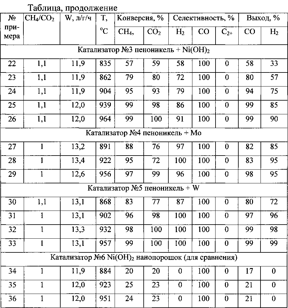 Изобретение относится к способу получения синтез-газа высокотемпературным каталитическим окислительным превращением метана. Способ заключается в подаче в реактор, в который помещен катализатор, исходной газовой смеси, содержащей смесь метана и углекислого газа и проведении процесса при температуре 778-964°С. При этом в качестве катализатора используют катализатор пеноникелевого типа, выбранный из группы, включающей пеноникель, имеющий значение PPI - количество пор на линейный дюйм, выше 80, пеноникель с нанесенным на его поверхность электрохимическим способом гидроксидом никеля с последующей сушкой поверхности с образованием на ней гидроксида никеля или с последующей сушкой и термообработкой поверхности с образованием на ней оксида никеля или пеноникель с нанесенным на его поверхность электрохимическим способом переходным металлом VI группы периодической системы Менделеева с последующей сушкой и термообработкой поверхности, причем термообработку поверхности проводят на воздухе при температуре 500-600°С. Технический результат заключается в повышении конверсии метана и СO, повышении выходов оксида углерода и водорода, в упрощении технологии проведения способа и сокращении затрат за счет проведения процесса в отсутствие инертных газов, а также использования катализатора, получаемого более простым способом. 2 з.п. ф-лы, 1 табл., 36 пр.