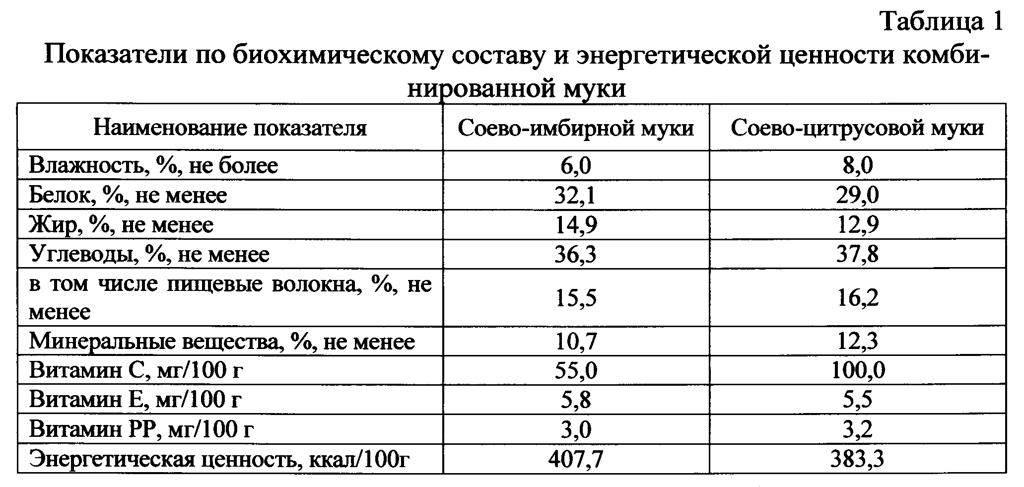 Изобретение относится к пищевой промышленности и может быть использовано при производстве хлебобулочных изделий функционального и специализированного назначения. Известен способ приготовления хлебобулочных изделий, включающий приготовление теста, его брожение 120-210 мин, разделку, расстойку в течение 60-120 мин и выпечку при температуре 200-220°C в течение 35-45 мин (Сборник технологических инструкций для производства хлебобулочных изделий. - М: Прейскурантиздат, 1989. - С. 255-267. Аналог). Недостатком данного способа является невысокая пищевая и биологическая ценность в готовом продукте из-за низкого содержания белковых веществ, отсутствия клетчатки, минеральных веществ и витаминов. Известен также способ приготовления сдобного изделия булочки «Исток», включающий замес теста, при котором молоко цельное и Меланж заменяют соевым изолятом, взятым в количестве 5,5±1%, в качестве жирового продукта используют льняное масло в количестве 4,3±1%, глицерин в количестве 10±1% к массе муки и соевый лецитин в количестве 24±1% к массе муки, причем предварительно перед замесом теста готовят эмульсию: соевый изолят смешивают с водой в соотношении 1:3, лецитин растворяют в льняном масле и глицерине, после чего полученные компоненты перемешивают, тесто направляют на брожение, обминку, расстойку и выпечку изделий (Заявка 2007115089/13 от 23.04.2007. Способ приготовления сдобного изделия булочки «Исток». МПК7 A21D 8/02, A21D 2/26, A21D 2/36. Прототип). Недостатком данного способа является незначительное содержание в готовом продукте пищевых волокон, минеральных веществ и витамина С. Задачей настоящего изобретения является получение продукта повышенной пищевой и биологической ценности из пшеничной муки первого сорта, за счет повышения содержания белков и пищевых волокон, обогащения витаминами и минеральными веществами. Технический результат заключается в том, что данный способ позволяет получить продукт, содержащий физиологически ценные комплексы ингредиентов, белок и пищевые волокна, минеральные вещества и витамины С и Е, одновременно с пониженным содержанием легкоусвояемых углеводов. Это достигается тем, что в качестве мучного компонента используют смесь пшеничной муки первого сорта с комбинированной соево-имбирной или соево-цитрусовой мукой, взятых в соотношении 3:1 соответственно. Способ осуществляется следующим образом. Из семян сои и свежего корня имбиря или семян сои и кожуры цитрусовых готовят комбинированную муку, которую смешивают с пшеничной мукой первого сорта в соотношении 1:3, в смесь вносят подготовленные яйца, молоко, сахар, соль, сливочное масло и дрожжи, добавляют воду и проводят замес теста. Тесто оставляют для брожения, затем формую изделия, проводят расстойку и выпекают. Пример Комбинированную соево-имбирную муку получают следующим образом. Набухшие семена сои, нарезанный свежий корень имбиря смешивают в равных количествах и измельчают в воде с нагреванием, до получения тонкодисперсной суспензии с одновременной экстракцией растворимых веществ. В полученный экстракт вносят водный раствор аскорбиновой кислоты и проводят коагуляцию белковых и других веществ, в результате образуются белково-углеводно-витаминный остаток и сыворотка. Сыворотку отделяют прессованием, а остаток сушат и измельчают в муку. Комбинированная соево-имбирная мука характериз