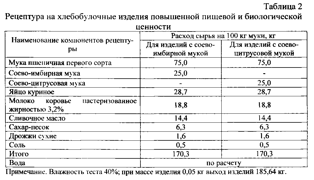 Способ приготовления хлебобулочных изделий повышенной пищевой и биологической ценности, включающий смешивание мучного и рецептурных компонентов, брожение, разделку, расстойку и выпечку заготовок, отличающийся тем, что мучной компонент готовят смешиванием муки пшеничной первого сорта с комбинированной соево-цитрусовой мукой или соево-имбирной мукой при соотношении 3:1 соответственно.