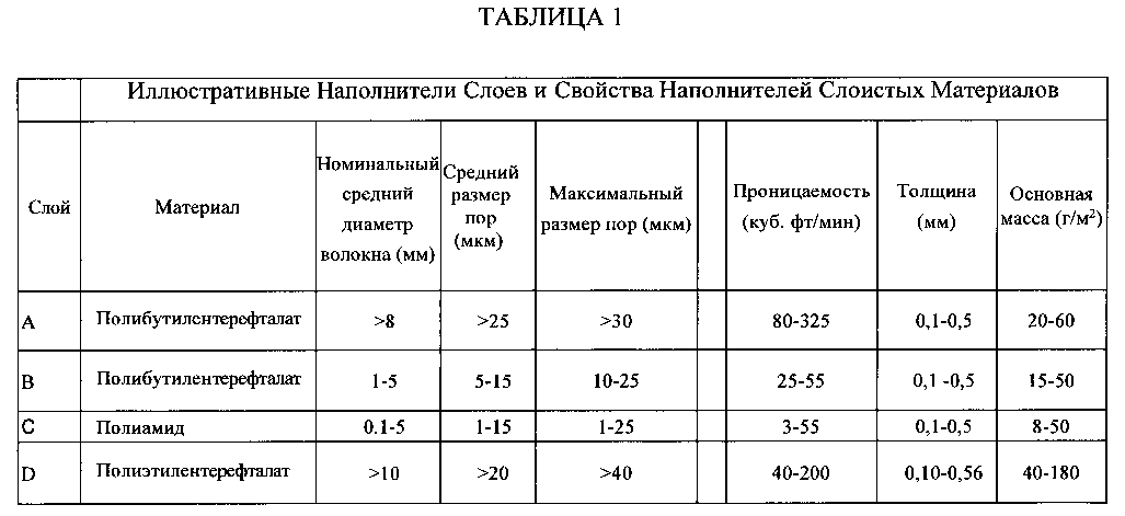 1. Составной наполнитель, образованный путем соединения по меньшей мере трех слоев материала наполнителя в направлении сверху вниз, а именно слоя А, необязательно слоя В, слоя С и слоя D, в котором один или более слоев, смежных слою С, содержат бикомпонентные полимерные волокна, причем характеристики слоев являются следующими: слой А содержит полимерный материал наполнителя, имеющий номинальный средний диаметр волокна более чем около 10 мкм; слой С содержит полимерный материал, содержащий нановолокна и имеющий средний размер пор от 0,2 до 10 мкм; и слой D содержит полимерный материал с номинальным средним диаметром волокон более чем около 10 мкм и обеспечивает поддержку для предыдущих слоев. 2. Составной наполнитель по п. 1, отличающийся тем, что бикомпонентные полимерные волокна содержат полимерные материалы с разной начальной температурой плавлений. 3. Составной наполнитель по п. 2, отличающийся тем, что начальные температуры плавления отличаются по меньшей мере на 10°С. 4. Составной наполнитель по п. 1, отличающийся тем, что бикомпонентные полимерные волокна содержат сердцевину и оболочку в поперечном разрезе, причем сердцевина и оболочка содержат разный полимерный материал, и полимерный материал оболочки имеет более низкую температуру плавления, чем полимерный материал сердцевины. 5. Составной наполнитель по п. 4, отличающийся тем, что слой А содержит бикомпонентные волокна, и температура плавления полимерного материала оболочки ниже, чем температура плавления полимерного материала слоя С. 6. Составной наполнитель по п. 4, отличающийся тем, что слой В содержит бикомпонентные волокна, и температура плавления полимерного материала оболочки ниже, чем температура плавления полимерного материала слоя С. 7. Составной наполнитель по п. 4, отличающийся тем, что слой D содержит бикомпонентные волокна, и температура плавления полимерного материала оболочки ниже, чем температура плавления полимерного материала слоя С. 8. Составной наполнитель по п. 4, отличающийся тем, что слой А и слой D содержат бикомпонентные волокна, и температура плавления полимерного материала оболочки ниже, чем температура плавления полимерного материала слоя С. 9. Составной наполнитель по п. 4, отличающийся тем, что слой А, слой В и слой D содержат бикомпонентные волокна, и температура плавления полимерного материала оболочки ниже, чем температура плавления полимерного материала слоя С. 10. Составной наполнитель по п. 1, отличающийся тем, что один или более слоев соединены с одним или более смежных слоев посредством ультразвуковой сварки. 11. Составной наполнитель по п. 1, отличающийся тем, что слой А содержит полимерный материал, средний размер пор которого больше чем около 25 мкм. 12. Составной наполнитель по п. 1, отличающийся тем, что слой А содержит полимерный материал с максимальным размером пор более чем около 30 мкм. 13. Составной наполнитель по п. 1, отличающийся тем, что слой А содержит полимерный материал, имеющий проницаемость 80-325 куб. фт/мин. 14. Составной наполнитель по п. 1, отличающийся тем, что слой А содержит полимерный материал, имеющий толщину 0,1-0,5 мм. 15. Составной наполнитель по п. 1, отличающийся тем, что слой А содержит полимерный материал, имеющий основную массу 20-60 г/м2. 16. Составной наполнитель по п. 1, отличающийся тем, что слой С содержит материал наполнителя, и
