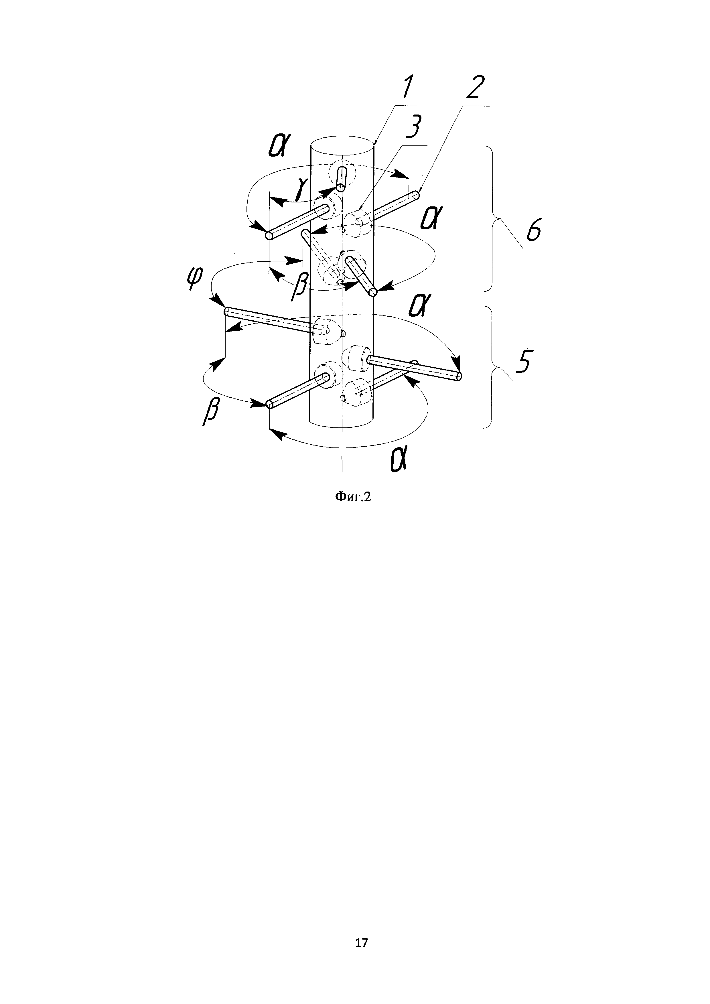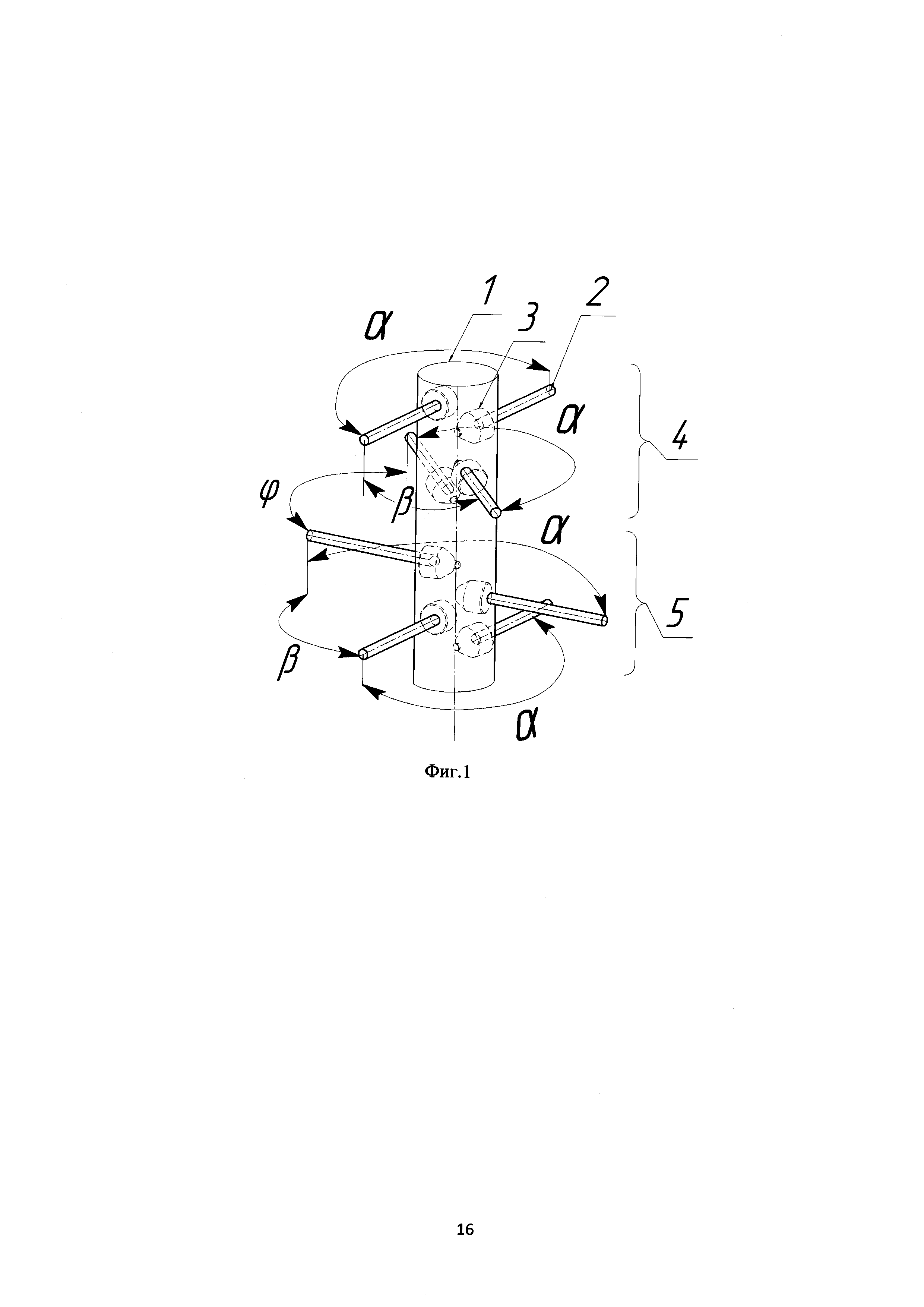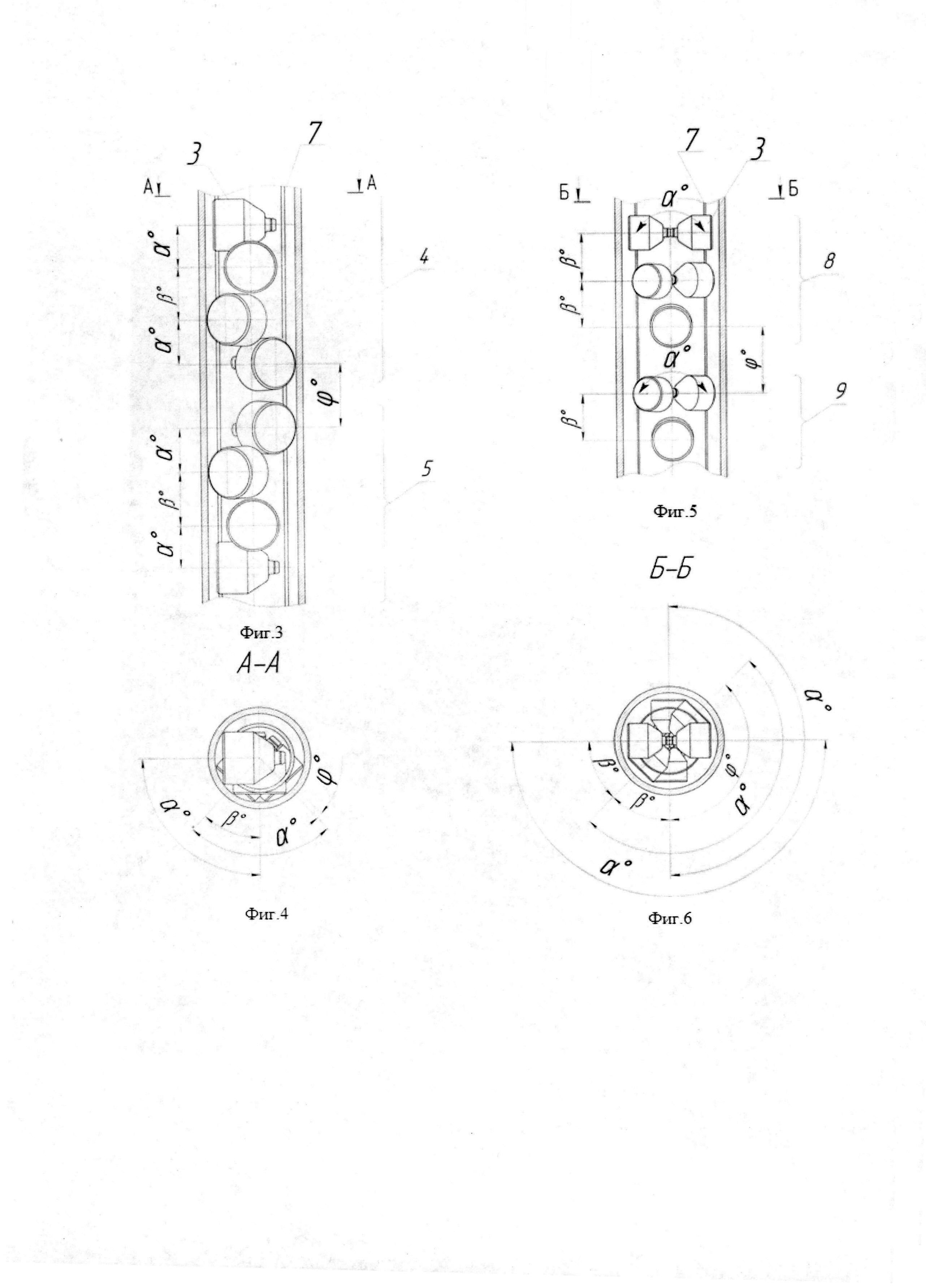Изобретение относится к прострелочно-взрывным работам в нефтяных и газовых скважинах. Известен кумулятивный перфоратор, который содержит несущую конструкцию с расположенными в ней кумулятивными зарядами, расположенными попарно /RU 2370639 C1, МПК8 Е21В 43/117, опубл. 2009/. Заряды, образующие пару, расположены относительно друг друга под одним углом, а угол между парами зарядов отличен от угла в парах или равен ему. Недостатком является группирование зарядов в перфораторе ограничено только парами зарядов, т.е. количество зарядов в группе - два, угол между зарядами в паре α, угол между парами зарядов β. При назначении углов в паре и между парами необходимо выбирать - либо назначать углы, обеспечивающие наименьшее фугасное воздействие на скважину при срабатывании перфоратора, либо назначать углы, обеспечивающие максимальный охват пласта в радиальном направлении в поперечном сечении скважины. При этом нужно делать выбор. Известен перфоратор /RU 2447267 C1, МПК8 Е21В 43/117, опубл. 2009/, содержащий несущую конструкцию, в которой расположены кумулятивные заряды, расположенные группами, при этом заряды, образующие группы, включающие от трех зарядов, расположены относительно друг друга под определенным углом в разных плоскостях, а угол между группами зарядов определен в зависимости от выбранного угла в группе зарядов. Указанные группы зарядов расположены в разных плоскостях. Недостатком является одинаковый угол в группе зарядов α, что огранивает назначение углов в группе, обеспечивающих снижение фугасного воздействия на крепь скважины. Хотя в известной конструкции назначить углы в группе зарядов α и между группами зарядов β, обеспечивающие максимальный охват пласта в радиальном направлении в поперечном сечении скважины, возможно. Задачей, на решение которой направлено заявляемое техническое решение, является разработка кумулятивного перфоратора для обеспечения высокого уровня совершенства вскрытия пластов. При осуществлении изобретения поставленная задача решается за счет достижения технического результата, обеспечивающего пониженное фугасное воздействие на скважину при срабатывании и оптимальный охват продуктивного пласта перфорационными каналами как в радиальном направлении в поперечном сечении скважины, так и по всей длине перфоратора. Указанный технический результат по объекту (вариант 1) достигается тем, что в известном кумулятивном перфораторе, содержащем несущую конструкцию, в которой расположены кумулятивные заряды группами, особенностью является то, что указанные группы зарядов состоят из одной или нескольких пар зарядов, при этом заряды, образующие пару, расположены относительно друг друга под одним углом α, угол между парами зарядов β отличен от угла в парах α, а угол между группами зарядов ϕ выполняют отличным от угла в парах α и угла между парами β. Указанный технический результат по объекту (вариант 2) достигается тем, что в известном кумулятивном перфораторе, содержащем несущую конструкцию, в которой расположены кумулятивные заряды группами, особенностью является то, что указанные группы зарядов состоят из одной или нескольких пар зарядов и дополнительных одиночных зарядов, при этом заряды, образующие пару, расположены относительно друг друга под углом α, угол между парами зарядов β, угол между парой зарядов и оди