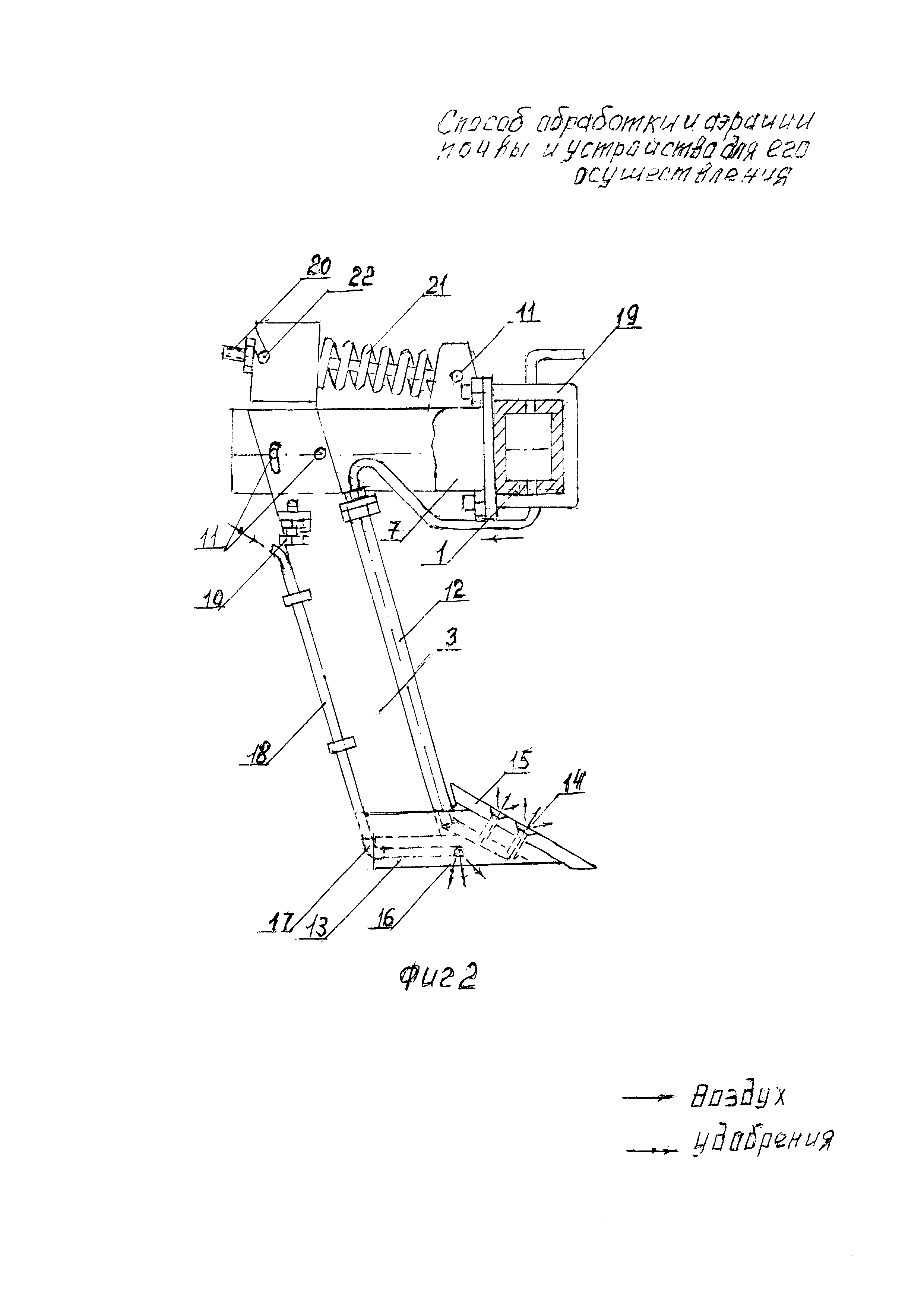 Изобретение относится к отрасли сельского хозяйства, в частности к способам обработки, аэрации и удобрения почвы и устройствам для его осуществления. Известен способ обработки почвы [1], включающий нарезание щелей в почве, выполнение окончания щели в виде дренажного канала прямоугольной формы со сторонами больше ширины щели в 1,5-2 раза. Каналы изготавливают на глубине 13-15 см от подошвы пахотного слоя, а щели нарезают на расстоянии 4-5 м одну от другой и располагают их вдоль силовых линий геомагнитного поля. По питающей трубке, приваренной к стойке щелереза в дренажный канал, подаются удобрения. Целью изобретения является снижение трудоемкости работ, улучшение водно-воздушного и энергетического режима почвы. Недостатком способа является недостаточное рыхление почвы, уплотнение почвы ходовыми системами тракторов, нарезание одной щели вдоль продольной оси трактора блокирует распространение питательных веществ по всей площади межщелевого пространства из-за уплотнения почвы ходовыми системами тракторов, аэрация почвы протекает со слабой интенсивностью. Наибольшее расстояние между щелями для различных агрофонов должно составлять 0,8-1,2 м, а не 4 м [2]. Нарезание щелей вдоль силовых линий геомагнитного поля не всегда эффективно из-за сложного рельефа полей, щели могут располагаться вдоль склона. Подкормочное устройство в виде вертикальной трубки не способствует эффективному распространению питательных элементов по всей поверхности межщелевого пространства. Известен способ аэрации почвы [3]. Способ заключается в том, что при перемещении установленного на раме рабочего органа с отверстиями для подачи воздуха через канал с клапаном под почву подают сжатый воздух, причем количество воздуха, подаваемого в единицу времени, изменяется в зависимости от плотности почвы и глубины обработки. Задачей способа является повышение эффективности использования энергии сжатого воздуха на выполнение полезной работы по аэрации почвы путем изменения количества воздуха, подаваемого под почву в единицу времени при изменении плотности и глубины обработки. Недостатком способа является малая частота колебаний рабочего органа в продольно-вертикальной плоскости, зависящая от флуктуации почвы и, как следствие, плохое качество крошения, малая эффективность использования энергии сжатого воздуха, воздух используется преимущественно для аэрации почвы, но не для крошения почвы и охлаждения рабочих органов. Наиболее близким к предлагаемому техническому решению является способ обработки почвы, осуществляемый вибрационным глубокорыхлителем [4]. Способ включает рыхление почвы подпружиненными рабочими органами глубокорыхлителей, перемещающимися в почве с колебаниями в продольно-вертикальной плоскости с заданными амплитудой и частотой, и сжатым воздухом, подаваемым в подпахотные слои почвы для ее рыхления и аэрации с регулируемой частотой и давлением. Недостатком способа является недостаточное рыхление почвы как по глубине, так и по всей ширине захвата орудия из-за уплотнение почвы ходовыми системами тракторов. Задачей изобретения является повышение качества обработки почвы, насыщение ее воздухом, необходимым для улучшения протекания биологических процессов с одновременным внесением под напором в подпахотные слои почвы жидких удобрен