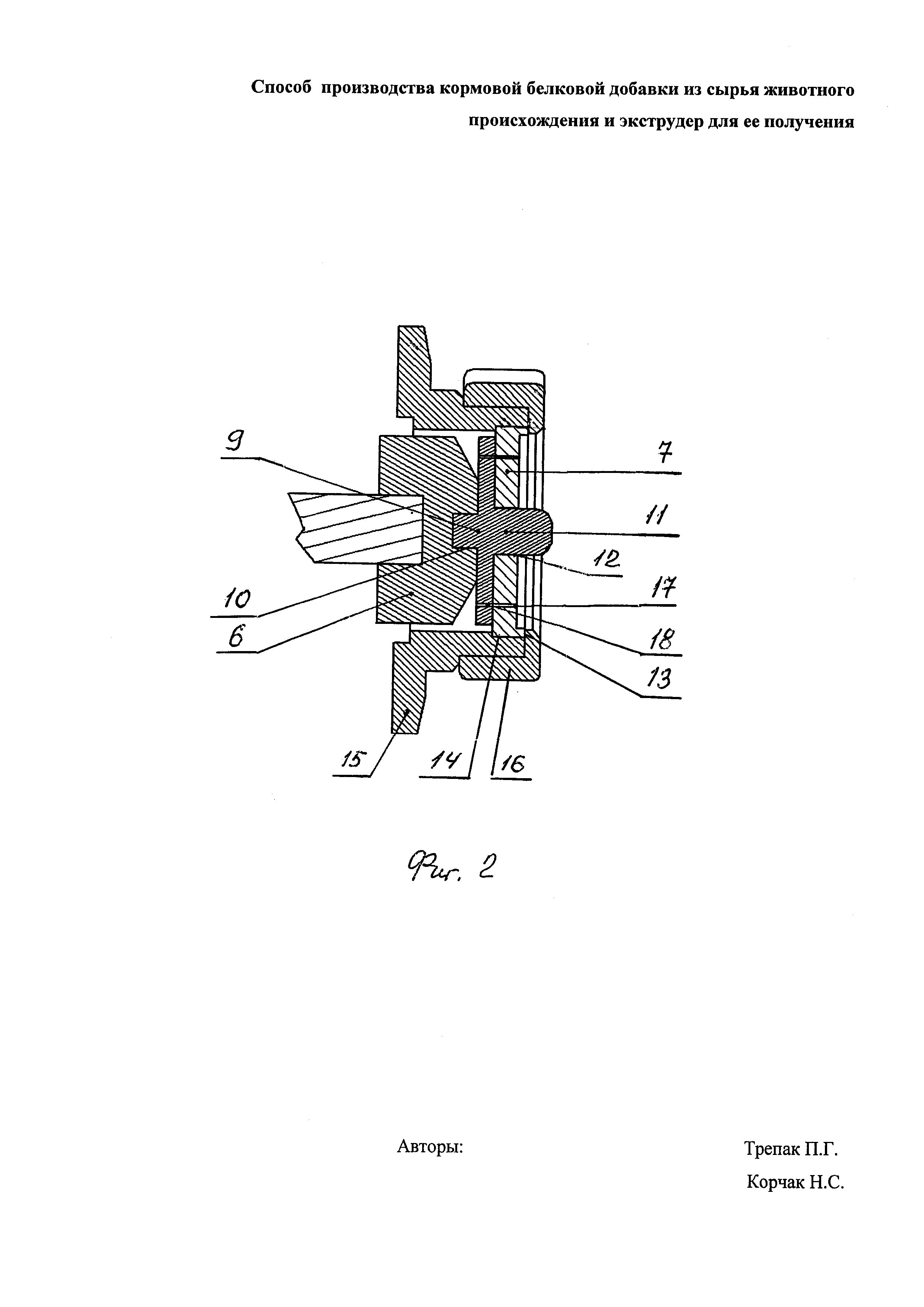 1. Способ производства кормовой белковой добавки из сырья животного происхождения, характеризующийся тем, что предусматривается экструдирование влажного сырья в экструдере с термообработкой при 180-250°C под давлением с одновременным перетиранием и гидролизом в течение 30-90 с, отличающийся тем, что обработку сырья ведут с его прохождением в экструдере через тарельчатую фильеру с внутренним дисковым ножом, создающими при вращении относительно друг друга давление 70-100 МПа, а в качестве сырья используют отходы хромовых кож, щетину, отходы шерсти влажностью 60-80%. 2. Экструдер, содержащий фильеру и нож, отличающийся тем, что нож с одной стороны неподвижно поводком вставлен в паз головки экструдера, вращающейся вместе с червячным органом экструдера, с другой стороны - осью в отверстие фильеры, выполненной тарельчатой с выступом, установленной в паз фланца, связанного неподвижно с корпусом экструдера, и зафиксированной относительно фланца гайкой по выступу, при этом фильера и нож выполнены с 6-8 отверстиями диаметром 0,4-2,5 мм, расстояние между тарельчатой фильерой и режущим ножом, расположенным параллельно тарельчатой фильере, - 0,01-0,1 мм.