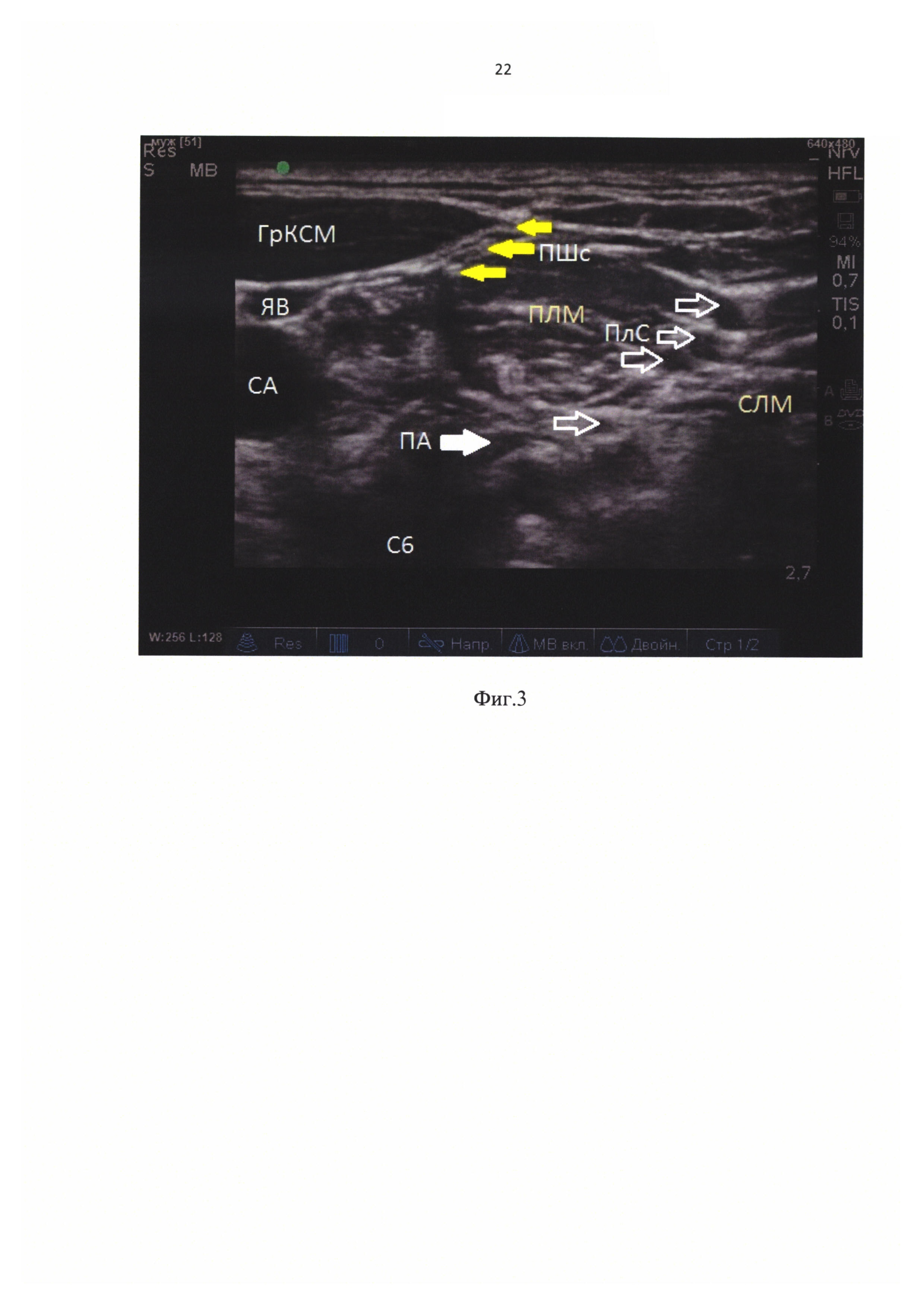 Изобретение относится к медицине, а именно к анестезиологии, а именно к способам межлестничной проводниковой анестезии при артроскопических оперативных вмешательствах на плечевом суставе, а также при открытых операциях в области надплечья, ключицы, головки плеча, и может использоваться как в «моноварианте», так и в качестве составного этапа при сочетании с общей анестезией. Травма верхних конечностей занимает одно из первых мест в структуре общего травматизма, а высокая хирургическая активность при лечении этих травм делает актуальной проблему выбора метода обезболивания, так как выполнение оперативных вмешательств на верхних конечностях, которые часто носят реконструктивно-восстановительный характер, невозможно без полноценного обезболивания и стабильной иммобилизации зоны операции. Блокада плечевого сплетения как базис компонент сбалансированной анестезии отвечает этим требованиям и позволяет отказаться от тотальной кураризации и проведения искусственной вентиляции легких на операции и в послеоперационном периоде. В настоящее время широко применяют такие способы блокады плечевого сплетения, как надключичный и межлестничный. Известны надключичные доступы к плечевому сплетению в модификациях Куленкампфа, Ревенко Т.А., Пащука Ф.Ю., Кузьменко В.В. [Кузьменко В.В., Хамраев Ш.Ш., Скороглядов А.В. Проводниковое обезболивание нервных стволов и сплетений при операциях на конечностях. Ташкент: Медицина; УзССР; 1990. С. 18-26]. Различия модификаций заключаются в разных точках вкола иглы в зависимости от положения больного на операционном столе, определения проекции плечевого сплетения на первом ребре и пульсации подключичной артерии. Недостатком метода является неадекватная анестезия плечевого сустава и возможность осложнений, таких как пневмоторакс, гемоторакс. При этом следует отметить, что есть риск не обеспечить анестезию надлопаточного нерва, который отходит от плечевого сплетения довольно высоко и далее проходит отдельно, так как надключичные доступы анатомически мало обоснованы для обеспечения анестезии плечевого сустава. Кроме того, надключичные доступы не дают анестезии кожи при операциях на плечевом суставе (не блокируется наружное шейное сплетение). Поэтому для оперативных вмешательств в области надплечья и плеча лучше всего подходит межлестничная блокада. Это связано с тем, что в иннервации плечевого сустава основную роль играют надлопаточный нерв (С5-С6), который обеспечивает чувствительную иннервацию плечевого сустава на 70%, и подмышечный нерв. Так как оба нерва формируются из корешков С5-С6-С7 и верхнего и среднего стволов, то для адекватной анальгезии необходима блокада этих корешков и/или стволов. А для полной анестезии области операции обычно дополнительно необходима блокада надключичного нерва (С3-С4) и латерального грудного (С5-С6-С7), мышечнокожного (С5-С6-С7) нервов, иннервирующих кожу в области операции. Межреберно-плечевые нервы (Т2-ТЗ) и медиальный кожный нерв плеча (С8-Т1) обеспечивают кожную иннервацию области подмышечной ямки и медиальной поверхности плеча, которая обычно остается интактной как при артроскопических, так и при открытых операциях на плечевом суставе. Основной проблемой воздействия в данной зоне является то, что в межлестничном промежутке плечевое сплетение граничит с таки