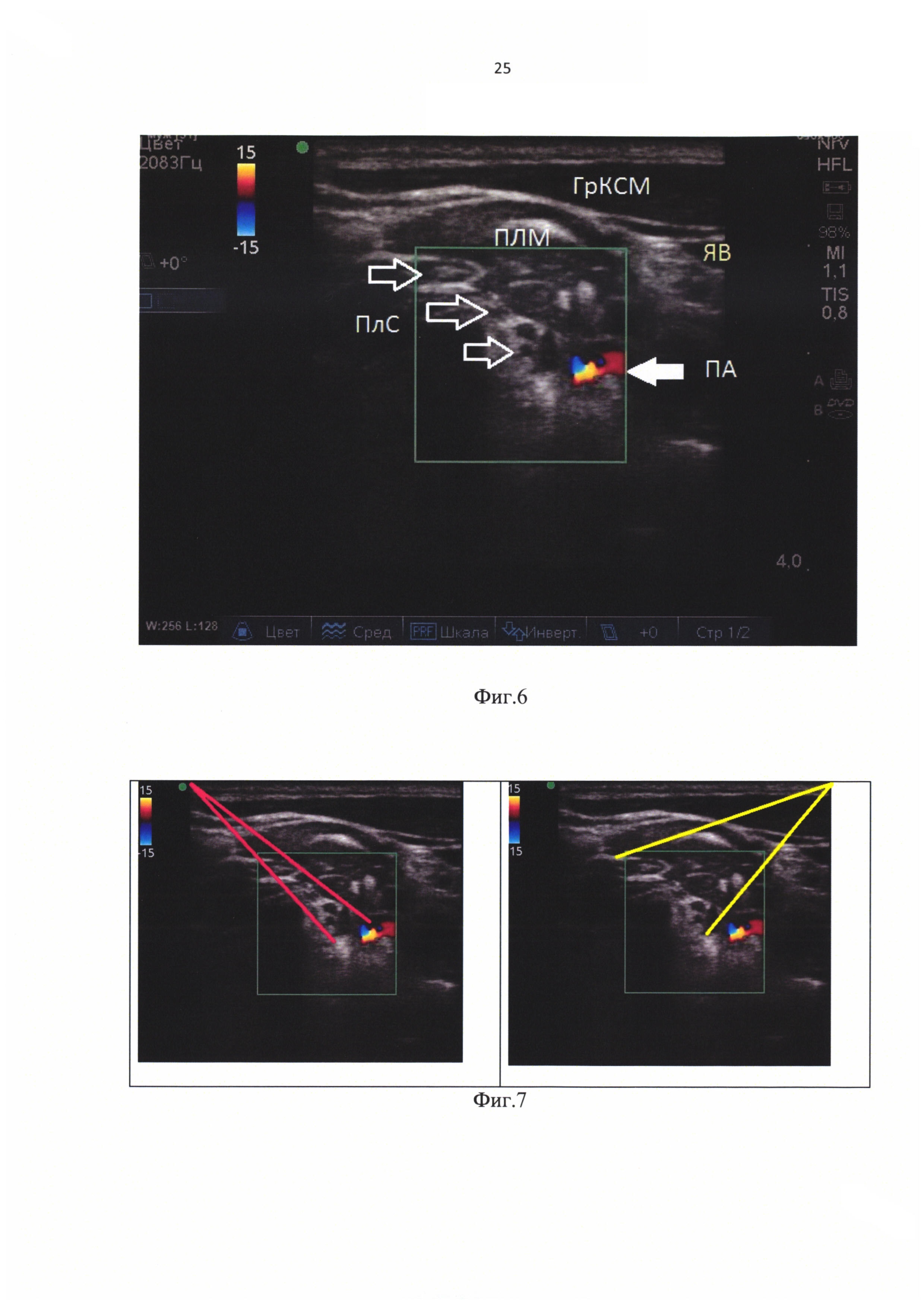 1. Способ межлестничной анестезии при артроскопических оперативных вмешательствах на плечевом суставе под контролем ультразвукового датчика, включающий фиксацию пациента в положении на спине с поворотом головы в сторону, противоположную от процедуры, ультразвуковую визуализацию плечевого сплетения высокочастотным датчиком на уровне перстневидного хряща и введение местного анестетика через нейростимуляционную иглу, отличающийся тем, что сканирование датчиком проводят по боковой поверхности шеи от уровня поперечного отростка С6 по длинной оси с расположением иглы в плоскости датчика, при этом нейростимуляционную иглу вводят латеральнее ультразвукового датчика в его сканирующей плоскости, анестетик вводят последовательно к верхнему, среднему и нижнему стволам плечевого сплетения и С7-С8 корешкам, а также в область наружного шейного сплетения между фасциями передней лестничной и грудино-ключично-сосцевидной мышцами из того же места вкола. 2. Способ по п. 1, отличающийся тем, что для скрининга применяют ультразвуковой сканер с линейным УЗ-датчиком с частотой 10-12 MHz. 3. Способ по п. 1, отличающийся тем, что для нейростимуляции используют нейростимуляционную иглу с «карандашной» заточкой. 4. Способ по п. 1, отличающийся тем, что анестезию проводят, применяя для блокады плечевого сплетения 8-10 мл 0,5% раствора ропивакаина, а блокаду наружного шейного сплетения проводят с использованием 3-5 мл 0,2% ропивакаина.