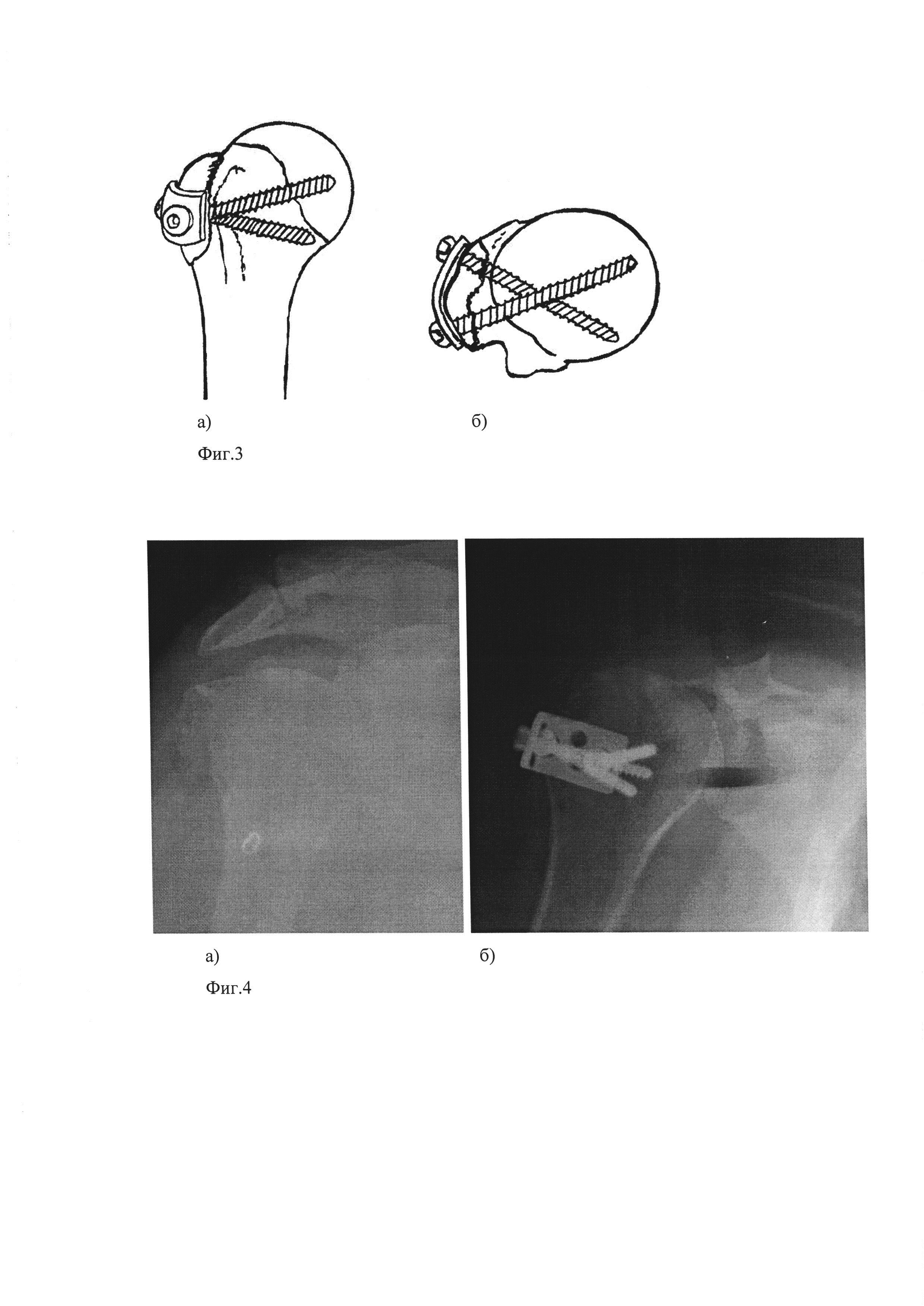 Изобретение относится к медицинской технике, а именно к устройствам, применяемым в травматологии и ортопедии. Лечение переломов большого бугорка плечевой кости является актуальной проблемой травматологии и ортопедии. Переломы бугорков плечевой кости могут быть как изолированными, так и в составе переломо-вывихов проксимального отдела плечевой кости. Чаще всего они возникают при непрямом механизме травмы. У пожилых больных на фоне остеопороза переломы проксимального отдела плечевой кости могут явиться результатом травмы низкой энергии, а у пациентов молодого возраста - при значительной травме. Разновидностью перелома большого бугорка плечевой кости являются отрывные переломы, которые, как правило, сопровождаются смещением костных отломков. Обусловлено это анатомо-топографическими особенностями плечевого сустава, а именно тем, что спереди, сзади и сверху он окружен сильными сухожилиями, вплетающимися в капсулу сустава и образующими вращательную манжету. Последняя состоит из сухожилий четырех мышц: надостной мышцы, которая начинается от надостной ямки, прикрепляется к большому бугорку плечевой кости и выполняет отведение плеча; подостной мышцы и круглой мышцы, идущих от подостной ямки до большого бугорка плечевой кости и производящих наружную ротацию плеча; подлопаточной мышцы, идущей от передней поверхности лопатки к малому бугорку плечевой кости и осуществляющей внутреннюю ротацию плеча. Сухожилия эти расположены совместно с туго натянутой капсулой, а их задачей является точная центрация и фиксация головки плеча в суставной впадине лопатки. Это нужно для того, чтобы действия других мышц плеча - прежде всего дельтовидной мышцы, - находили оптимальную точку приложения. Главное участие в этом принимает сухожилие надостной мышцы, прикрепляющейся к большому бугорку плечевой кости. Следовательно, при переломе большого бугорка плечевой кости под действием тяги вращательной манжеты, костный фрагмент смещается вверх (фиг. 1, а) и может ущемляться между акромиальным отростком и головкой плечевой кости (импинджмент-синдром). Поэтому точная репозиция и фиксация костных отломков при переломе большого бугорка так важны для дальнейшей функции верхнего плечевого пояса. Отрыв большого бугорка плечевой кости со смещением является показанием к оперативному лечению. Обычно производят открытый остеосинтез спицами Киршнера, трансоссальными швами хромированным кетгутом, проволочной стягивающей петлей (фиг. 1, б) или металлическим винтом (фиг. 1, в). После операции необходима внешняя иммобилизация плечевого пояса, и чем стабильнее остеосинтез, тем она менее продолжительна и, соответственно, меньше вероятность развития постиммобилизационной контрактуры плечевого сустава и степень ее выраженности. Критика аналогов Применение для остеосинтеза трансоссальных швов хромированным кетгутом и спиц Киршнера может рассматриваться лишь как вынужденная мера у лиц с низкими функциональными запросами. Обусловлено это тем, что данные варианты остеосинтеза не обеспечивают устойчивой фиксации костных фрагментов и требуют длительной внешней иммобилизацией верхней конечности. Длительная иммобилизация приводит к стойкой контрактуре в плечевом суставе с существенным ограничением функции плечевого пояса. Кроме того, спицы нередк