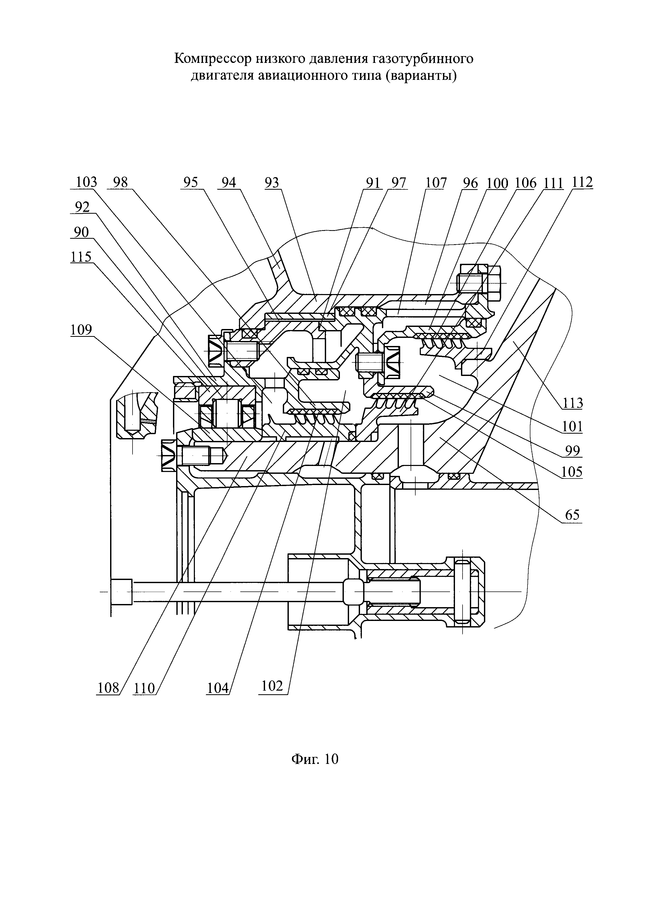 1. Компрессор низкого давления (КНД) двухконтурного двухвального газотурбинного двигателя (ГТД) авиационного типа, характеризующийся тем, что выполнен осевым, не более чем четырехступенчатым, наделен входным направляющим аппаратом (ВНА), имеющим корпус и снабженные регулируемо поворотными закрылками силовые профилированные стойки, а также наделен соединенным с ВНА корпусом статора КНД, в котором установлены образующие лопаточные венцы направляющих аппаратов (НА) лопатки соответственно первой, второй и третьей ступеней статора и образующие лопаточный венец сдвоенного спрямляющего аппарата лопатки четвертой ступени статора, причем КНД имеет переднюю и заднюю опоры, первая из которых закреплена в корпусе ВНА КНД, а вторая в промежуточном корпусе (ПК) двигателя, а в указанных опорах установлен ротор КНД с валом, включающим барабанно-дисковую и цилиндрическую составляющие, первая из которых наделена рабочими колесами по числу ступеней ротора, состоящими каждое из диска и лопаток, образующих лопаточный венец соответствующей ступени, при этом цилиндрическая составляющая вала ротора соединена на силовых шлицах с рессорой, соединяющей в свою очередь последнюю с валом турбины низкого давления (ТНД) с возможностью получения от турбины и пропуска через заднюю опору КНД крутящего момента к барабанно-дисковой составляющей вала ротора, которая в осевом направлении разъемно соединена с цилиндрической составляющей вала установленным в полости вала внутренним полым стяжным болтом, причем задняя опора вала ротора КНД выполнена опорно-упорной и содержит шарикоподшипник, разделяющий опору на статорную и роторную части, статорная часть включает корпус опоры в виде силовой конической диафрагмы, выполненной заедино с корпусом шарикоподшипника и переходящей у торцов во внутреннее и внешнее силовые кольца разных диаметров, наделенные фланцами для разъемных соединений с ответными фланцами наружного кольца шарикоподшипника и с фланцем промежуточного корпуса двигателя, а коническая диафрагма корпуса задней опоры снабжена выполненным заодно с диафрагмой фронтальным кольцевым элементом под неразъемное соединение с расположенным перед ним другим кольцевым элементом, выполненным с √-образным профилем поперечного сечения, при этом между фронтальным кольцевым элементом силовой конической диафрагмы и фланцем внутреннего силового кольца последней диафрагма снабжена кольцевым рядом отверстий для циркуляции масла и воздуха между фронтальной и тыльной частями масляной полости, количество указанных отверстий принято в виде простого числа Nод, определенного в диапазоне (17<Nод<35), при этом роторная часть опоры задней опоры КНД включает нижнюю часть конической диафрагмы, выполненную заодно с задней цапфой вала ротора КНД, а также установленные на цилиндрической составляющей вала ротора выполненное составным внутреннее кольцо шарикоподшипника и два многогребешковых кольца лабиринтных уплотнений, которые совместно с ответными крышками лабиринтов разделяют масляную и суфлирующую полости, а также суфлирующую полость и полость наддува воздуха, объем которой ограничен третьим многогребешковым кольцом лабиринтного уплотнения, установленным на конической диафрагме задней цапфы, неразъемно соединенной с диском рабочего колеса