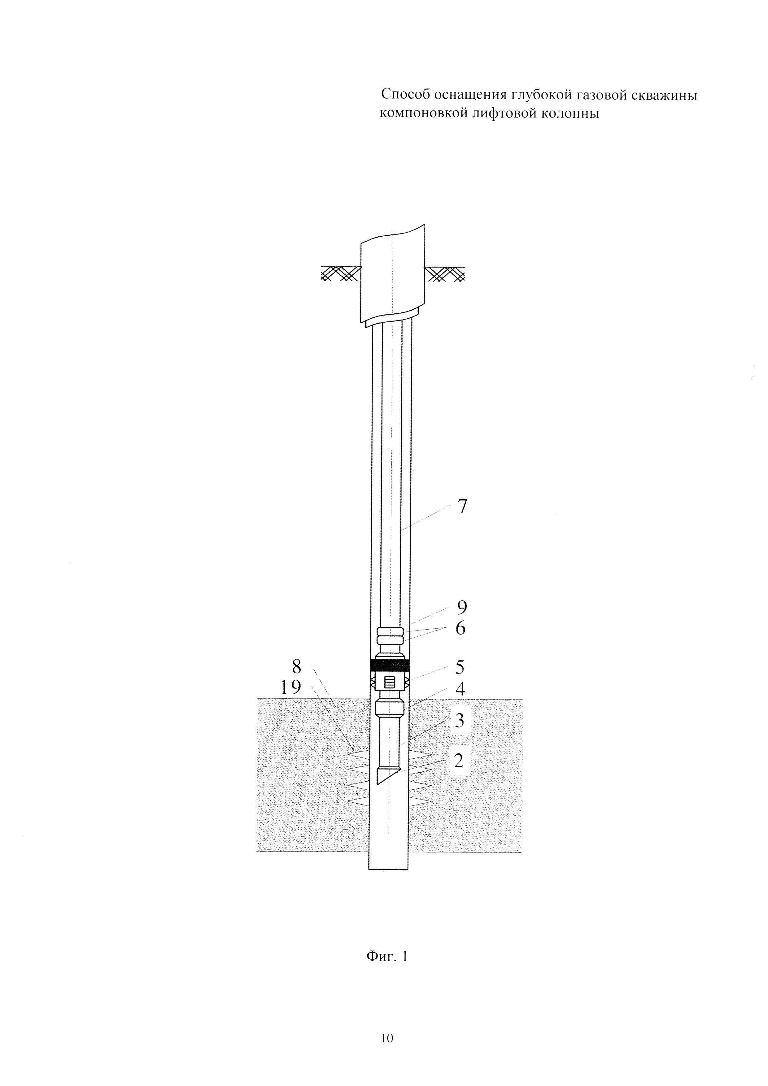 Способ оснащения глубокой газовой скважины с аномально-высоким пластовым давлением при наличии в приустьевой зоне многолетнемерзлых пород компоновкой лифтовой колонны, характеризующийся тем, что осуществляют последовательное соединение требуемых элементов компоновки нижней части лифтовой колонны, содержащей снизу вверх центрирующую воронку, подпакерный хвостовик из насосно-компрессорных труб, нижний посадочный ниппель, эксплуатационный пакер, разъединитель колонны, спуск на технологической колонне указанной компоновки в скважину до проектной глубины, запакеровку эксплуатационного пакера, спуск в скважину глухой пробки с перекрытием ею седла нижнего посадочного ниппеля, опрессовку элементов нижней части лифтовой колонны созданием избыточного давления, не превышающего ожидаемое рабочее давление на устье, извлечение из скважины глухой пробки, отсоединение технологической колонны в разъединителе колонны и извлечение ее из скважины, последовательное соединение и спуск в скважину элементов компоновки верхней части лифтовой колонны, содержащей снизу вверх отсоединенную часть разъединителя колонны, циркуляционный клапан, верхний посадочный ниппель, телескопическое соединение, держатель датчика давления и температуры, средней секции лифтовой колонны из насосно-компрессорных труб, ингибиторного клапана, приустьевого клапана-отсекателя, верхней секции лифтовой колонны из насосно-компрессорных труб, соединение верхней части лифтовой колонны к ее нижней части в разъединителе колонны, спуск в скважину глухой пробки с перекрытием ею седла верхнего посадочного ниппеля, опрессовку элементов верхней части лифтовой колонны созданием избыточного давления, не превышающего ожидаемое рабочее давление на устье, извлечение из скважины глухой пробки, подвешивание лифтовой колонны в подвеске НКТ трубной головки фонтанной арматуры.