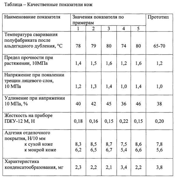 Изобретение относится к кожевенной промышленности и может быть использовано при выработке кож для обивки мебели, салонов автомобилей и самолетов. Способ включает отмоку сырья в присутствии протеолитического ферментного препарата, золение, обеззоливание голья в присутствии 7%-ного водного раствора молочной кислоты в количестве 5,0-6,0 мас. % при жидкостном коэффициенте 0,1-0,2, мягчение, пикелевание голья в присутствии жирующей эмульсии в количестве 0,4-0,5 мас. % и натриевой соли карбоксиметилцеллюлозы, модифицированной 40%-ным водным раствором глутарового альдегида, в соотношении 1:(0,05-0,09) в количестве 0,05-0,06 мас. % при жидкостном коэффициенте 0,1-0,2, дубление глутаровым альдегидом в присутствии полимерного дубителя при его расходе 3,0-4,0 мас. %, процесс додубливания строганых кож синтетическими дубителями, крашения и жирования в одной ванне, промывку, фиксацию 4%-ным водным раствором органической кислоты в присутствии катионного полиэлектролита при их расходе соответственно 5,0-6,0 мас. % и 0,4-0,5 мас. % и отделку полуфабриката. Додубливание синтетическими дубителями ведут в две стадии в присутствии жирующей эмульсии в количестве 3,0-4,0 мас. % на каждой при расходе синтетических дубителей 5,0-7,0 мас. % на первой стадии и 25,0-27,0 мас. % - на второй. Предлагаемый способ выработки обивочных кож обеспечивает повышение термостойкости и эксплуатационных свойств обивочных кож. 3 з.п. ф-лы, 1 табл., 6 пр.