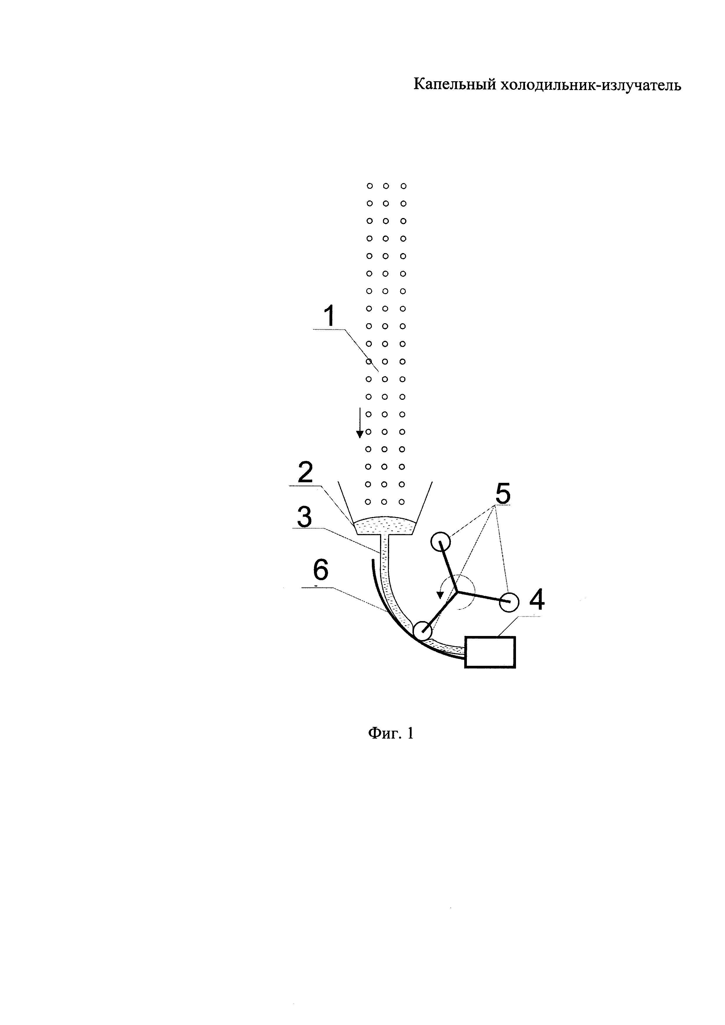 Изобретение относится к области космической техники, а конкретнее к устройствам отвода низкопотенциального тепла от систем космических аппаратов. Одним из перспективных способов отвода тепла от космических аппаратов (КА) является капельный холодильник-излучатель (КХИ), состоящий из системы хранения и подачи теплоносителя, генератора капель, коллектора капель, перекачивающего насоса, трубопроводов. Общая схема работы КХИ изложена в статье [1]. КХИ содержит зону нагрева теплоносителя капельного холодильника-излучателя в энергетической системе космического аппарата, зону преобразования жидкого теплоносителя в поток капель, летящих в свободном космическом пространстве, коллектор капель для их сбора из космического пространства и подачу в энергетическую систему. Известно несколько способов для сбора капель КХИ. Эти способы изложены, например, в статье [2] и патентах [3, 4]. В статье [2] для сбора капель предлагается использовать большой вращающийся барабан, куда попадают капли капельного потока. За счет вращения барабана появляется центробежная сила достаточная для обеспечения подачи масла в перекачивающий насос. Такой насос достаточно неудобен, так как требует больших подвижных агрегатов. В патентах [3, 4] описан коллектор капель, содержащий щелевые каналы; щелевые каналы, выпускают вспомогательный поток жидкости. Вспомогательный поток жидкости представляет собой плоский поток жидкости текущий вдоль твердой поверхности. Основной поток попадает на вспомогательный, вспомогательный увлекает основной поток за собой. Вспомогательный поток и увлекаемый основной поток попадают во входную часть перекачивающего насоса и создают избыточное давление на входе в перекачивающий насос. Следует сказать, что при реализации такого насоса возникнет множество трудностей, описанных в патенте [3]. Для борьбы с возникающими трудностями в патенте [3] описан целый ряд элементов. В итоге конструкция получается сложной, из-за большого количества функциональных элементов высока вероятность отказа устройства при его эксплуатации. Наиболее близким к заявляемому изобретению является капельный холодильник-излучатель, описанный в патенте [4], содержащий теплоноситель с системой его хранения и подачи, генератор капель, перекачивающие насосы, трубопроводы, нагреватели элементов и коллектор капель, который выполнен пассивным, причем его внутренняя поверхность образована стенками одного или нескольких щелевых каналов, по которым подается теплоноситель. Известное устройство, выбранное в качестве прототипа, также характеризуется выше упомянутыми недостатками, присущими устройству по патенту [3]. Задачей заявляемого изобретения является создание капельного холодильника-излучателя, лишенного вышеупомянутых недостатков и оснащенного подающим на вход перекачивающего насоса теплоноситель коллектором капель, конструктивное исполнение которого характеризуется простой и надежностью и исключает разбрызгивание собираемого теплоносителя. Технический результат достигается тем, что в капельном холодильнике-излучателе, содержащем теплоноситель с системой его хранения и подачи, генератор капель, перекачивающие насосы, трубопроводы, нагреватели элементов и коллектор капель, коллектор капель выполнен в виде каплеприемника, к горловине которог
