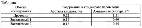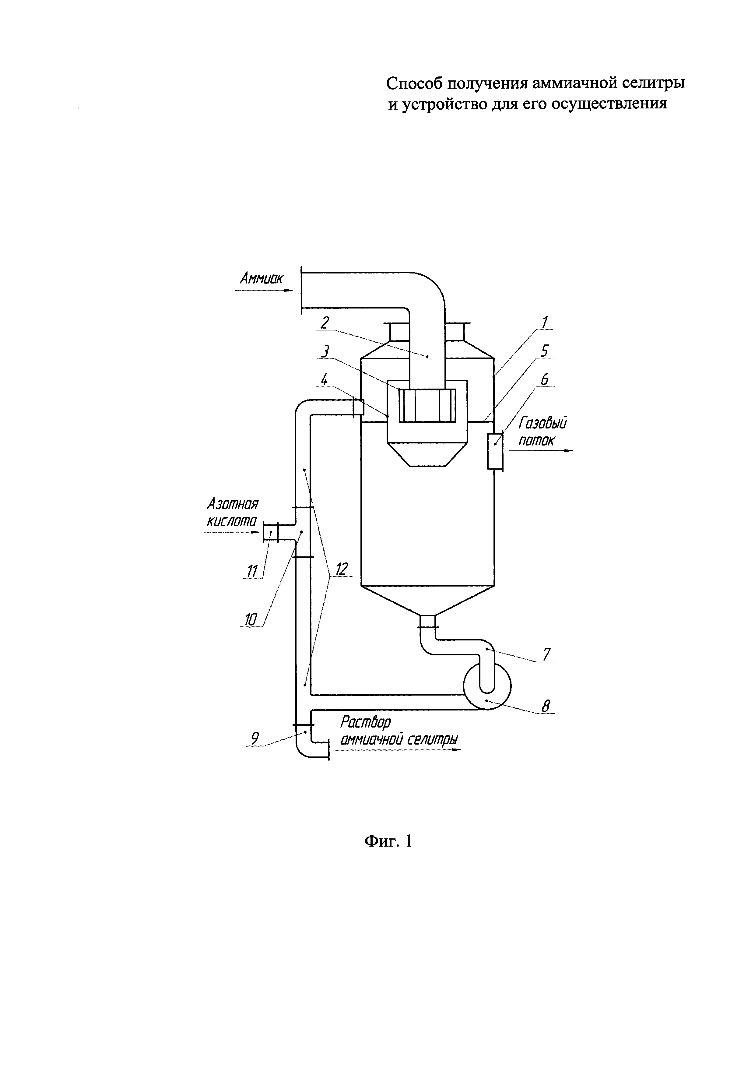 Изобретение относится к неорганической химии, а именно к способу получения аммиачной селитры и устройству для его осуществления. Способ включает нейтрализацию азотной кислоты газообразным аммиаком, причем азотную кислоту и аммиак подают в верхнюю часть корпуса устройства, где газообразный аммиак подают через патрубок в стакан, а азотную кислоту подают посредством контура циркуляции на тарелку. Устройство содержит корпус с патрубком вывода газового потока с размещенным внутри корпуса стаканом, контур циркуляции, включающий всасывающий трубопровод, насос и нагнетательный трубопровод, который содержит патрубок вывода раствора аммиачной селитры, расположенный после насоса до смесителя азотной кислоты, и смеситель азотной кислоты с патрубком подачи азотной кислоты. Корпус устройства выполнен цилиндрической формы. В верхней части корпуса расположена тарелка, по центру которой установлена обечайка, внутри обечайки размещен стакан. Боковая поверхность стакана выполнена из пластин с образованием тангенциальных щелей. Корпус сверху имеет патрубок подачи газообразного аммиака в стакан, при этом нагнетательный трубопровод соединен с корпусом сбоку над тарелкой, патрубок вывода газового потока расположен в боковой части корпуса под тарелкой, а всасывающий трубопровод соединен с низом корпуса. Технический результат заключается в повышении производительности и уменьшении содержания аммиачной селитры и азотной кислоты в выходящем газовом потоке. 2 н.п. ф-лы, 1 ил., 1 табл.