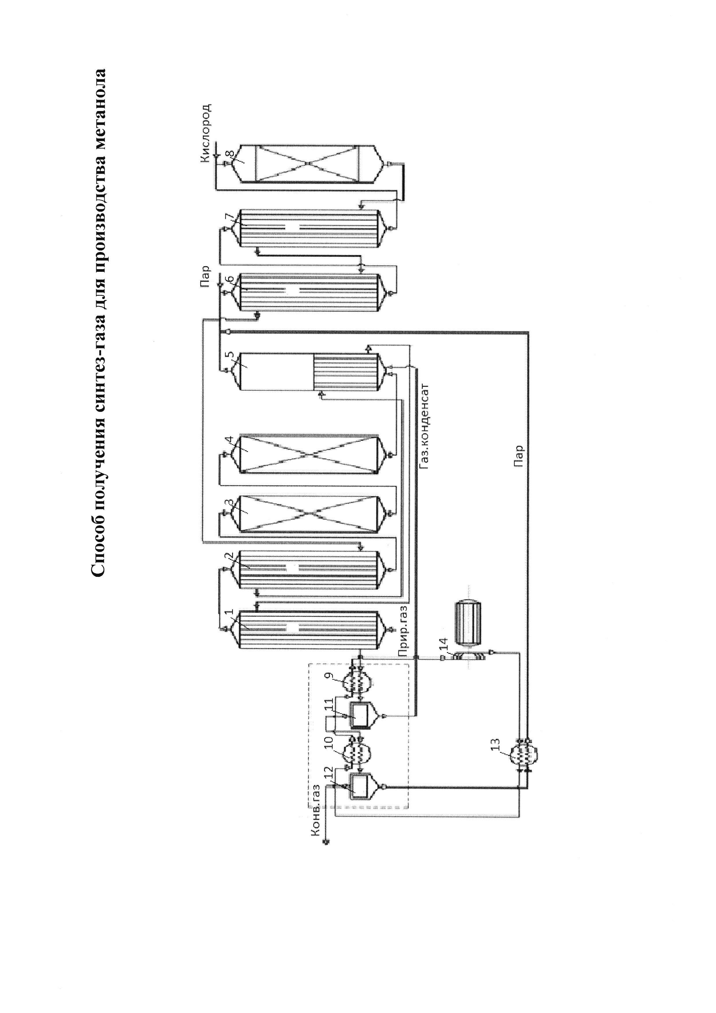 Изобретение относится к области переработки природного газа, а именно к способу получения синтез-газа для производства метанола. Изобретение относится к способу получения синтез-газа и может быть использовано на предприятиях химической и нефтехимической промышленности, производящих метанол. Известен ряд способов превращения метана в синтез-газ. Широкое промышленное применение имеют следующие технологии: - паровой риформинг метана в синтез-газ (смесь СО, СО2, Н2) для крупнотоннажных производств метанола, более 1000 т/сутки (фирмы Davy Progress Tegnology Великобритания, AG «Лурги», AG «Линда», ГИАП РФ и др.); - автотермический риформинг метана в синтез-газ с предварительным блоком паровой конверсии метана и доокислением в реакторе авториформинга с подачей кислорода (AG «Лурги»), которую можно применить для средних (от 500 т/сутки) и крупнотоннажных производств получения метанола; - процесс «Тандем» российских разработчиков ГИАП, фирма AG «Линда», процесс основан на получении синтез-газа в 2-х реакторах, тепло реакции окисления метана при помощи кислорода используется в трубчатом реакторе парового риформинга, процесс используется для средних (500 т/сутки) и более крупных производств. Недостатком описанных способов и устройств паровой каталитической конверсии природного газа в синтез-газ является то, что в них не предусматриваются технические мероприятия по использованию тепловой и кинетической энергии конвертированного газа на выходе трубчатой печи и шахтного конвертора, не утилизируется низкопотенциальная тепловая энергия технологических потоков. Известен способ получения синтез-газа по патенту 2191743 Российской Федерации, МПК С01В 3/34, B01J 7/00. Способ получения синтез-газа и устройство для его осуществления / Плаченов Б.Т.; заявитель и патентообладатель Плаченов Б.Т. - N 2000124815/12; заявл. 26.09.00; опубл. 26.09.00. Способ получения синтез-газа включает смешивание углеводородного сырья с воздухом в соотношении, соответствующем коэффициенту избытка окислителя α менее 1, принудительное воспламенение воздушно-углеводородной смеси и парциальное окисление углеводородного сырья кислородом воздуха в реакционной зоне, расширение и охлаждение с последующим выводом продуктов процесса, содержащих синтез-газ, и введение новой порции углеводородного сырья и воздуха, при этом подогрев углеводородного сырья и воздуха осуществляют при повышенных давлении и температуре, на 50-100°С ниже температуры самовоспламенения их смеси, процесс парциального окисления углеводородного сырья проводят в проточной камере горения, при этом принудительное воспламенение проводят при коэффициенте избытка окислителя α=0,6-0,7 и после прогрева проточной камеры горения соотношение кислорода к углеводородному сырью доводят до уровня α=0,30-0,56. При этом процесс охлаждения продуктов парциального окисления, выходящих из реакционной зоны, проводят со скоростью не менее 3000°С/с. Основным недостатком является получение «бедного», сильно разбавленного азотом воздуха, синтез-газа, а также невозможность регулирования в нем соотношения водорода и монооксида углерода, что ведет к повышению расходных коэффициентов по углеводородам при производстве метанола. Известен также способ получения синтез-газа по патенту 2120913 Российской Федерации, МПК С01В 3/36. Способ получения синтез-газа / Генкин В.Н.; за
