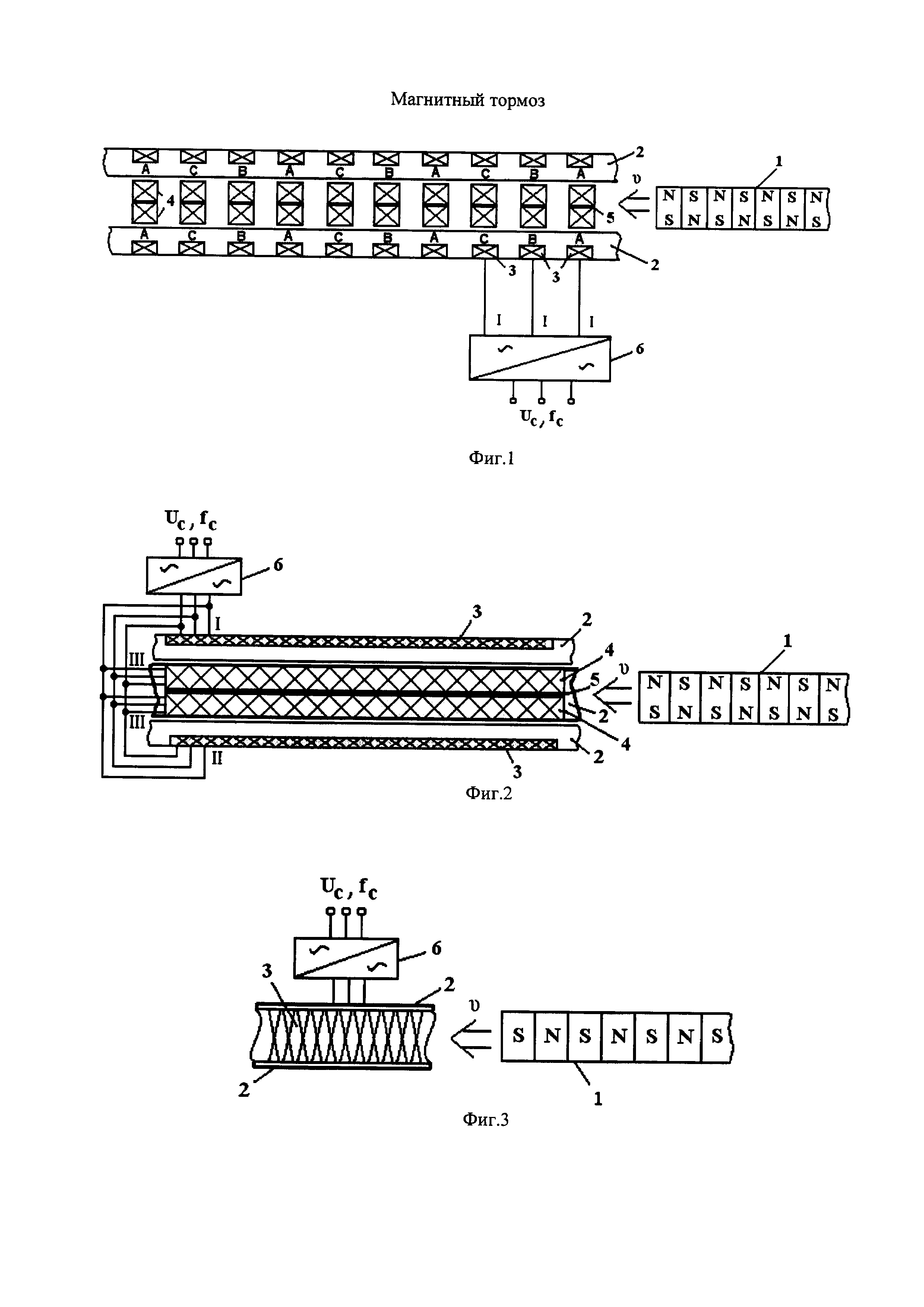 1. Магнитный тормоз, содержащий токопроводящую реактивную шину, образованную из медного материала, установленную на основании; постоянные с чередующейся полярностью магниты, прочно закрепленные в линию на нижней, с усиленной жесткостью, части тормозимого движущегося средства, которые установлены с возможностью расположения этой линии постоянных магнитов вдоль токопроводящей шины магнитного тормоза при следовании тормозимого средства к месту торможения, отличающийся тем, что он содержит токопроводящую медную шину, выполненную с одной горизонтальной стенкой и не более чем с тремя установленными на ней вертикальными стенками; а также дополнительно содержит установленные по длине данной токопроводящей шины, в горизонтальной и вертикальных ее стенках, плоские электромагнитные катушки, изготовленные из изолированного медного материала, соединенные между собой по принятой в двигателестроении схеме, и статический обратимый полупроводниковый частотный преобразователь двухзвенного типа, образующий трехфазный источник переменного тока с регулируемой его частотой и амплитудой, причем эти электромагнитные катушки соединены между собой таким образом, что при подключении их соответствующих выводов к данному полупроводниковому преобразователю образуется бегущее вдоль токопроводящей реактивной медной шины переменное, соответствующей направленности, электромагнитное поле; токопроводящая медная шина образована таким образом, что две вертикальные поверхности ее противоположных друг другу вертикальных стенок совместно с поверхностью примыкающей к ним снизу горизонтальной стенки образуют П-образный перевернутый профиль; число линий постоянных магнитов равно числу этих образованных П-образных профилей, а каждая линия постоянных магнитов установлена с возможностью расположения между всеми поверхностями данного П-образного профиля, с их плоскими электромагнитными катушками в стенках, при следовании тормозимого средства к месту торможения; при этом плоские электромагнитные катушки токопроводящей медной шины, расположенные в горизонтальной стенке ее П-образном профиле, разделены каждая на две части продольной, вдоль длины магнитного тормоза, вертикальной немагнитной переборкой, которая расположена таким образом, что каждая из этих частей находится под левой или соответственно правой стороной линии с чередующейся полярностью постоянных магнитов; причем постоянные магниты выполнены из редкоземельного материала. 2. Магнитный тормоз по п. 1, отличающийся тем, что каждая из электромагнитных плоских катушек, установленных в горизонтальной и вертикальных стенках токопроводящей медной шины, выполнена в форме параллелепипеда с прямоугольными гранями, отстоящего на расстоянии от такого же параллелепипеда, смежного с ним. 3. Магнитный тормоз по п. 1, отличающийся тем, что плоские электромагнитные катушки, установленные в горизонтальной и вертикальных стенках токопроводящей медной шины, выполнены каждая в форме параллелепипеда с прямоугольными гранями, расположены в данных стенках с примыканием друг к другу по своим торцам и образуют в них совместно единый изолированный корпус в форме прямоугольного параллелепипеда с прямоугольными гранями.