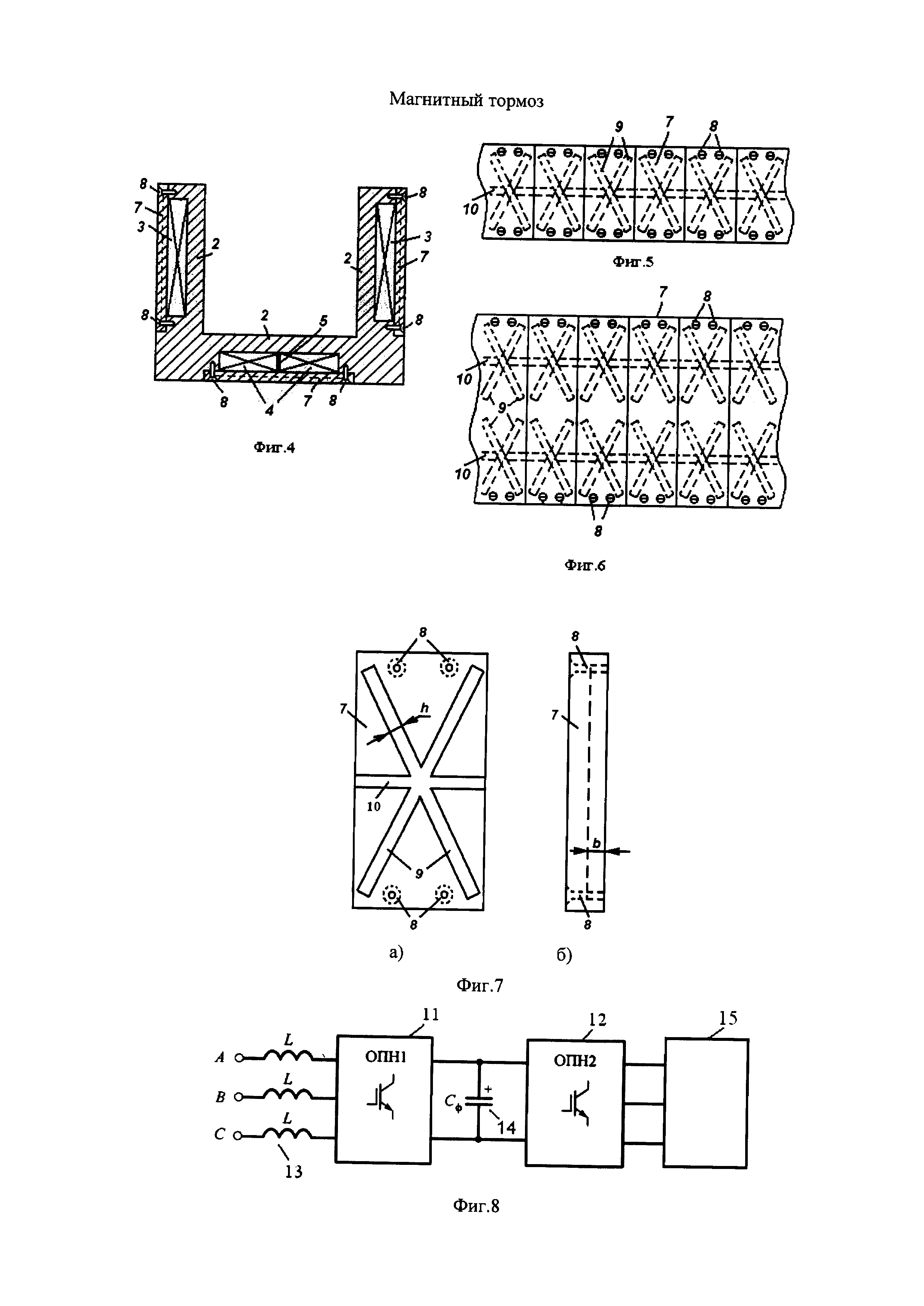 периода, т.е. образуют симметричную трехфазную систему ЭДС. Фазы обмотки могут соединяться между собой традиционно в звезду или в треугольник (не показано). Таким образом, в совокупности все электромагнитные катушки каждой стенки образуют трехфазную обмотку возбуждения. Причем все три фазы каждой стенки соединены между собой параллельно (фиг. 2) и электрически подключены к сети переменного тока через статический обратимый полупроводниковый частотный преобразователь двухзвенного типа (6).