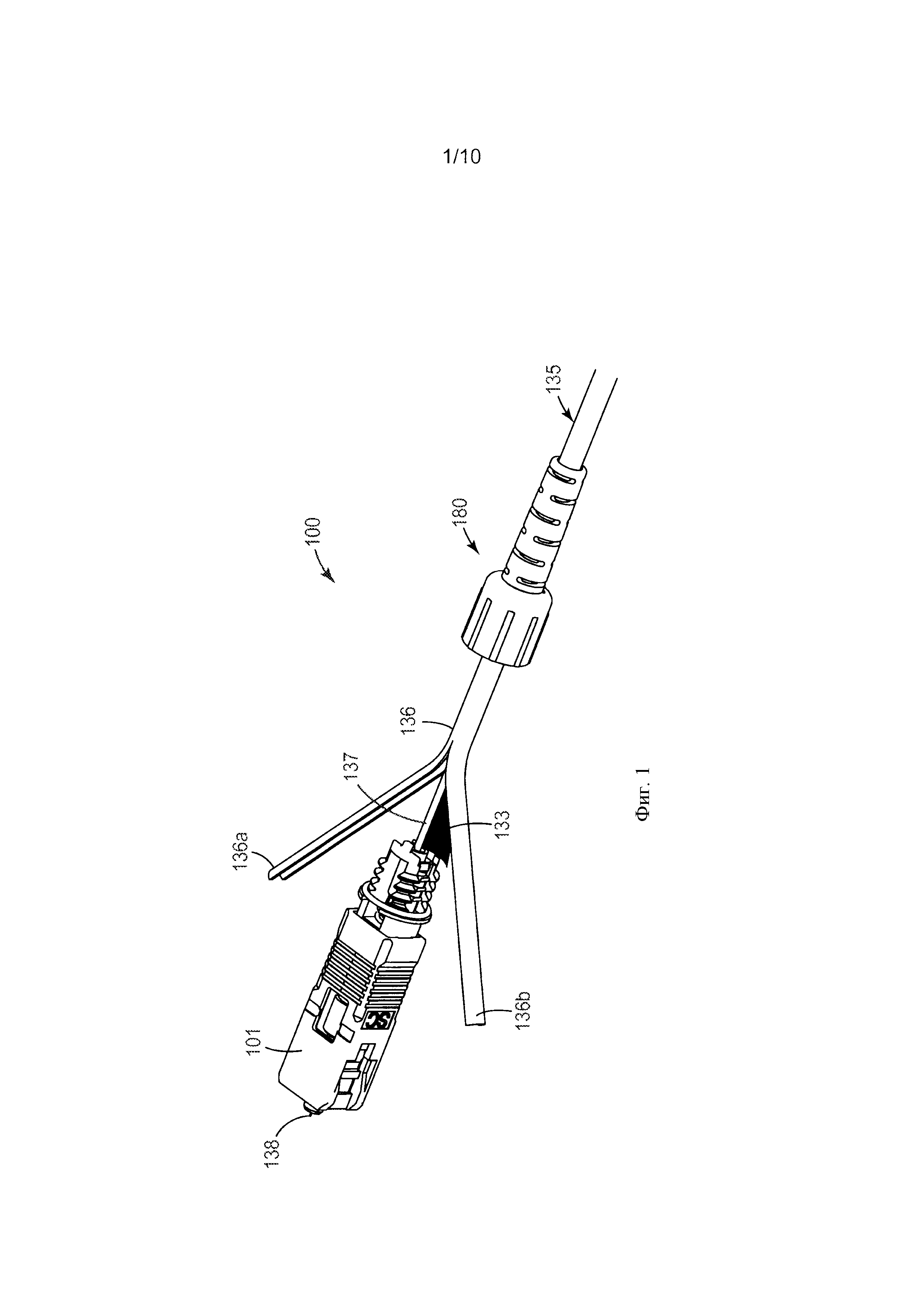 Оптическое волокно, такое как волоконно-оптический кабель 135, может быть подготовлено путем зачистки и скола (плоского или под углом) с тем, чтобы обнажить конец под оконцовку оптического волокна. Перед операциями зачистки и скола, на волоконно-оптический кабель может быть установлен хвостовик 180 для оптического волокна. Кроме того, внешняя оболочка волоконно-оптического кабеля может быть разрезана на два участка 136а и 136b оболочки при помощи инструмента для разрезания кабеля или для продольного разрезания оболочки. После разрезания оболочки 136 кабеля, участки оболочки усиливающие элементы 133 могут быть отведены назад. После зачистки участка буферного покрытия 137 оптического волокна, при помощи обычного инструмента для зачистки, может быть выполнено скалывание (опционально) при помощи обычного инструмента для скалывания, при этом оптическое волокно удерживается в устройстве 270 держателя оптического волокна. В зависимости от предполагаемого применения, скол может быть плоским или под углом. Например, для выполнения скола под углом может быть использован коммерчески доступный инструмент для скалывания оптического волокна, такой как инструмент типа Ilsintech MAX CI-08, поставляемый фирмой Ilsintech, Корея (не показан).
