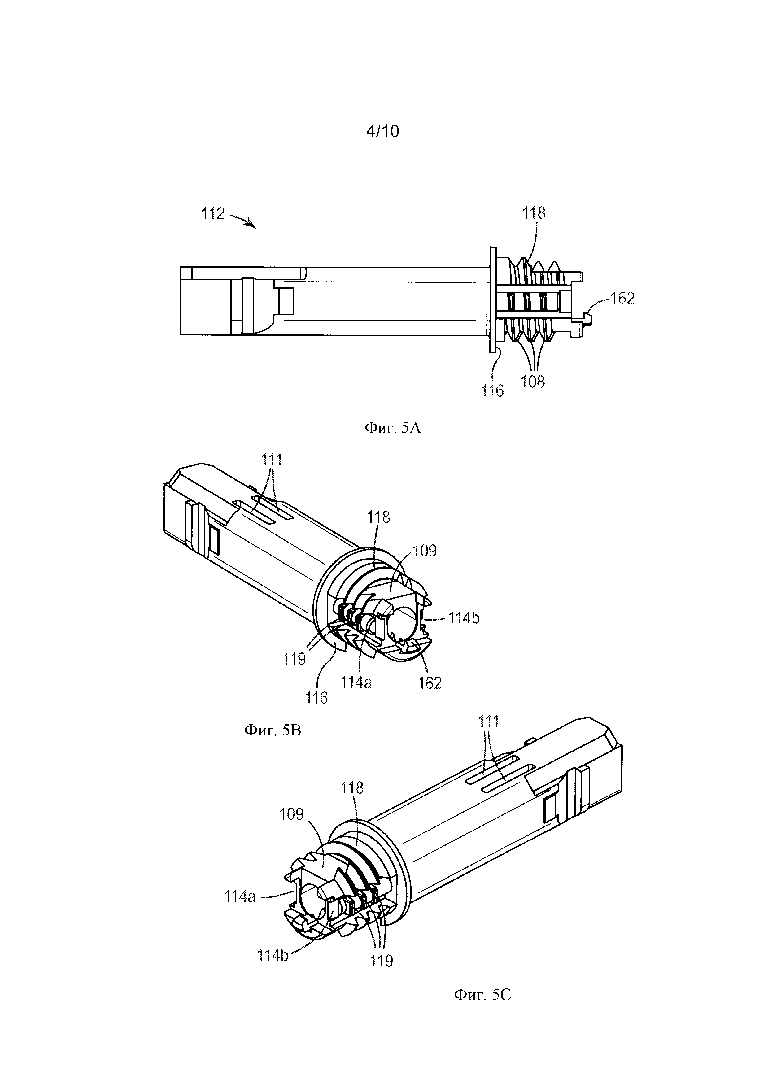 На фиг. 5А - фиг. 5С показаны различные виды монтажной конструкции 118, расположенной вокруг центрального отверстия у одного конца несущего элемента 112. Монтажная конструкция 118 содержит внешнюю резьбу 108, расположенную на ее наружной поверхности и предназначенную для взаимодействия с соответствующей внутренней резьбой 184 хвостовика 180 (см. фиг. 4В). Кроме того, как будет подробно разъяснено ниже, в соответствии с одним из примеров воплощения настоящего изобретения, оболочка оптического волокна 135 может быть захвачена и зафиксирована между монтажной конструкцией 118 и хвостовиком 180 коннектора. Для этого монтажная конструкция 118 дополнительно включает, по меньшей мере, один карман, в данном воплощении, области 114а и 114b углублений, предназначенные для размещения частей разрезанной на полосы внешней оболочки. Как показано на фиг. 6, на котором приведен вид оптического коннектора 100 без хвостовика 180, в областях 114а и 114b углублений могут размещаться части 136а и 136b разрезанной на полосы внешней оболочки, при этом внешняя резьба 108 монтажной конструкции предназначена для соединения с внутренней резьбой хвостовика. Обратившись снова к фиг. 5А - фиг. 5С, можно увидеть, что каждая из областей 114а и 114b углублений может включать одну или более возвышающихся поверхностей или зубцов 119, которые способствуют дополнительной фиксации частей разрезанной на полосы внешней оболочки волоконно-оптического кабеля в пределах монтажной конструкции 118, когда хвостовик 180 для оптического волокна навинчен на монтажную конструкцию 118.