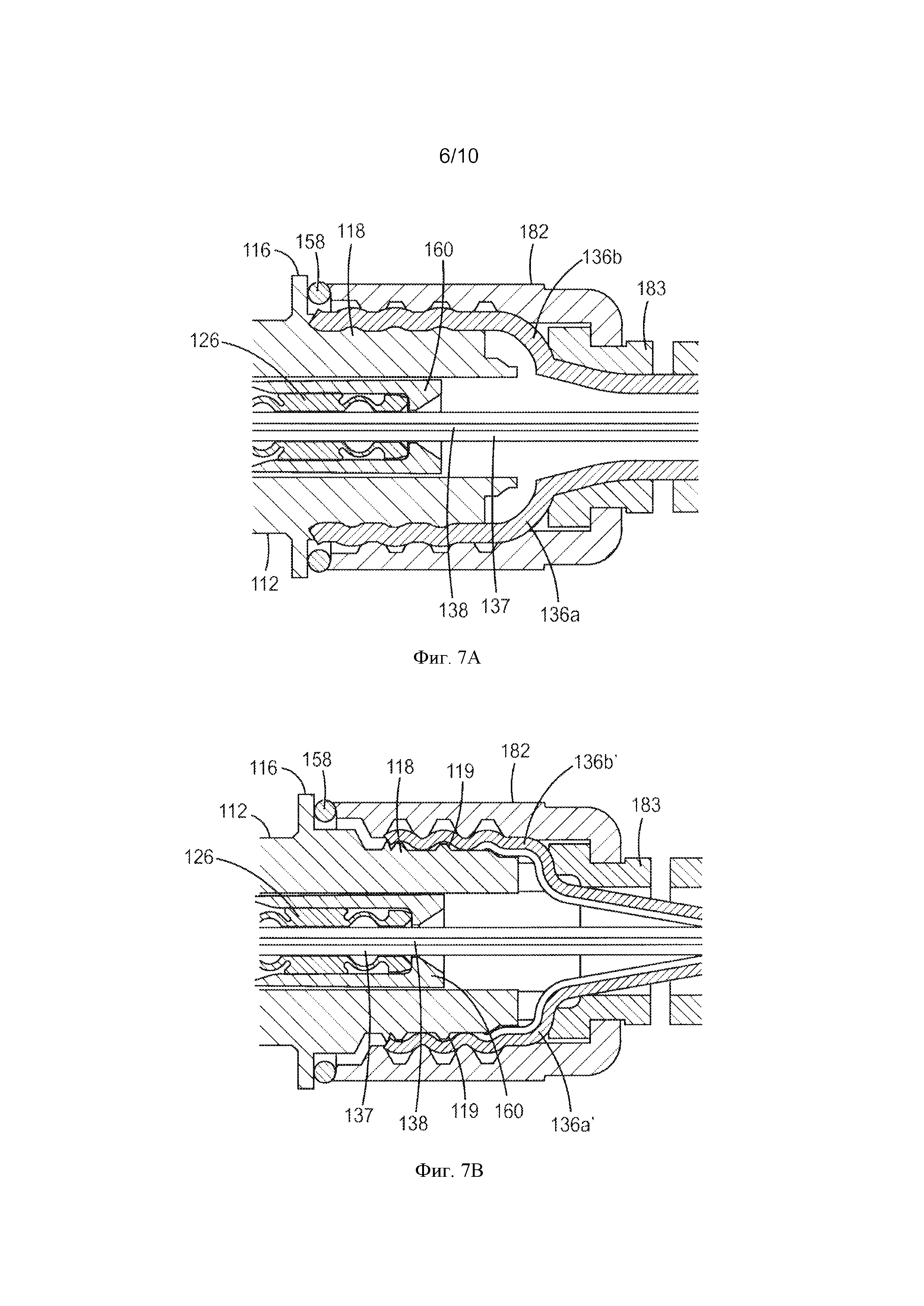 В соответствии с одним из примеров воплощения настоящего изобретения, коннектор 100 предназначен для размещения волоконно-оптических кабелей с различными диаметрами внешней оболочки. Как показано на фиг. 7А и фиг. 7В, коннектор 100 предусматривает возможность захвата волоконно-оптического кабеля, имеющего сравнительно толстую внешнюю оболочку оптического волокна (см. фиг. 7А) и волоконно-оптического кабеля, имеющего значительно более тонкую внешнюю оболочку оптического волокна (см. фиг. 7В). На фиг. 7А показан волоконно-оптический кабель, имеющий части 136а и 136b разрезанной на полосы внешней оболочки, зафиксированные между областью гайки 182 хвостовика для оптического волокна и монтажной конструкцией 118 несущего элемента 112. Разделенные участки оболочки могут быть размещены в углублениях 114а и 114b, описанных выше, при этом зубцы 119 и внутренняя резьба 184 хвостовика позволяют удерживать части разрезанной на полосы оболочки. В соответствии с данным примером воплощения настоящего изобретения, внешняя оболочка кабеля имеет внешний диаметр порядка 3 мм (в данном случае, стандартный внешний диаметр 2,9 мм). Примеры волоконно-оптического кабеля, имеющего такой внешний диаметр, включают кабель типа AllWave Flex, поставляемый фирмой OFS и кабель типа BendBright Elite, поставляемый фирмой Prysmian Group. Глубина углублений обеспечивает эргономически приемлемую величину момента затяжки (в данном воплощении, от примерно 24 до примерно 48 дюймов-унций), требуемого для полного закручивания гайки 182.