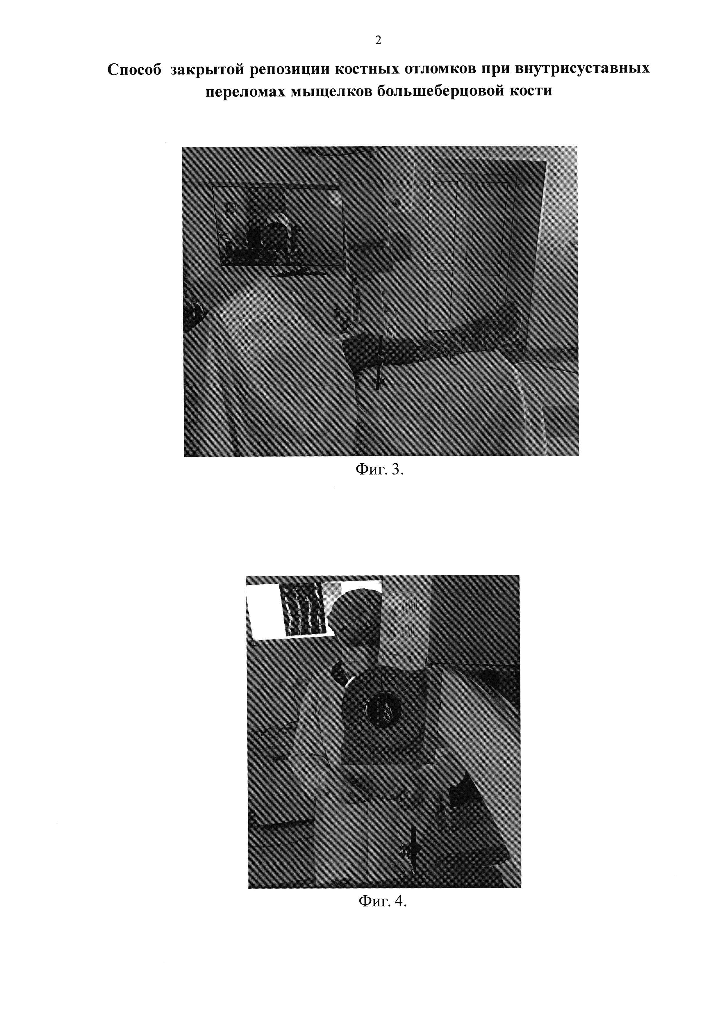 Изобретение относится к медицине, а именно к травматологии и ортопедии, и может быть использовано для репозиции костных отломков при внутрисуставных переломах большеберцовой кости. В последние годы частота тяжелых внутрисуставных повреждений мыщелков проксимального метаэпифиза большеберцовой кости постоянно возрастает и достигает 60% от травм всех суставов и 2-5% от всех повреждений скелета (Кузина И.Р. Роль магнитно-резонансной томографии в выявлении «скрытых» внутрисуставных переломов коленного сустава. - Новые технологии в медицине: тез. науч.-практ. конф. - Курган, 2000. - С. 151-153). Зачастую такие травмы носят высокоэнергетический характер со значительным смещением костных отломков, а их репозиция достаточно сложна в силу технической сложности интраоперационной визуализации (French В., Tornetta Р. / High-energy tibial shaft fractures // Orthop. Clin. North Am. - 2002. - Vol. 33. - P. 211). Артроскопический контроль репозиции костных отломков при рассматриваемых переломах, приводящих к раскалыванию суставной поверхности, не рекомендуется применять из-за высокого риска развития компартмент синдрома голени вследствие проникновения жидкости из полости коленного сустава в фасциальные футляры голени (Chen X.Z., Liu C.G., Chen Y., Wang L.Q., Zhu Q.Z., Lin P. Arthroscopy-assisted surgery for tibial plateau fractures // Arthroscopy. - 2015.- N 31(1). - P. 143-153). Общепринятая методика интраоперационной рентгенологической визуализации также не дает в рассматриваемых случаях полного представления о точности репозиции костных отломков, так как стандартные проекции, обычно используемые в ходе оперативного вмешательства, не позволяют качественно визуализировать суставную поверхность мыщелков большеберцовой кости. Кроме того, для качественной репозиции необходимо обеспечить возможность перемещения смещенных фрагментов мыщелков большеберцовой кости в трех плоскостях без критической их девитализации (разрушениия), что технически весьма сложно при условии использования стандартных приемов и средств репозиции (Воронкевич И.А. Хирургическое лечение переломов мыщелков большеберцовой кости (экспериментально-клиническое исследование). Диссертация на соиск. уч. степ. д.м.н., СПб, 2010). Известен способ рентгенологической диагностики костных повреждений в области коленного сустава, заключающийся в том, что в положении стоя спиной к источнику рентгеновского излучения пациент прижимает бедра к рентгеновскому столу, а источник рентгеновского излучения центрируется в подколенную ямку с отклонением луча от горизонтального уровня на 10° кверху (Vignon Е., Pireno М., Le Graverand М.Р., Mazzuca S.A., Brandt K.D., Mathieu P. et al. Measurement of radiographic joint space width in the tibiofemoral compartment of the osteoarthritic knee: comparison of standing anterioposterior and Lyon schuss views. - Arthritis Rheum. - 2003. - N. 48. - P. 378-384.; Conrozier Т., Mathieu P., Piperno M., Prowedini D., Taccoen A., Colson F. et al. Lyon schuss radiographic view of the knee: utility of fluoroscopy for the quality of tibial plateau aligement. - J Rheumatol. - 2004. - N. 31. - P. 584-590.) Однако недостатком указанной методики является невозможность интраоперационного ее использования в положении больного лежа на спине. Известен также способ рентгенологической диагностики повреждений области коленного сустава, заключающийся в том, что при выпрямленной в коленном суставе нижней конечности источник рентгеновского излучения ориентируют перпендикулярно длинной оси конечности с центрацией его на суставную щель коленного сустава (Соколов В.М. Атлас укладок при выполнении рентгеновских сн
