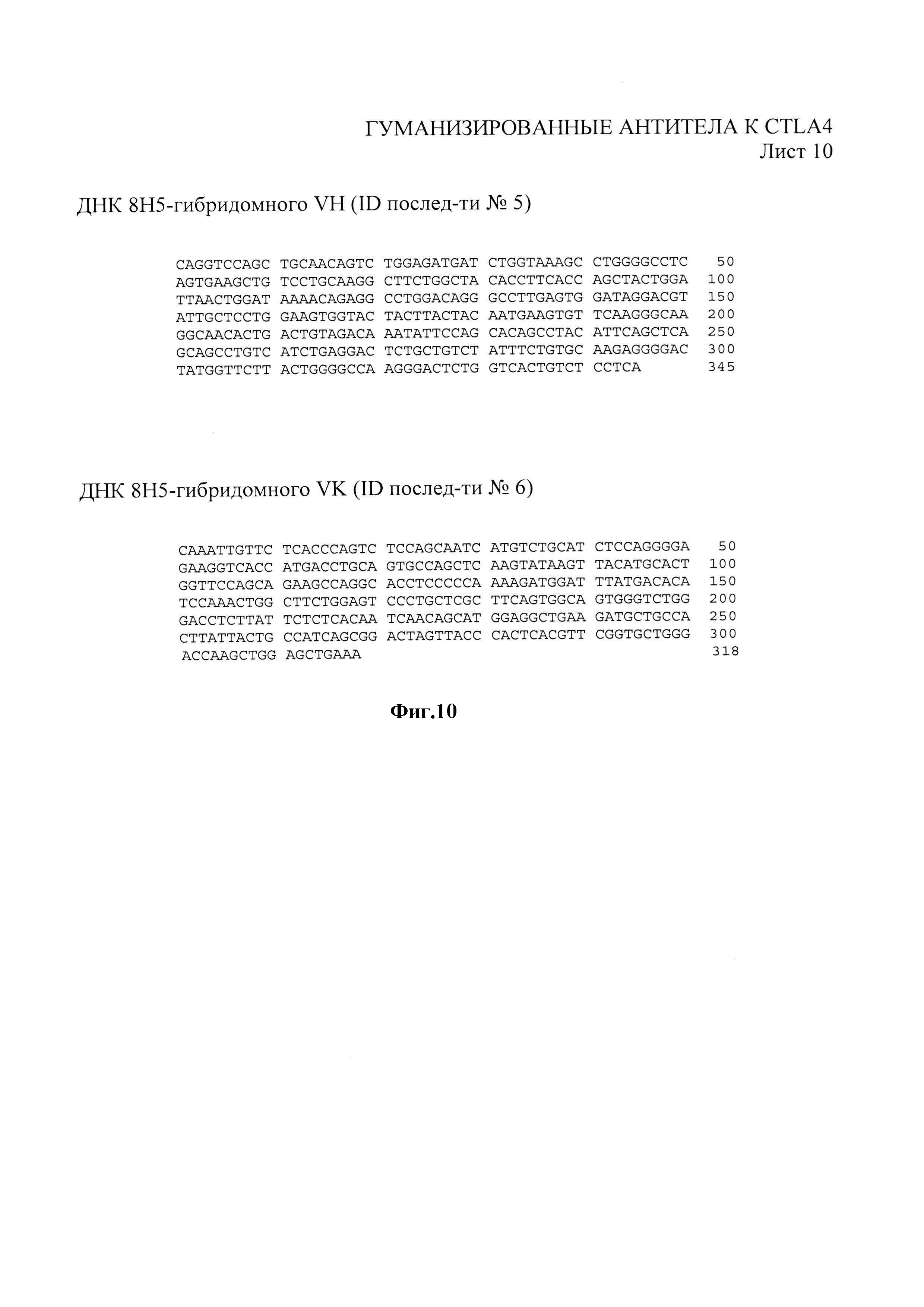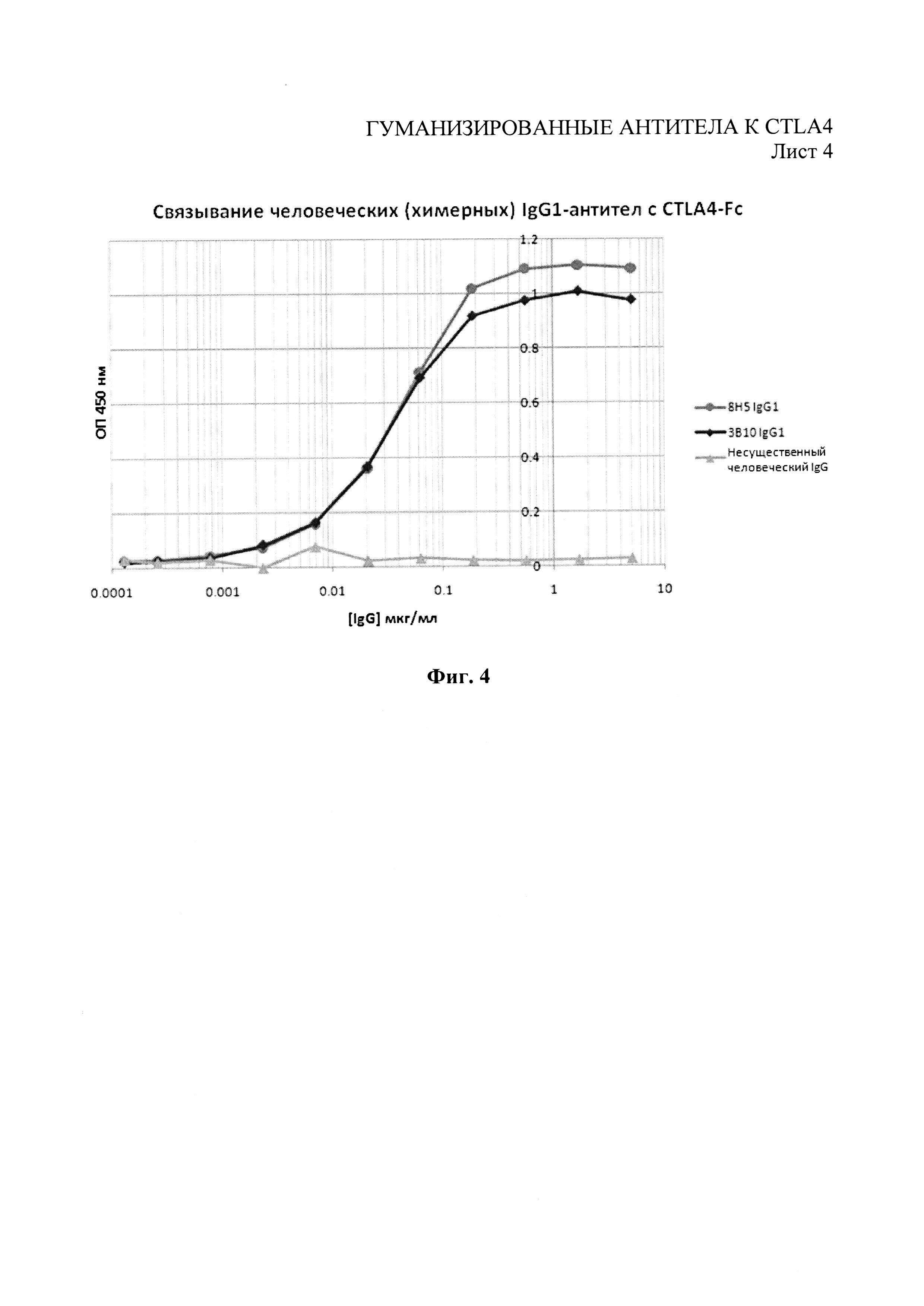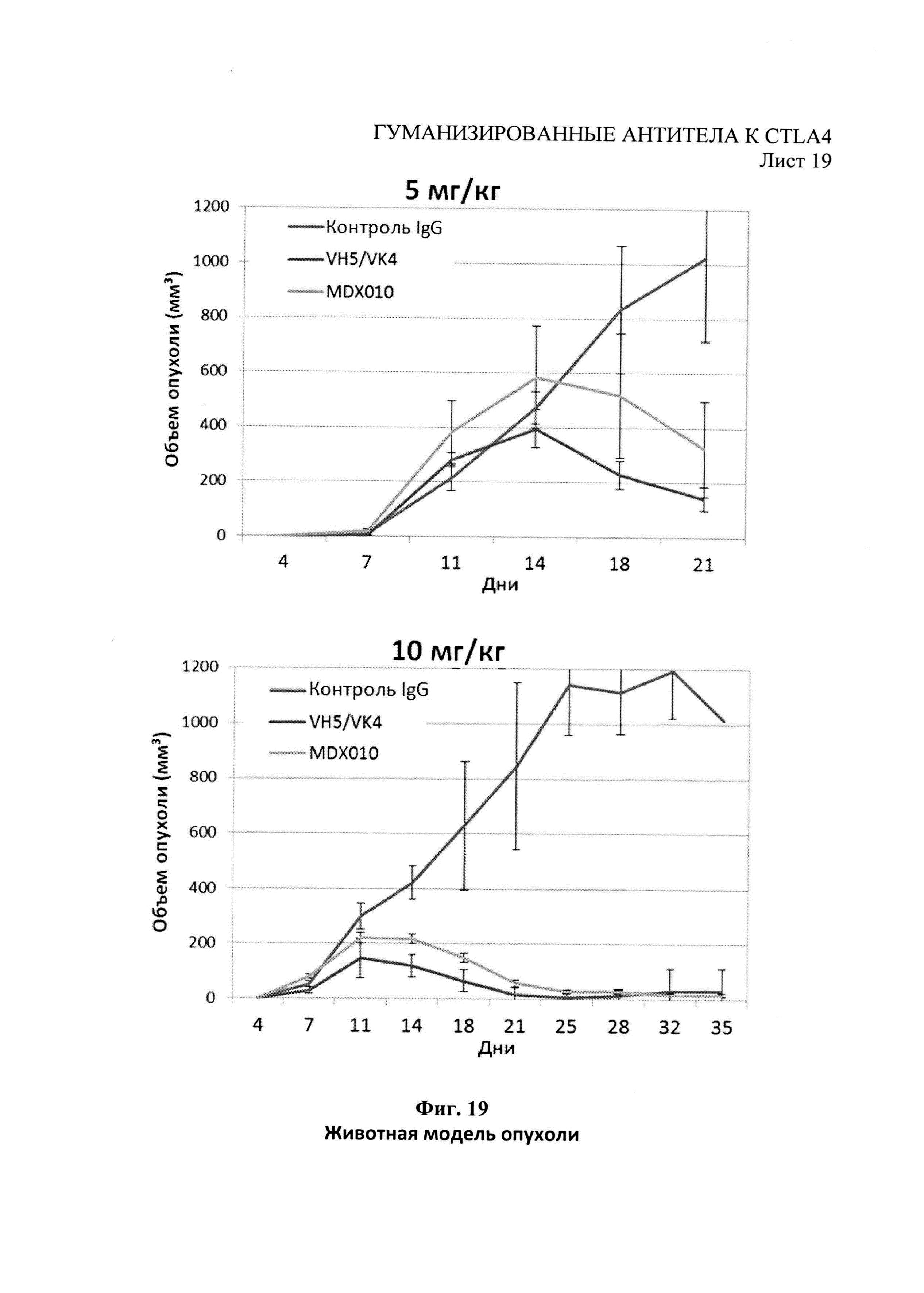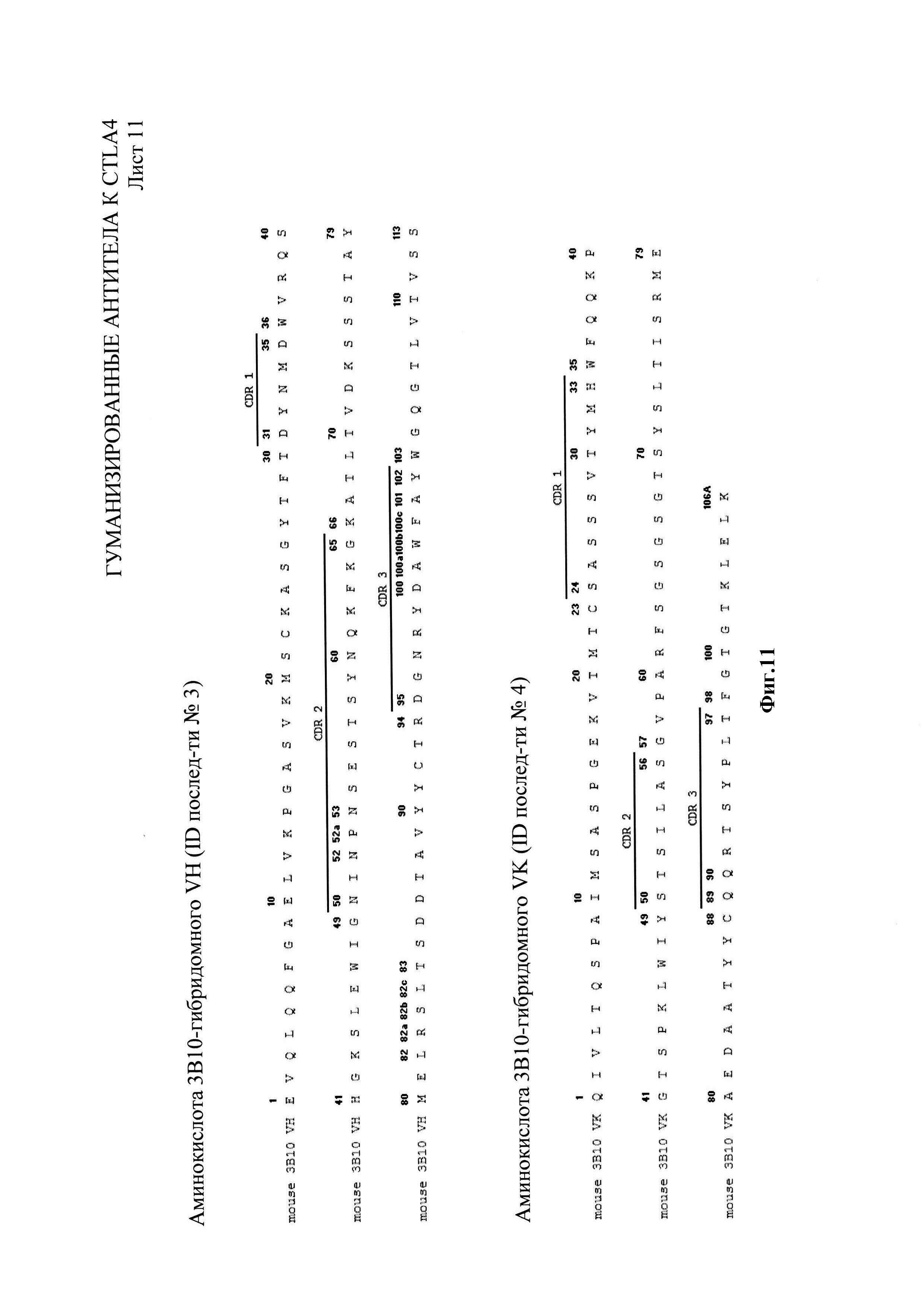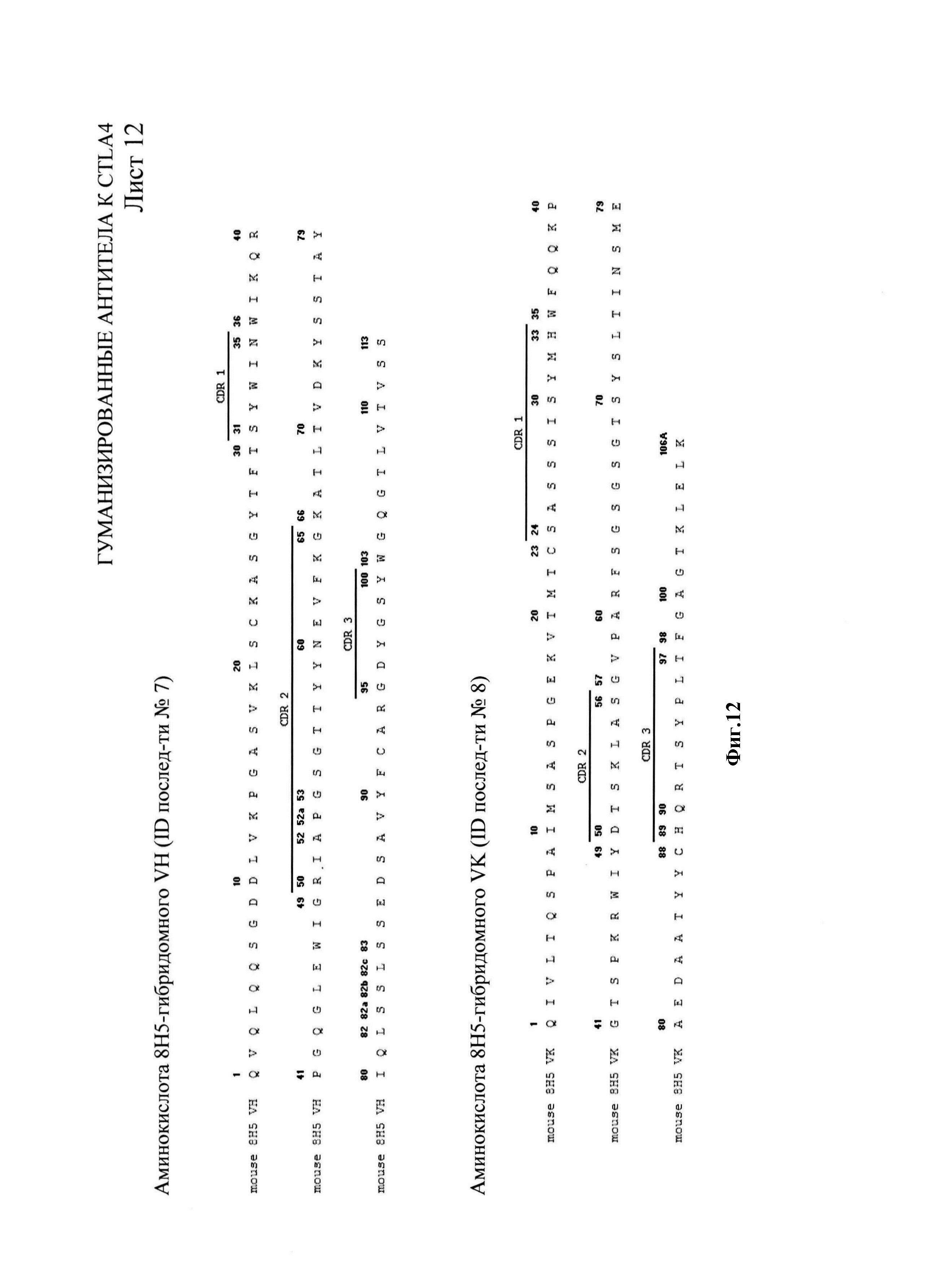 Область техники, к которой относится изобретение Данное изобретение относится к новым гуманизированным антителам против человеческого CTLA4 для лечения и профилактики заболеваний у людей, а также к способам лечения или профилактики заболеваний у людей при помощи таких антител. Уровень техники Иммунная система позвоночных требует множественных молекулярных и клеточных взаимодействий для достижения оптимальных иммунных ответов. В частности, активация Т-лимфоцитов (Т-клеток) является очень важным компонентом многих таких ответов. Антигенпредставляющие клетки (АРС) могут активировать Т-клетки путем представления антигенов через пептиды, переносимые молекулами главного комплекса гистосовместимости (МНС) к Т-клеточным рецепторам (TCR). Для такой активации также необходима дополнительная стимуляция антигенпредставляющими клетками. Для доставки неспецифического костимулирующего сигнала к Т-клеткам также требуется присутствие по меньшей мере двух гомологичных членов семейства В7 в антигенпредставляющей клетке, В7-1 (также именуемый В7, В7.1, или CD80) и В7-2 (также именуемый В7.2 или CD86), оба из которых могут передавать костимулирующие сигналы при связывании с антигеном CD28 в Т-клетках, что приводит к активации Т-клетки. CD28 является гомодимерным гликопротеиновым членом суперсемейства иммуноглобулинов (Ig) с одной внеклеточной вариабельной областью и присутствует в большинстве зрелых Т-клеток. Гомолог CD28, который был назван CTLA4 (антиген 4 цитотоксических Т-лимфоцитов, Cytotoxic Lymphocyte Associated Antigen; также был назван CD152) был открыт в 1987 г. (Brunet et al., (1987) Nature 328:267-270), и была выявлена его особая связь с цитотоксическими Т-клетками. Так же как и CD28, CTLA4 является членом суперсемейства иммуноглобулинов и содержит один внеклеточный домен Ig. Однако основной ролью CTLA4 является ингибирование активации Т-клеток, и это было доказано на мышах с дефицитом CTLA4 (Chambers et al., (1997) Immunity. 7:8855-8959), у которых наблюдалась тяжелая лимфопролиферация. Кроме этого, была продемонстрирована блокада CTLA4 для усиления ответов Т-клеток in vitro (Walunas et al., (1994) Immunity. 1:405-413) и in vivo (Keamey (1995) J. Immunol. 155:1032-1036), а также для повышения противоопухолевого иммунитета (Leach (1996) Science. 271:1734-1736). Следовательно, блокада CTLA4 может стать новым подходом в лечении заболеваний, особенно заболеваний человека, где может быть полезной иммуностимуляция, таком как лечение различных видов рака и инфекционных заболеваний. При разработке блокаторов функции CTLA4 внимание было сосредоточено на использовании моноклональных антител, особенно антител, полученных из трансгенных мышей, которым были внедрены гены, кодирующие человеческие иммуноглобулины (и с дефицитом генов иммуноглобулина мыши-хозяина). Продолжаются клинические испытания с такими антителами, в том числе с ипилимумабом (Keler et al., J Immunol 171:6251-6259(2003)), который является изотипом IgG1, и тремелимумабом (Ribas et al., Oncologist 12: 873-883(2005)), который является изотипом IgG2. В то время как иммуногенность (индукция антител против введенных человеческих моноклональных антител), по сообщениям, достаточно низка, ученые обеспокоены, что такие человеческие антитела, благодаря соматическим мутациям и перераспределению в последовательностях вариабельной области (которые могут привести к эпитопам Т-клеток), могут вызвать иммуногенность у некоторых пациентов, что приведет к нежелательным эффект