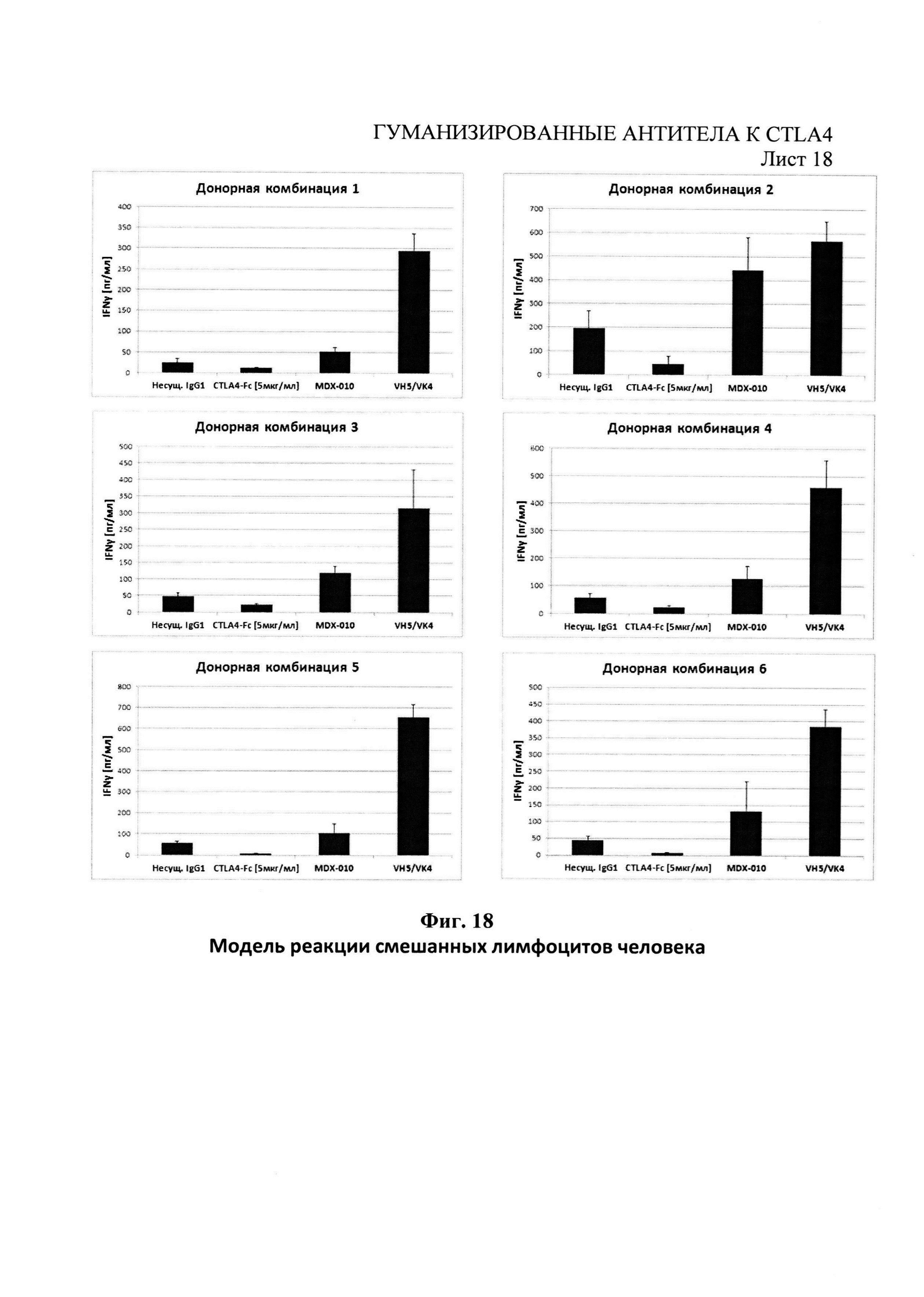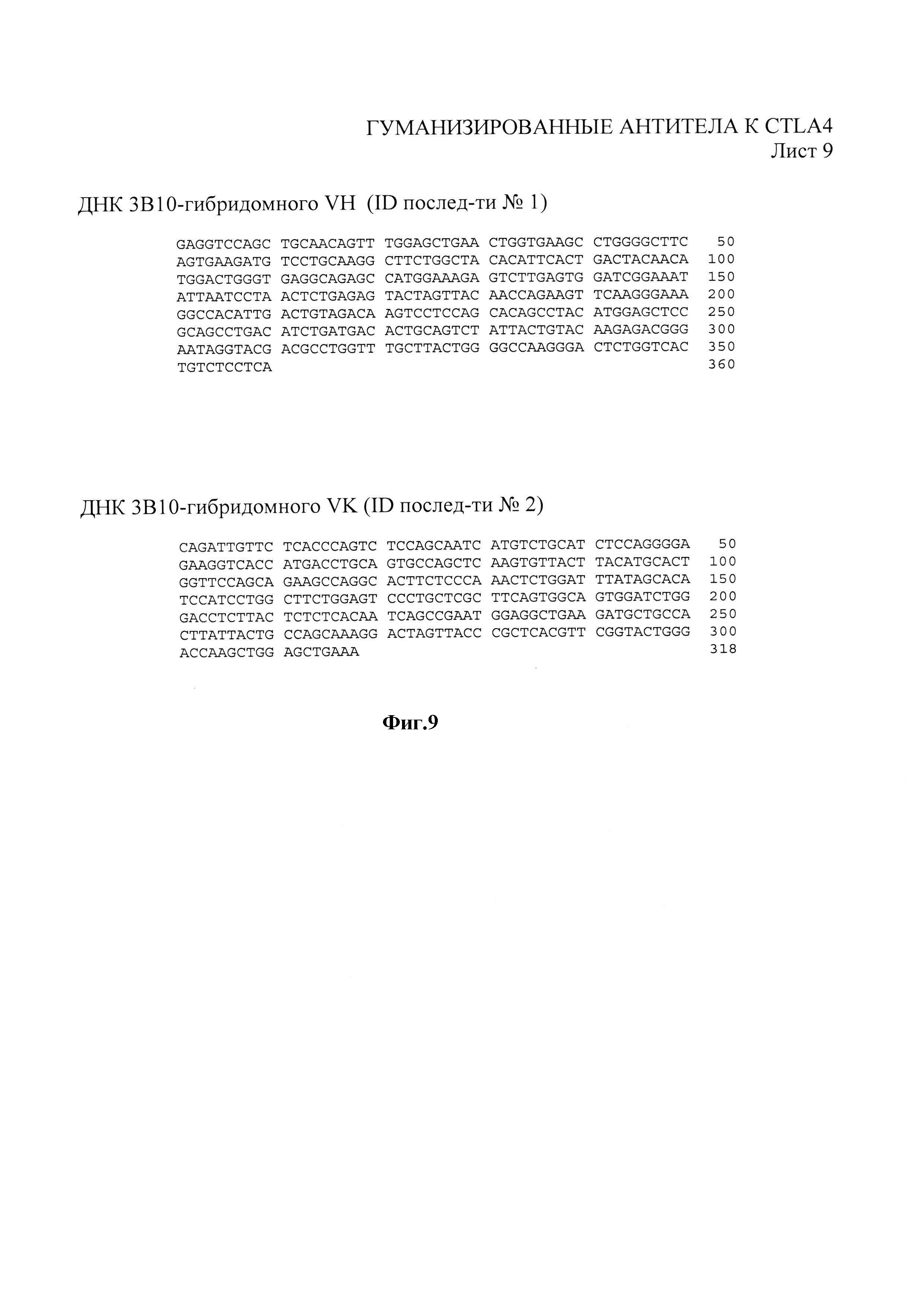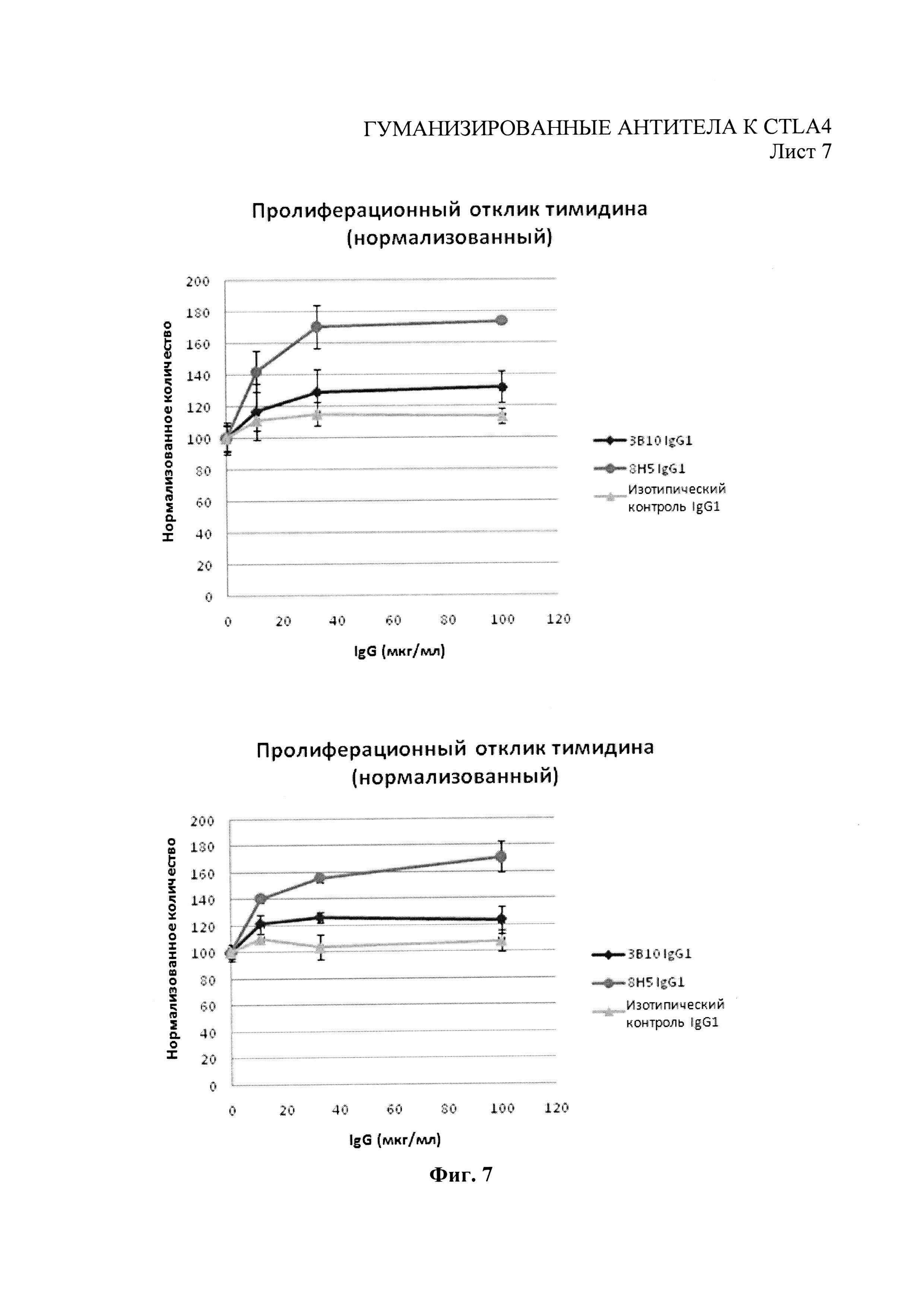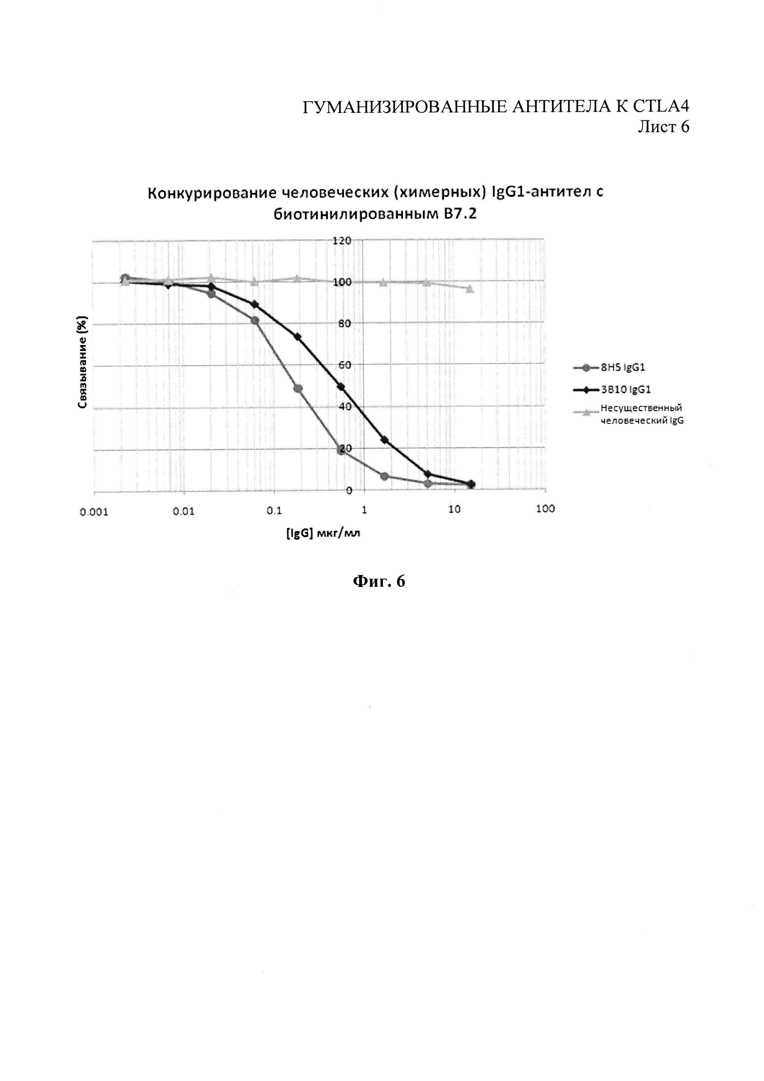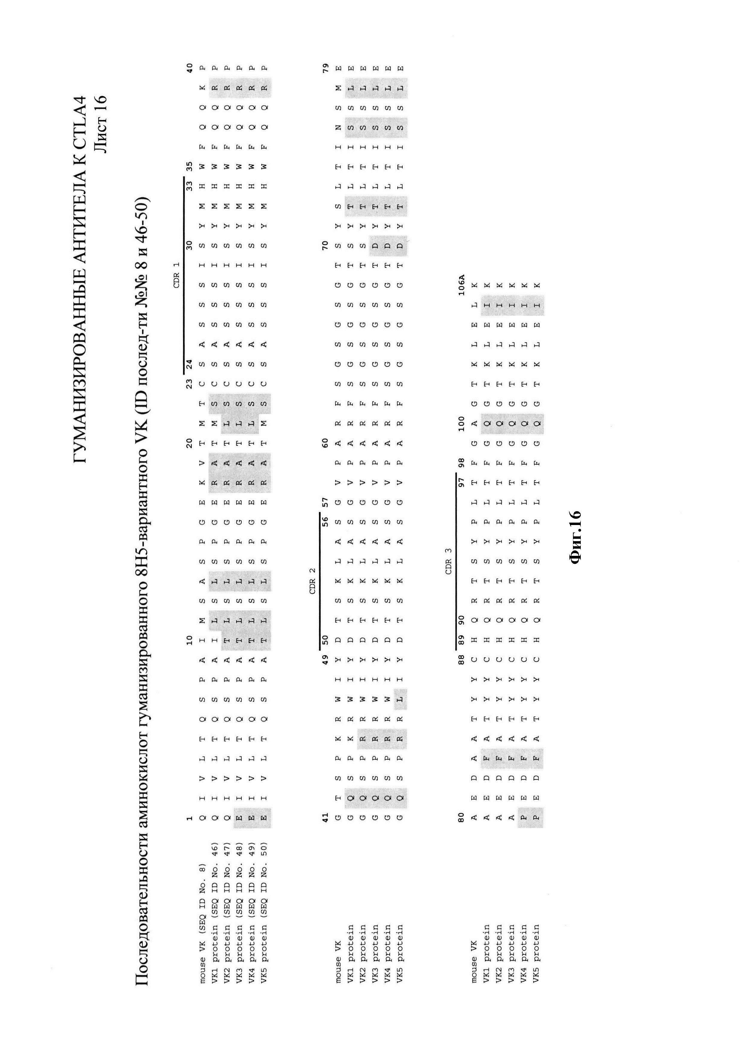 Область техники, к которой относится изобретение Данное изобретение относится к новым гуманизированным антителам против человеческого CTLA4 для лечения и профилактики заболеваний у людей, а также к способам лечения или профилактики заболеваний у людей при помощи таких антител. Уровень техники Иммунная система позвоночных требует множественных молекулярных и клеточных взаимодействий для достижения оптимальных иммунных ответов. В частности, активация Т-лимфоцитов (Т-клеток) является очень важным компонентом многих таких ответов. Антигенпредставляющие клетки (АРС) могут активировать Т-клетки путем представления антигенов через пептиды, переносимые молекулами главного комплекса гистосовместимости (МНС) к Т-клеточным рецепторам (TCR). Для такой активации также необходима дополнительная стимуляция антигенпредставляющими клетками. Для доставки неспецифического костимулирующего сигнала к Т-клеткам также требуется присутствие по меньшей мере двух гомологичных членов семейства В7 в антигенпредставляющей клетке, В7-1 (также именуемый В7, В7.1, или CD80) и В7-2 (также именуемый В7.2 или CD86), оба из которых могут передавать костимулирующие сигналы при связывании с антигеном CD28 в Т-клетках, что приводит к активации Т-клетки. CD28 является гомодимерным гликопротеиновым членом суперсемейства иммуноглобулинов (Ig) с одной внеклеточной вариабельной областью и присутствует в большинстве зрелых Т-клеток. Гомолог CD28, который был назван CTLA4 (антиген 4 цитотоксических Т-лимфоцитов, Cytotoxic Lymphocyte Associated Antigen; также был назван CD152) был открыт в 1987 г. (Brunet et al., (1987) Nature 328:267-270), и была выявлена его особая связь с цитотоксическими Т-клетками. Так же как и CD28, CTLA4 является членом суперсемейства иммуноглобулинов и содержит один внеклеточный домен Ig. Однако основной ролью CTLA4 является ингибирование активации Т-клеток, и это было доказано на мышах с дефицитом CTLA4 (Chambers et al., (1997) Immunity. 7:8855-8959), у которых наблюдалась тяжелая лимфопролиферация. Кроме этого, была продемонстрирована блокада CTLA4 для усиления ответов Т-клеток in vitro (Walunas et al., (1994) Immunity. 1:405-413) и in vivo (Keamey (1995) J. Immunol. 155:1032-1036), а также для повышения противоопухолевого иммунитета (Leach (1996) Science. 271:1734-1736). Следовательно, блокада CTLA4 может стать новым подходом в лечении заболеваний, особенно заболеваний человека, где может быть полезной иммуностимуляция, таком как лечение различных видов рака и инфекционных заболеваний. При разработке блокаторов функции CTLA4 внимание было сосредоточено на использовании моноклональных антител, особенно антител, полученных из трансгенных мышей, которым были внедрены гены, кодирующие человеческие иммуноглобулины (и с дефицитом генов иммуноглобулина мыши-хозяина). Продолжаются клинические испытания с такими антителами, в том числе с ипилимумабом (Keler et al., J Immunol 171:6251-6259(2003)), который является изотипом IgG1, и тремелимумабом (Ribas et al., Oncologist 12: 873-883(2005)), который является изотипом IgG2. В то время как иммуногенность (индукция антител против введенных человеческих моноклональных антител), по сообщениям, достаточно низка, ученые обеспокоены, что такие человеческие антитела, благодаря соматическим мутациям и перераспределению в последовательностях вариабельной области (которые могут привести к эпитопам Т-клеток), могут вызвать иммуногенность у некоторых пациентов, что приведет к нежелательным эффект