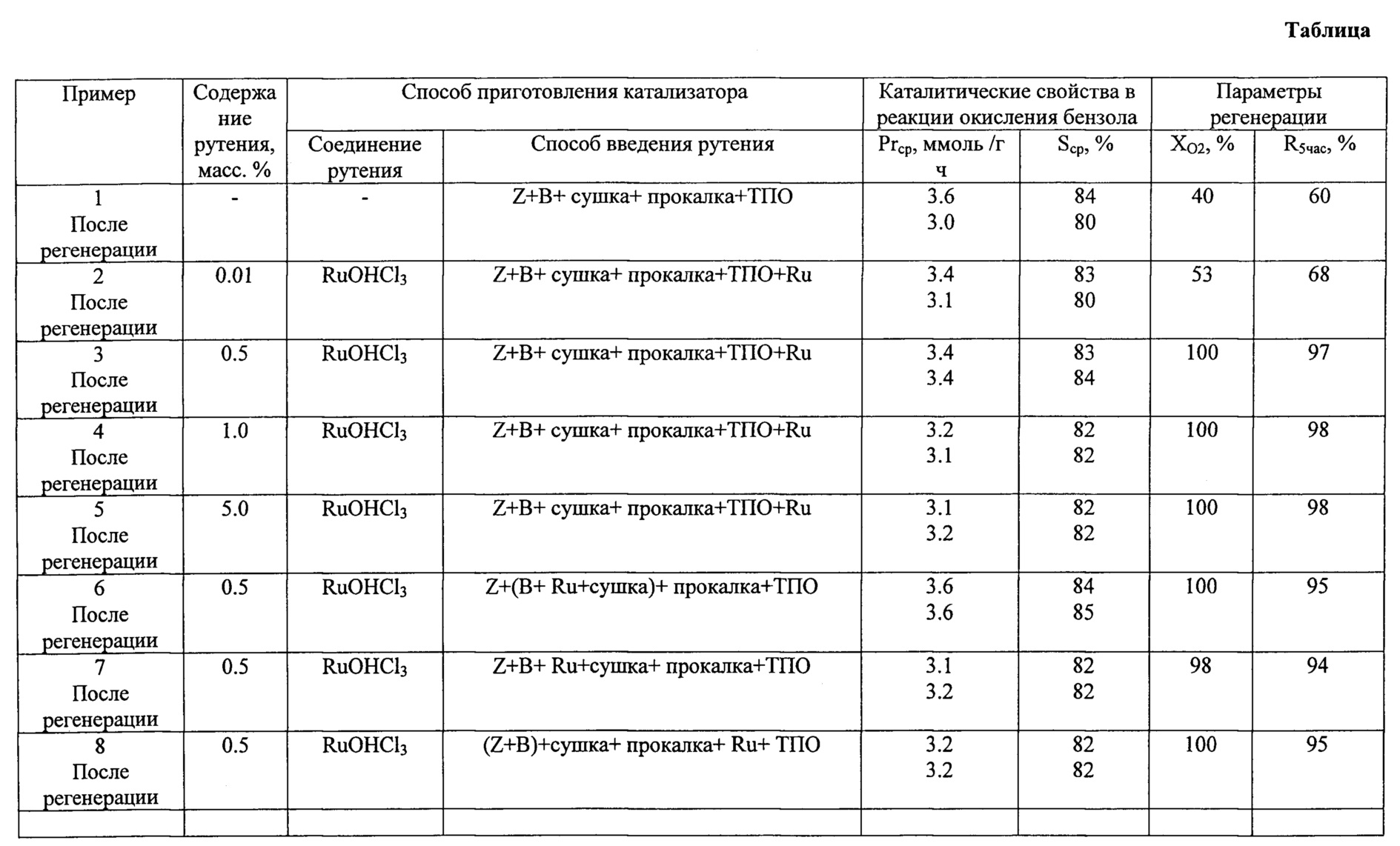 Изобретение касается способа приготовления и регенерации цеолитных катализаторов после их дезактивации в результате закоксовывания в реакциях гидроксилирования ароматических соединений закисью азота в газовой фазе, в частности, в реакциях гидроксилирования бензола и фенола. Известно, что железосодержащие цеолиты типа пентасил (MFI и MEL) являются эффективными катализаторами газофазного гидроксилирования ароматических соединений с применением закиси азота в качестве окислителя [Харитонов А.С., Романников В.Н., Шевелева Г.А., Соболев В.И., Панов Г.И., Ионе К.Г., RU 2010790, 15.04.1994]. Аналогично другим газофазным реакциям на цеолитах, в ходе реакции гидроксилирования закисью азота происходит постепенное снижение активности и селективности катализатора, что связано с процессами коксообразования [Motz J.L., Heinichen Н., Holderich W.F. Direct hydroxylation of aromatics to their corresponding phenols catalysed by H-[AL]ZSM-5 zeolite // J. Molec. Catal. A: Chemical V. 136, 1998, p. 175-184; Иванов Д.П., Родкин M.A., Дубков К.А., Харитонов А.С., Панов Г.И. Механизм влияния кокса на каталитическую активность FeZSM-5 в реакции окисления бензола в фенол // Кинетика и Катализ, 2000, т. 41, №6, с. 850-854; Ivanov D.P., Sobolev V.I., Panov G.I. Deactivation by coking and regeneration of zeolite catalysts for benzene-to-phenol oxidation // Appl Catal A 2003, v. 241, p. 113-121]. Дезактивация цеолитных катализаторов вследствие коксообразования обратима, т.е. каталитическая активность может быть восстановлена путем удаления кокса. Обычно применяют окислительную обработку в воздухе или в инертном газе с добавлением кислорода. Для снижения разогрева слоя катализатора вследствие экзотермических реакций, протекающих при окислении кокса, в промышленности используют сильно разбавленный инертным газом воздух, менее 1 об. % кислорода [Moljord K., Magnoux P., Guisnet М. Coking, aging and regeneration of zeolites. XVI. Influence of the composition of HY zeolites on the removal of coke through oxidative treatment. // Appl. Catal. A. V. 121, 1995, р. 245-259]. В этом случае регенерация протекает медленно, требует серьезного увеличения продолжительности технологического цикла и, как следствие, приводит к снижению производительности катализатора по целевому продукту. С другой стороны, в силу диффузионных ограничений, удаление кокса из пористого пространства цеолита затруднено и требует применения высоких температур (500°С и выше). В этих условиях под влиянием паров воды, образующихся в ходе окисления коксовых отложений, возможно протекание процессов деалюминирования и разрушения решетки цеолита, что приводит к необратимой дезактивации катализатора. Таким образом, снижение температуры регенерации цеолитных катализаторов остается актуальной задачей. При этом необходимо обеспечить как можно более полное удаление кокса из микропористого пространства цеолита. Снижение температуры регенерации катализаторов и увеличение ее скорости возможно в двух направлениях: либо оптимизацией технологических режимов процесса выжигания кокса, либо путем модифицирования катализаторов специальными добавками, которые облегчают процесс выжигания кокса. Чаще всего в качестве таких добавок используют благородные и переходные металлы. Так, в патенте [Mohr D.H., US 4855269, B01J 29/90, 08.08.1989] показано, что катализаторы риформинга на основе широкопористого цеолита L, содержащего металлы VIII группы (рутений, родий, палладий, иридий, платину) регенерируются в более мягких условиях, при более низких температурах, чем немодифицированные катализаторы. В статье [http://w