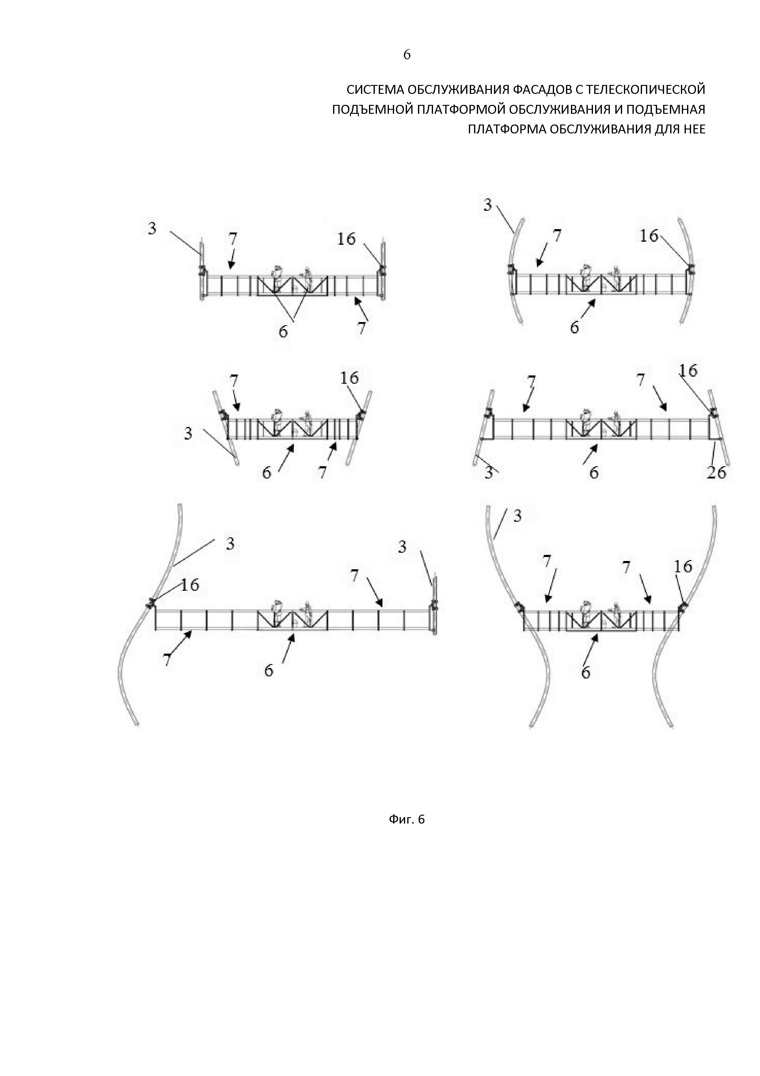 В другом варианте осуществления изобретения платформа также может быть выполнена одноуровневой, но с размещением телескопических 7 секций с двух торцевых сторон основной 6 секции, с обеспечением возможности перемещения телескопических секций относительно основной по обеим торцевым сторонам независимо друг от друга (фиг.3). Причем концевые секции соединены со смежными фасадными направляющими 3. Причем, наиболее предпочтительным вариантом осуществления данного решения является представленный на фиг.3, где платформа выполнена одноуровневой, с зеркальным расположением телескопических 7 секций относительно линейно соединенных между собой двух основных секций 6.